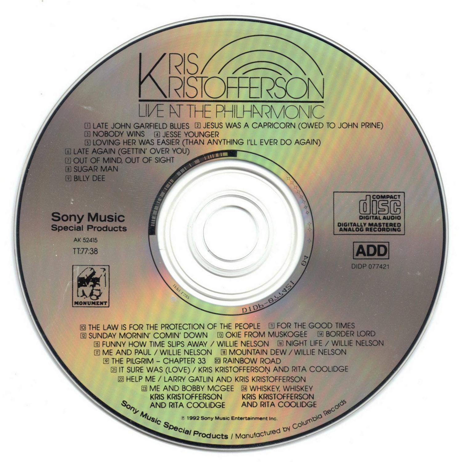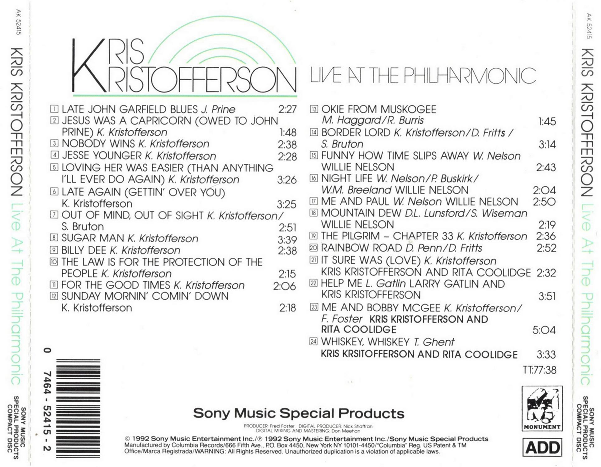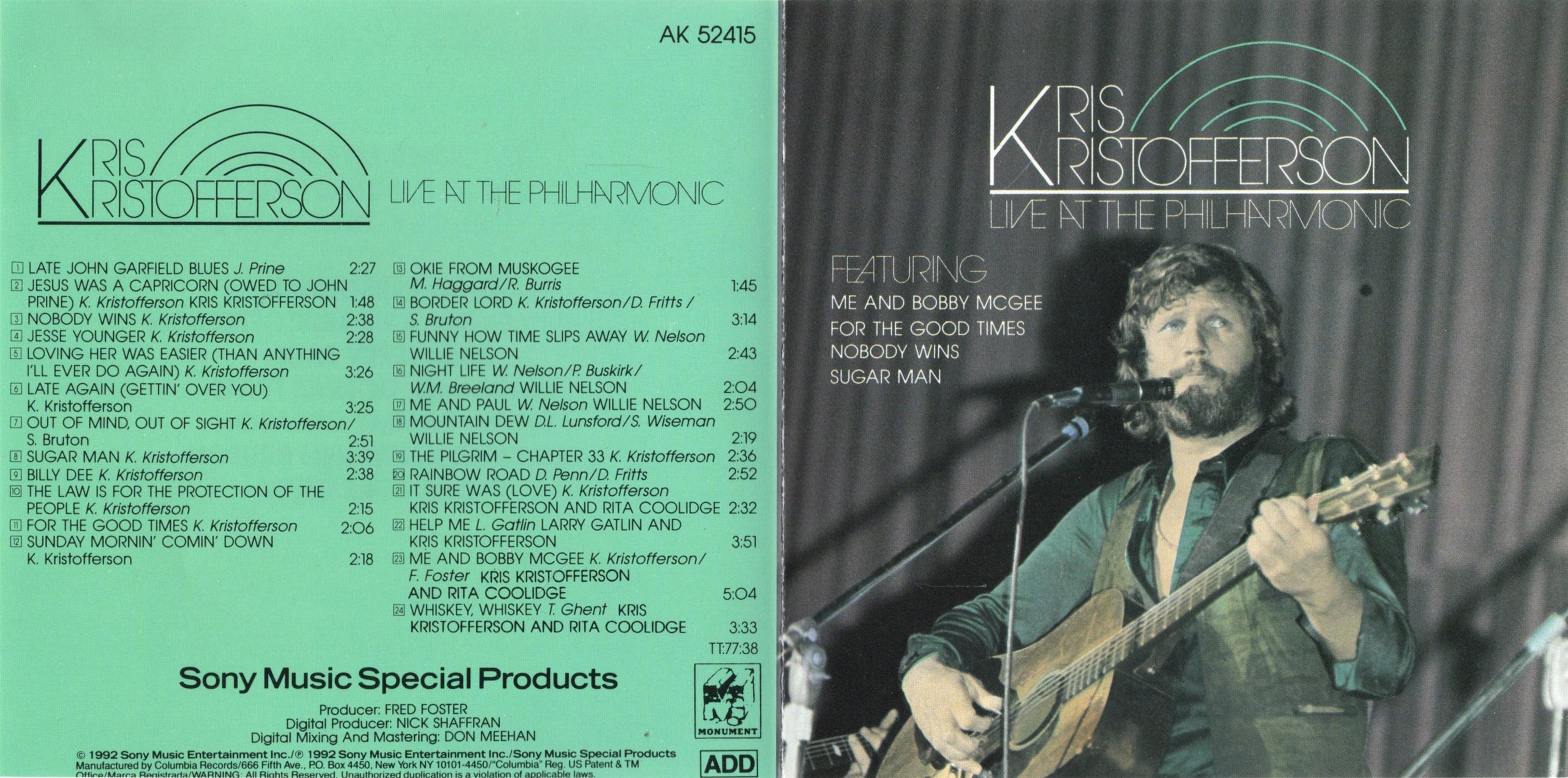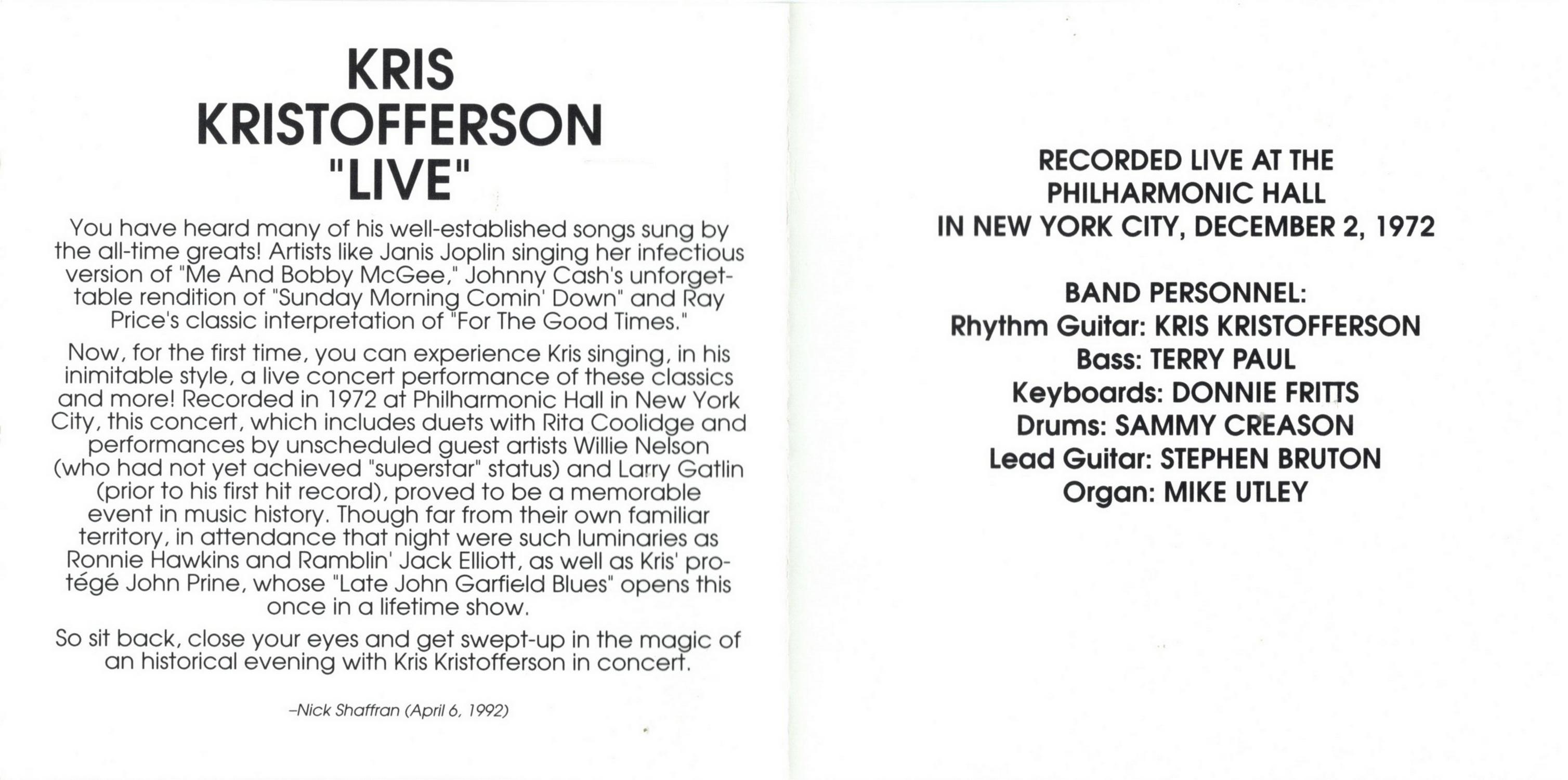 Now, for the first time, you can experience Kris singing, in his inimitable style, a live concert performance of these classics and more! Recorded in 1972 at Philharmonic Hall in New York City, this concert, which includes duets with Rita Coolidge and performances by unscheduled guest artists Willie Nelson (who had not yet achieved "superstar" status) and Larry Gatlin (prior to his first hit record), proved to be a memorable event in music history. Though far from their own familiar territory, in attendance that night were such luminaries as Ronnie Hawkins and Ramblin' Jack Elliott, as well as Kris' protêgé John Prine, whose "Late John Garfield Blues" opens this once in a lifetime show.