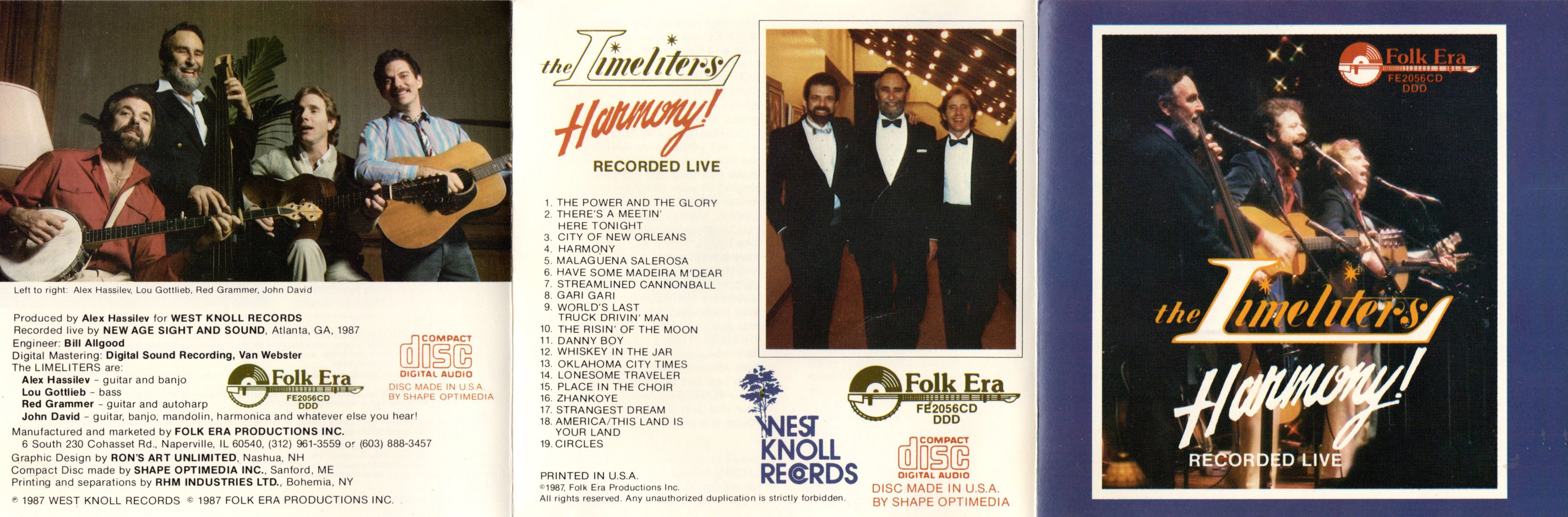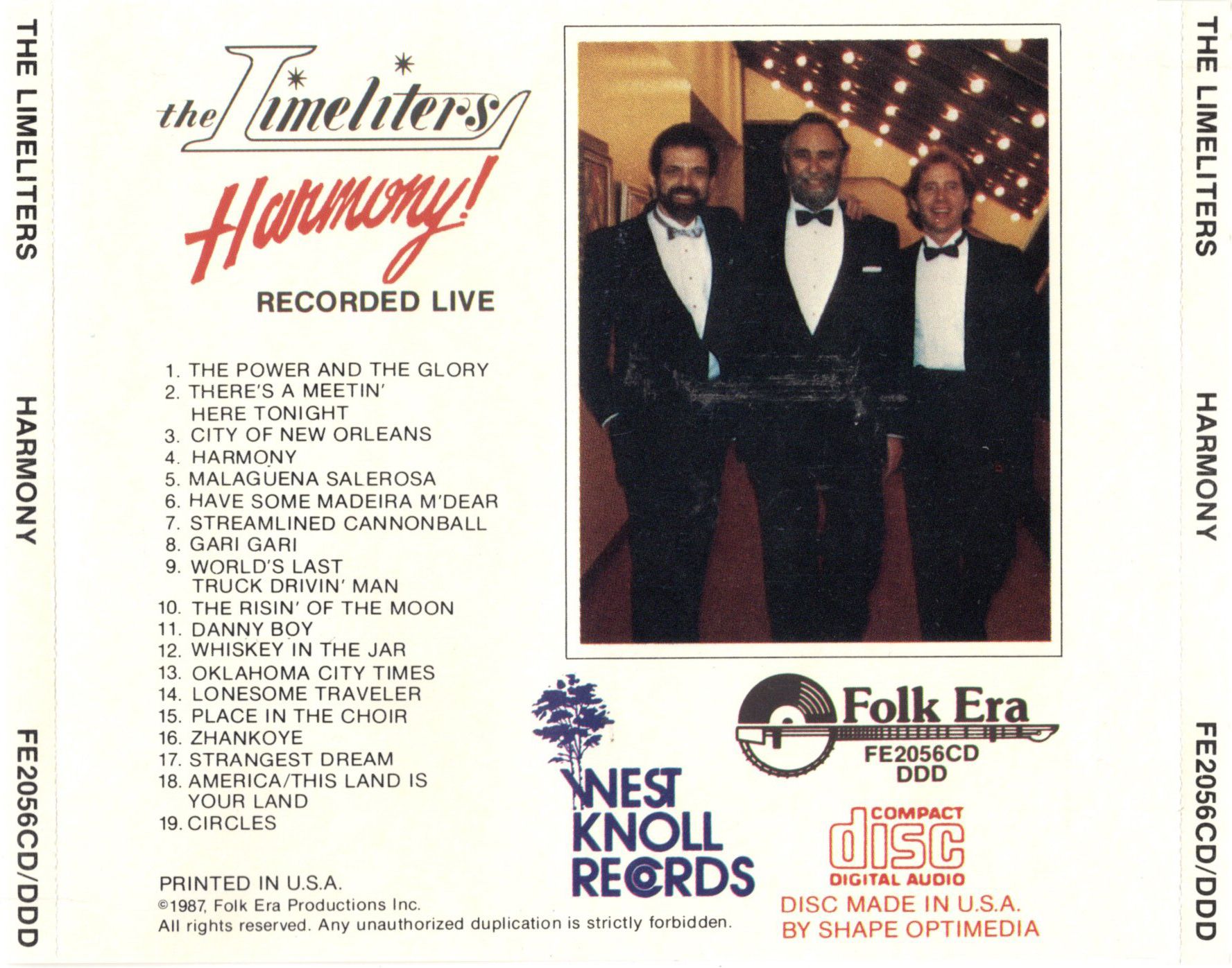 The LIMELITERS formed their own record company — WEST KNOLL RECORDS — and released a live double-album set in 1986 which was met with critical acclaim. Now they are releasing their first all-digital compact disc on FOLK ERA, and HARMONY! shows this awesome group at its very best. Recorded on a 24-track digital recorder, this recording is sure to be your favorite LIMELITERS album if you're an old fan; and if this is your first exposure to this great group, you'll be hooked for certain! These songs show the LIMELITERS at their very best. PLACE IN THE CHOIR is a sing-along that really gets your feet tapping, the IRISH MEDLEY will really make you stop and think, while Red's incredible rendition of DANNY BOY and their version of Phil Ochs' great song THE POWER AND THE GLORY will make you proud to be an American! STREAMLINED CANNONBALL will rock you off your feet and the title track, HARMONY, will make you wish you were still singing in your choir. Lou's hysterical WORLD'S LAST TRUCK-DRIVIN' MAN is bound to make you laugh until your sides hurt. The LIMELITERS' best albums have always been recorded live, and with good reason — their rapport with their audiences is legendary. HARMONY! could be their best effort ever! Everything that you've come to expect from the LIMELITERS is here; great harmonies, excellent instrumentation, amusing tunes, great humor from Lou and an overall show that will make you want to hear it over and over again. Fortunately, you're in a position to do just that.