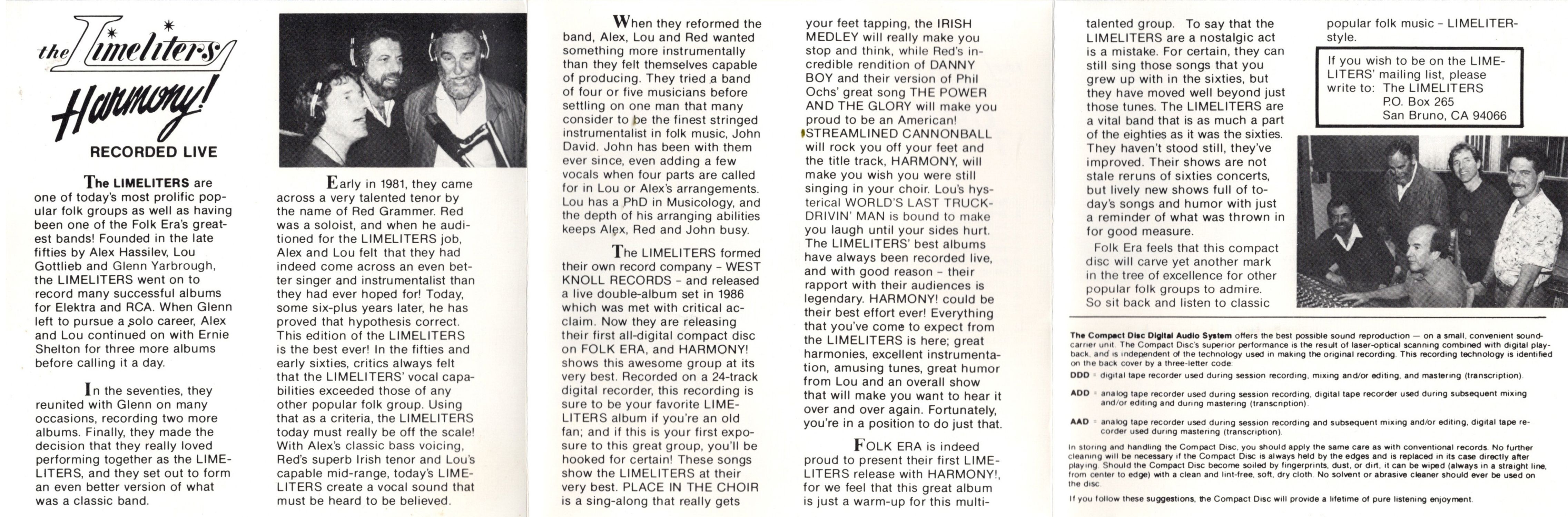 FOLK ERA is indeed proud to present their first LIMELITERS release with HARMONY!, for we feel that this great album is just a warm-up for this multitalented group. To say that the LIMELITERS are a nostalgic act is a mistake. For certain, they can still sing those songs that you grew up with in the sixties, but they have moved well beyond just those tunes. The LIMELITERS are a vital band that is as much a part of the eighties as it was the sixties. They haven't stood still, they've improved. Their shows are not stale reruns of sixties concerts, but lively new shows full of today's songs and humor with just a reminder of what was thrown in for good measure.