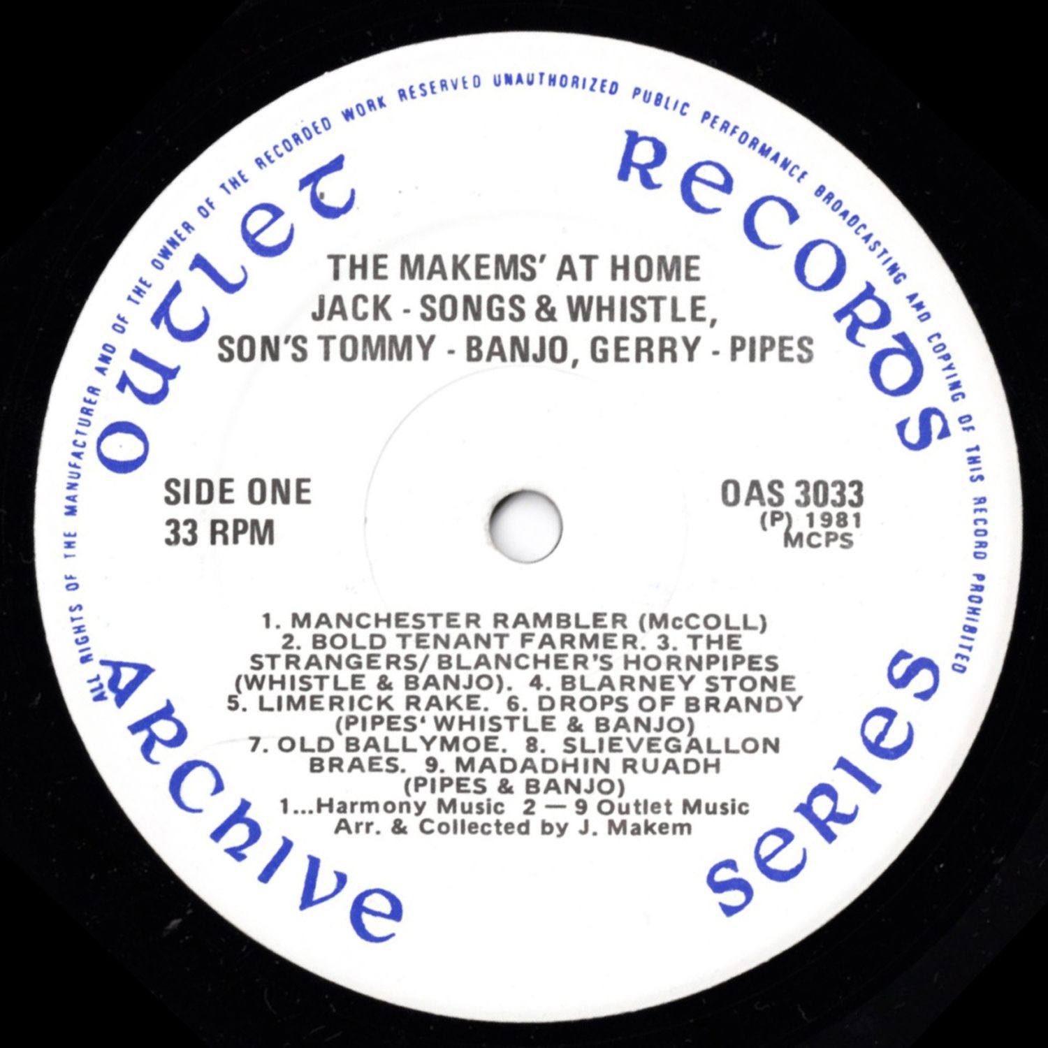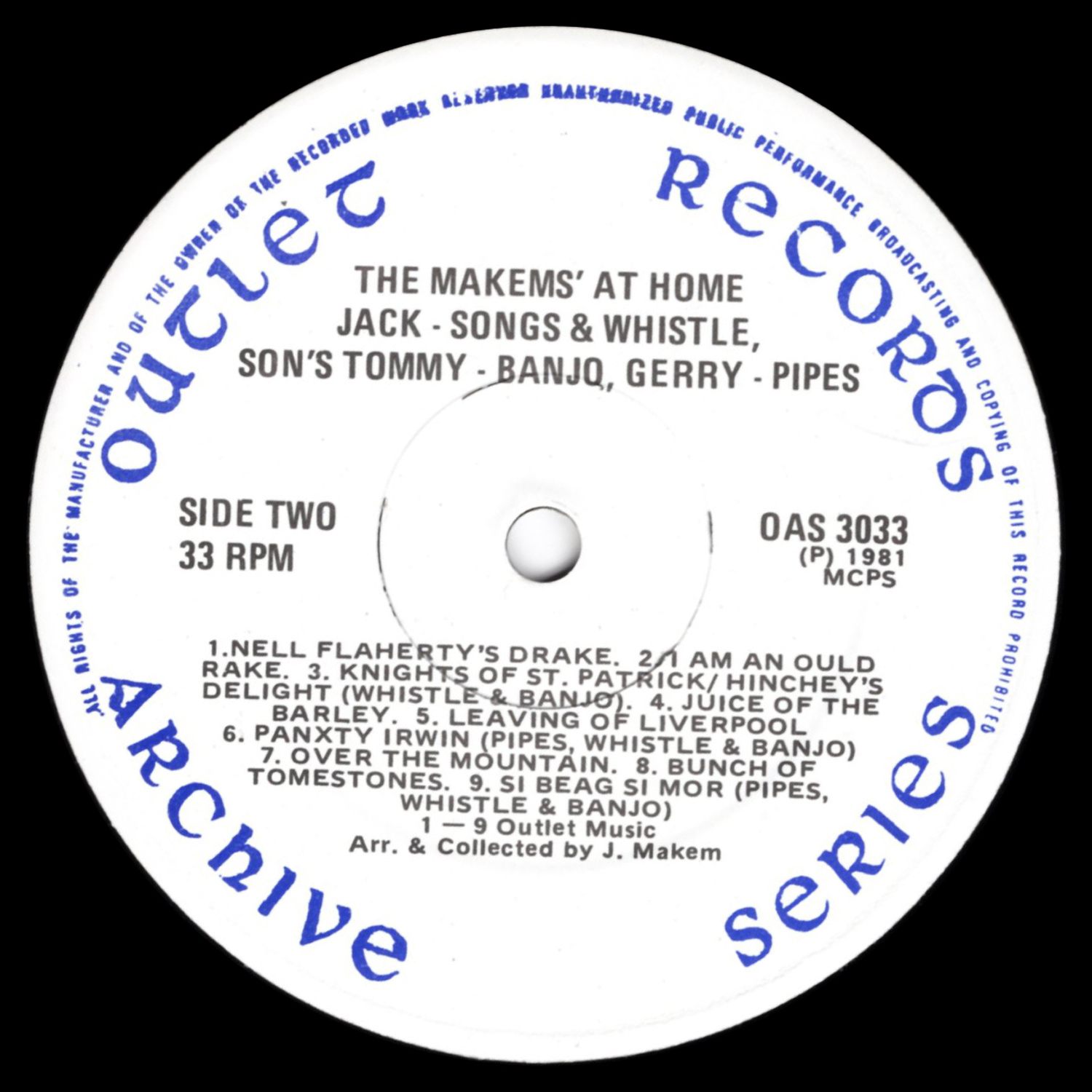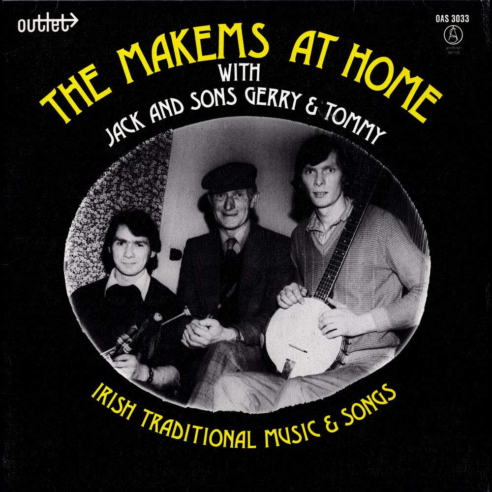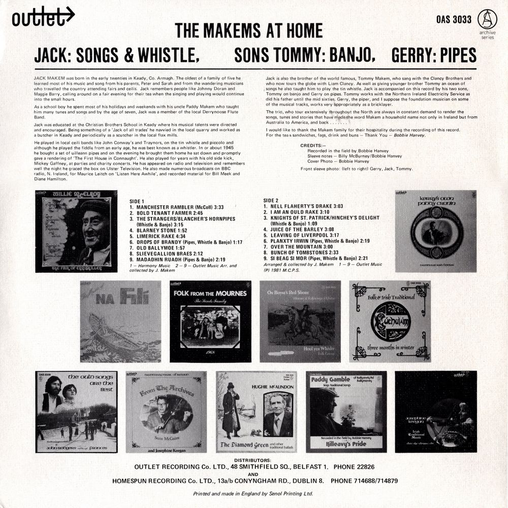 Jack is also the brother of the world famous, Tommy Makem, who sang with the Clancy Brothers and who now tours the globe with Liam Clancy. As well as giving younger brother Tommy an ocean of songs he also taught him to play the tin whistle. Jack is accompanied on this record by his two sons, Tommy on banjo and Gerry on pipes. Tommy works with the Northern Ireland Electricity Service as did his father until the mid sixties. Gerry, the piper, and I suppose the foundation musician on some of the musical tracks, works very appropriately as a bricklayer.