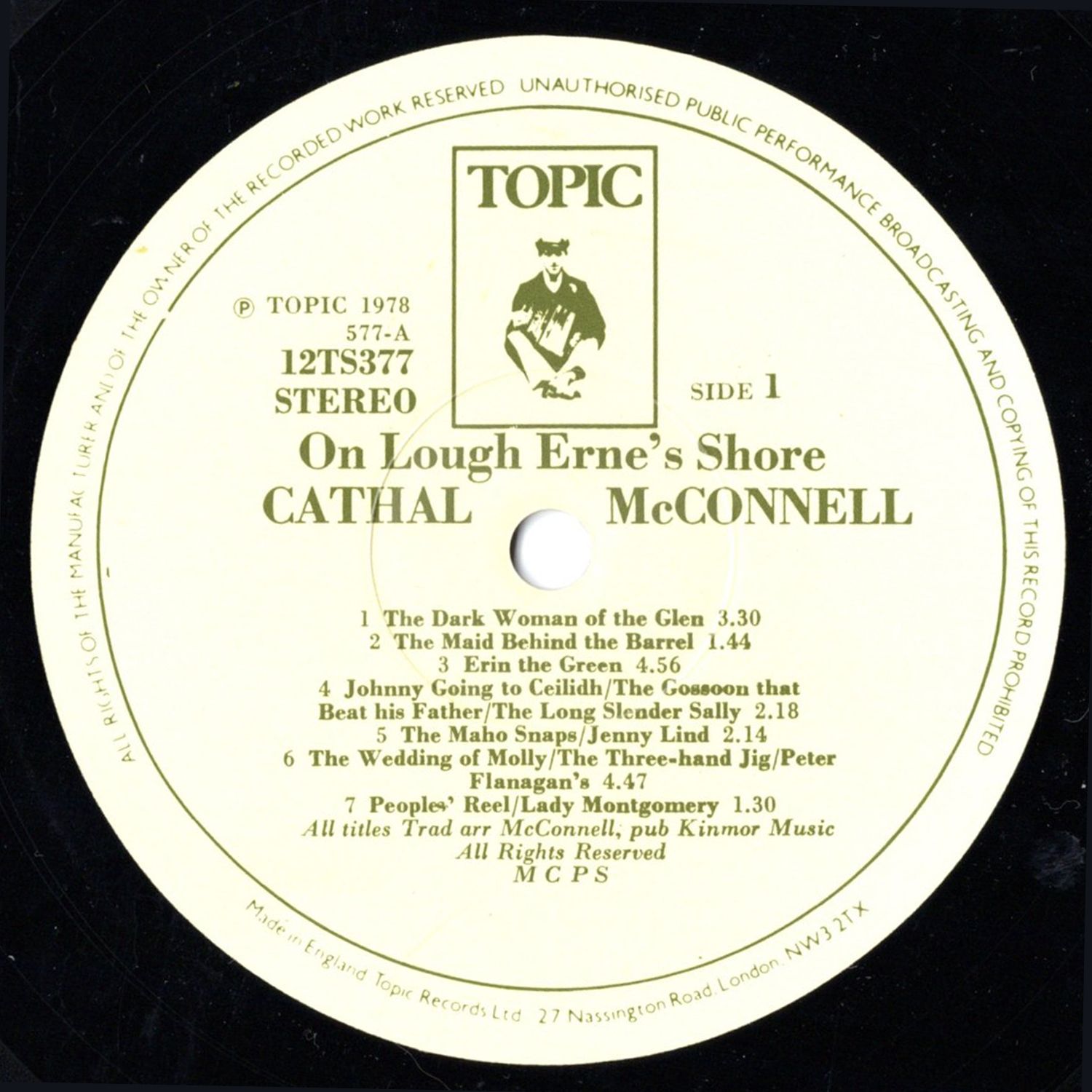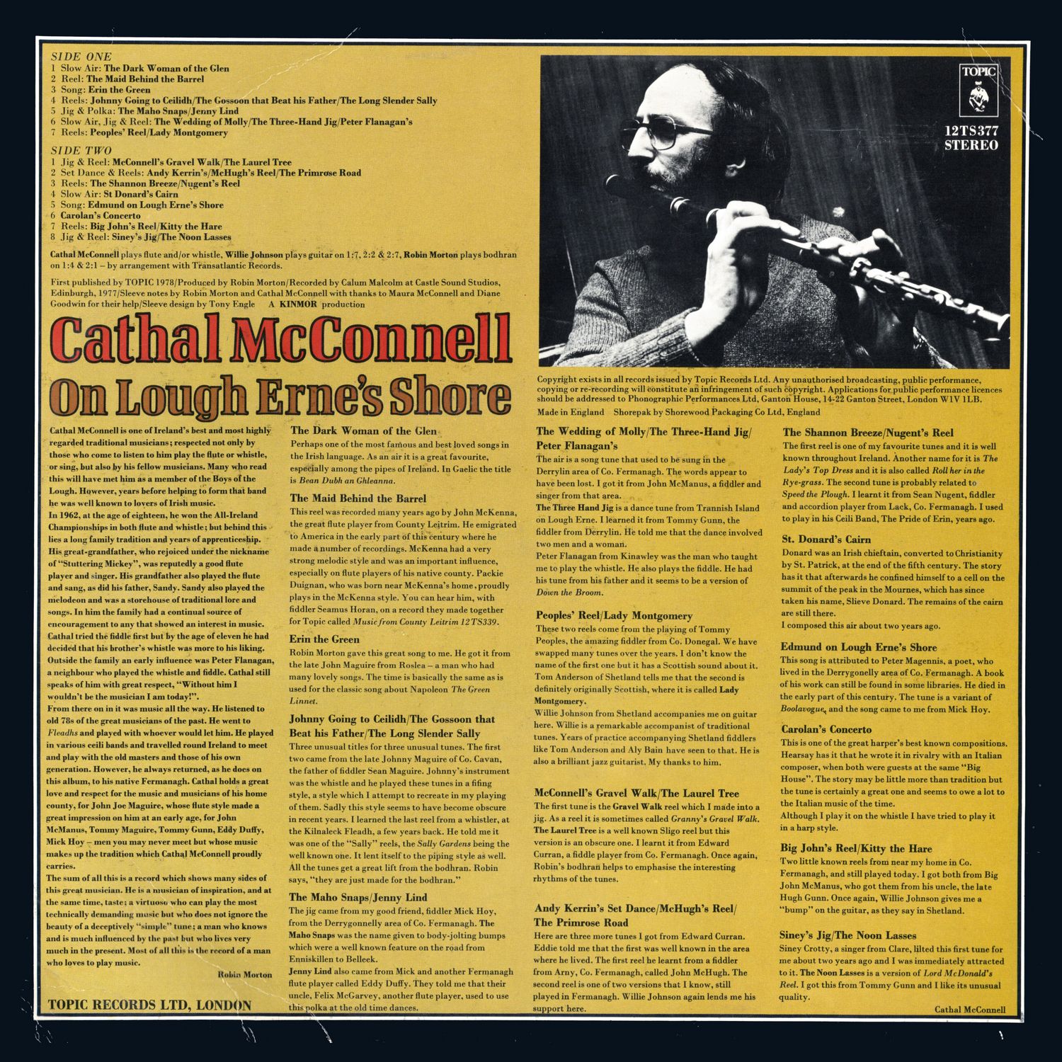 From there on in it was music all the way. He listened to old 78s of the great musicians of the past. He went to Fleadhs and played with whoever would let him. He played in various ceili bands and travelled round Ireland to meet and play with the old masters and those of his own generation. However, he always returned, as he does on this album, to his native Fermanagh. Cathal holds a great love and respect for the music and musicians of his home county, for John Joe Maguire, whose flute style made a great impression on him at an early age, for John McManus, Tommy Maguire, Tommy Gunn, Eddy Duffy, Mick Hoy — men you may never meet but whose music makes up the tradition which Cathal McConnell proudly carries.