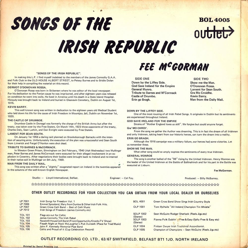 In making this L.P. I find myself indebted to the members of the James Connolly G.A.A. and Folk Club in the Old House Albert Street, to Petesy Burnes and to Bridie Dolan for their help in compiling the material on this record.