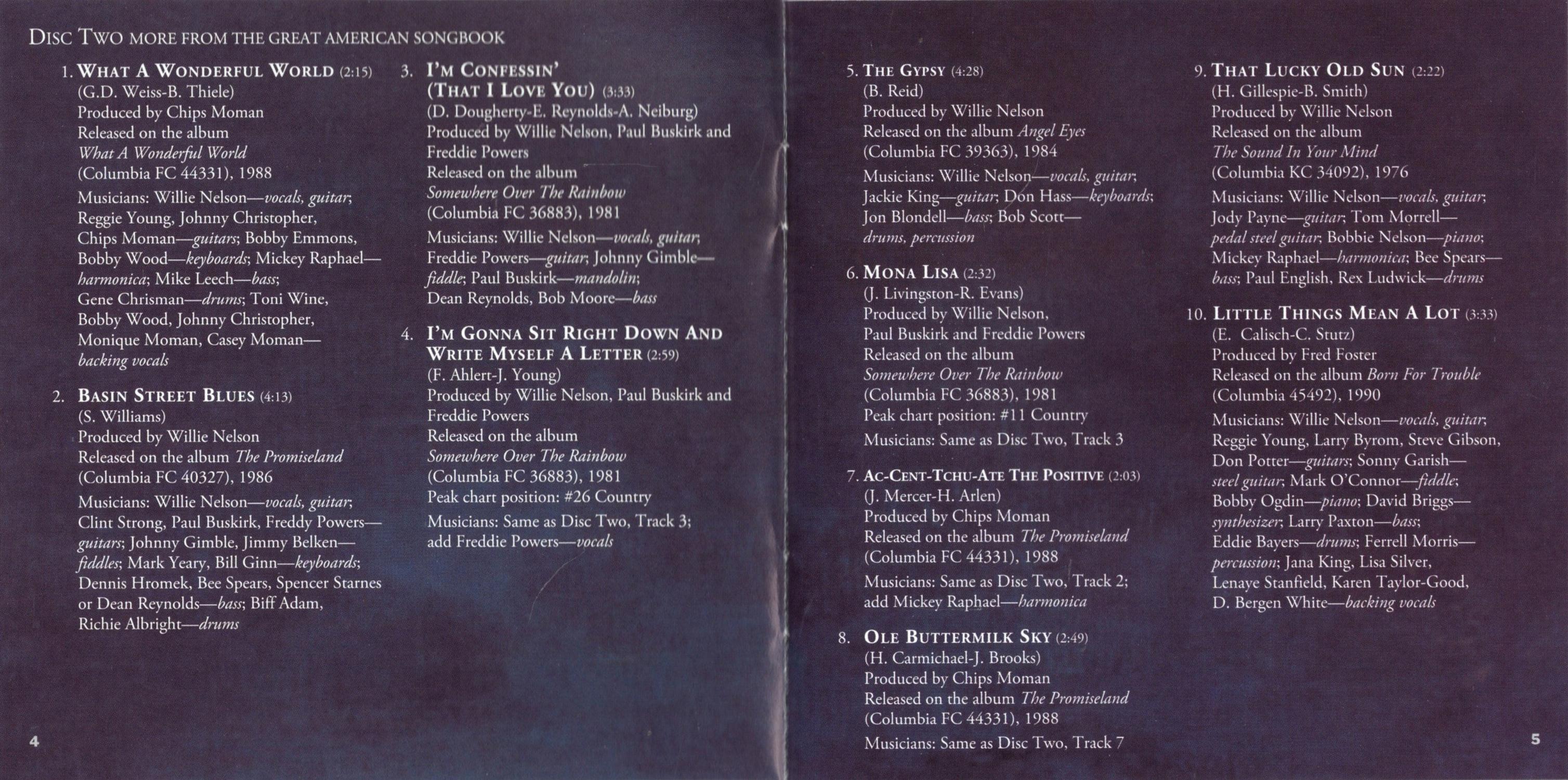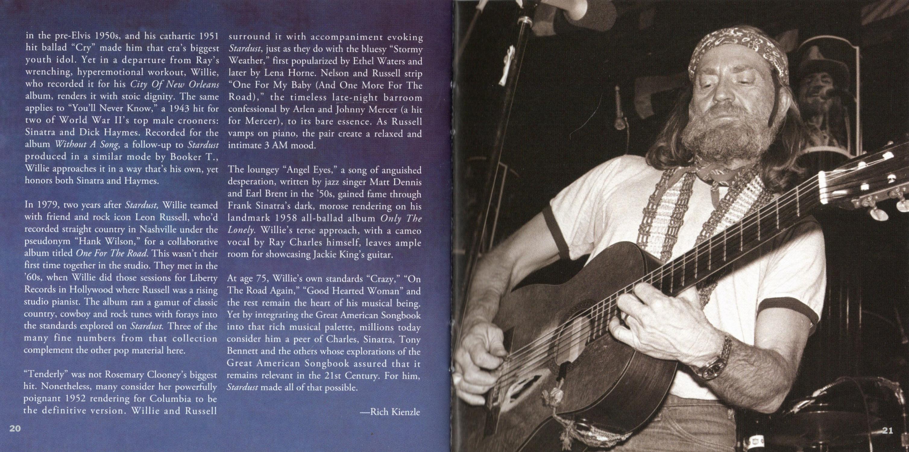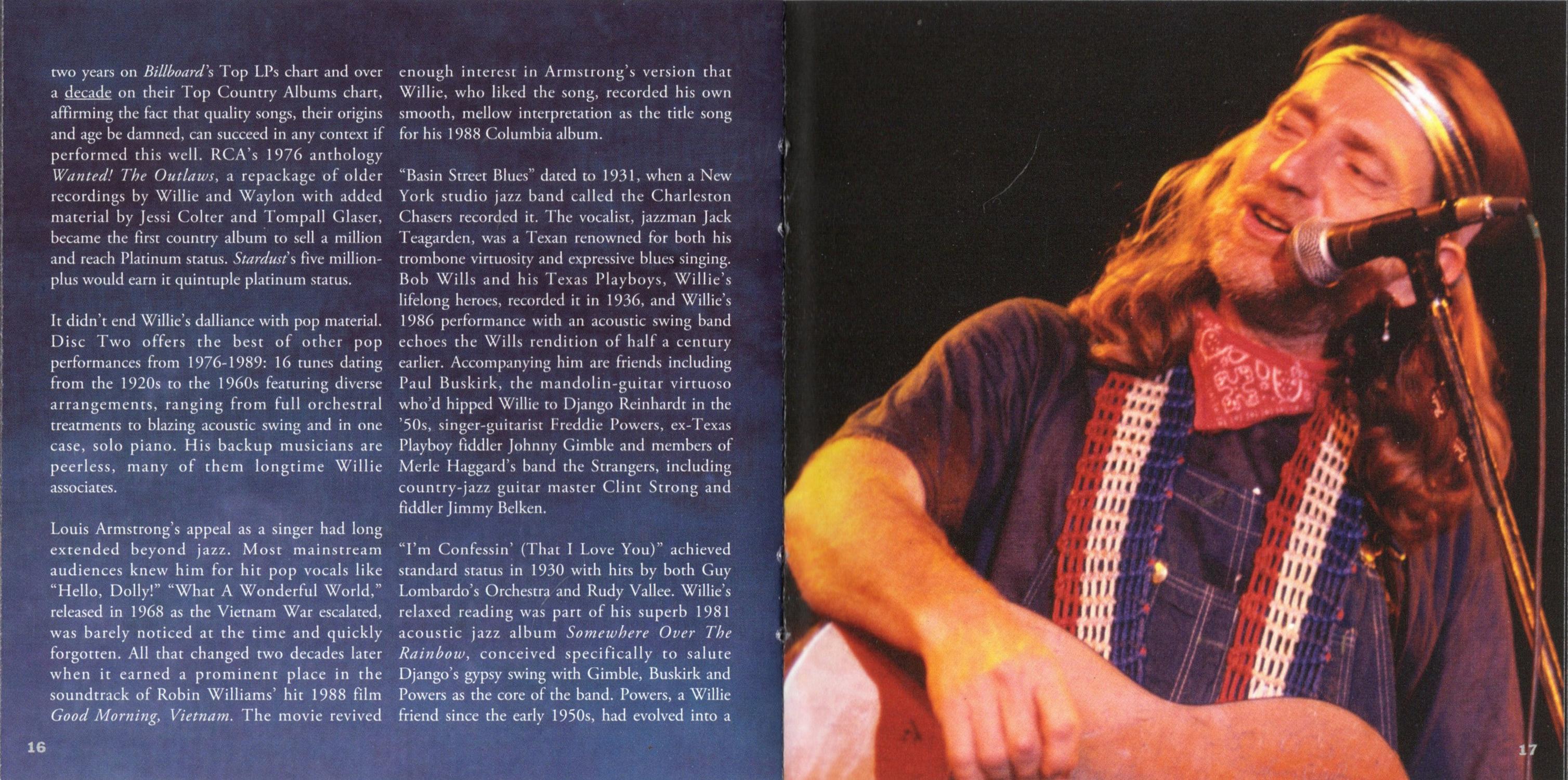 It didn't end Willie's dalliance with pop material. Disc Two offers the best of other pop performances from 1976-1989: 16 tunes dating from the 1920s to the 1960s featuring diverse arrangements, ranging from full orchestral treatments to blazing acoustic swing and in one case, solo piano. His backup musicians are peerless, many of them longtime Willie associates.