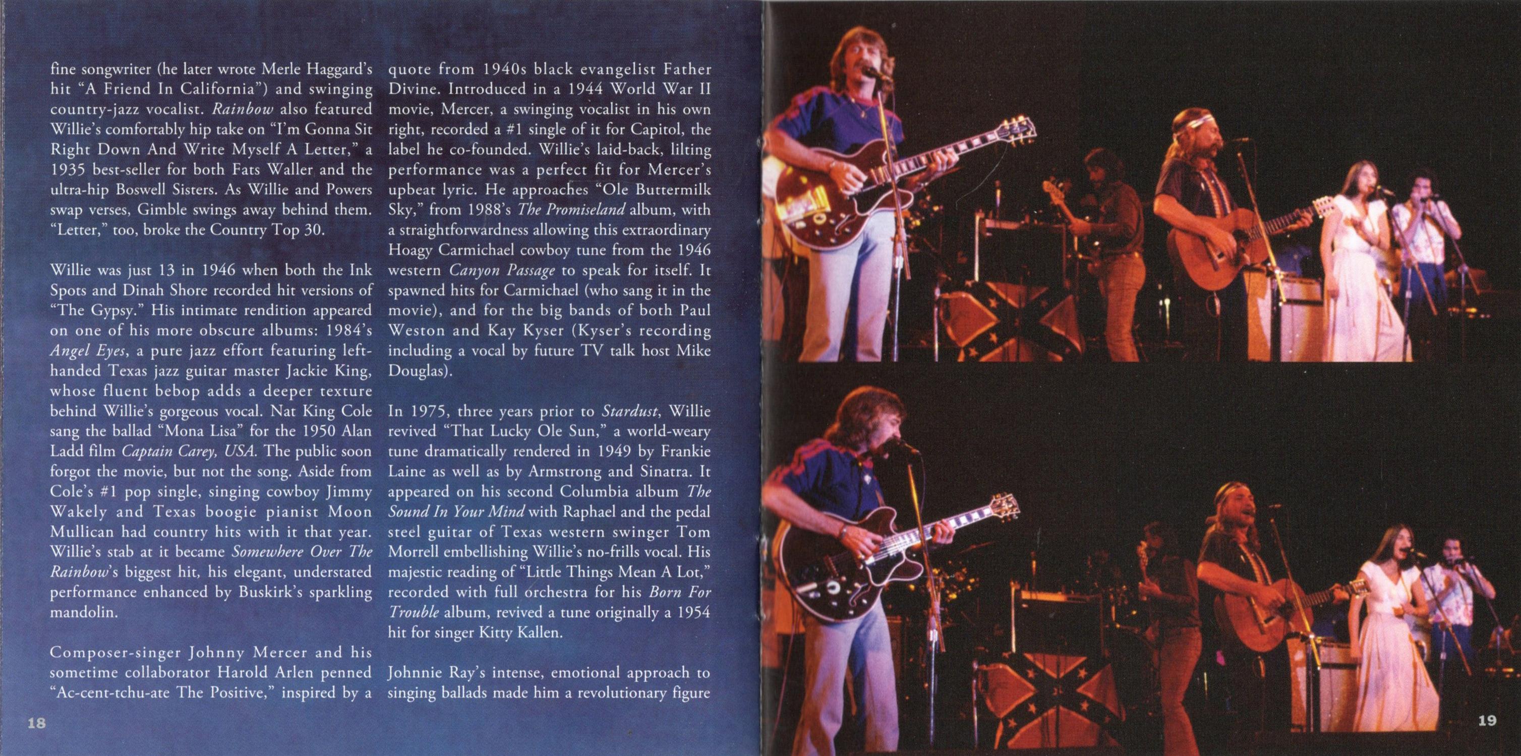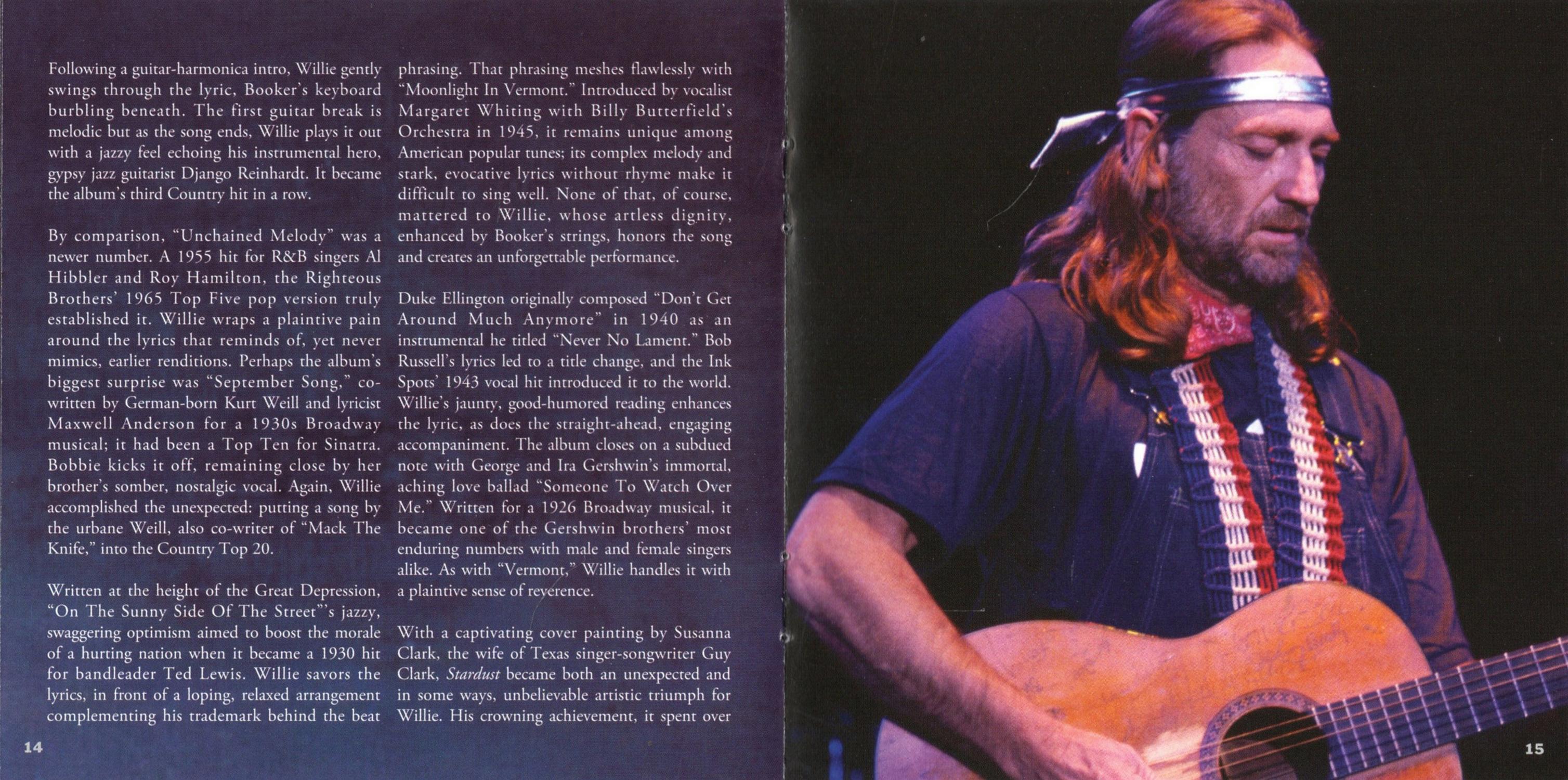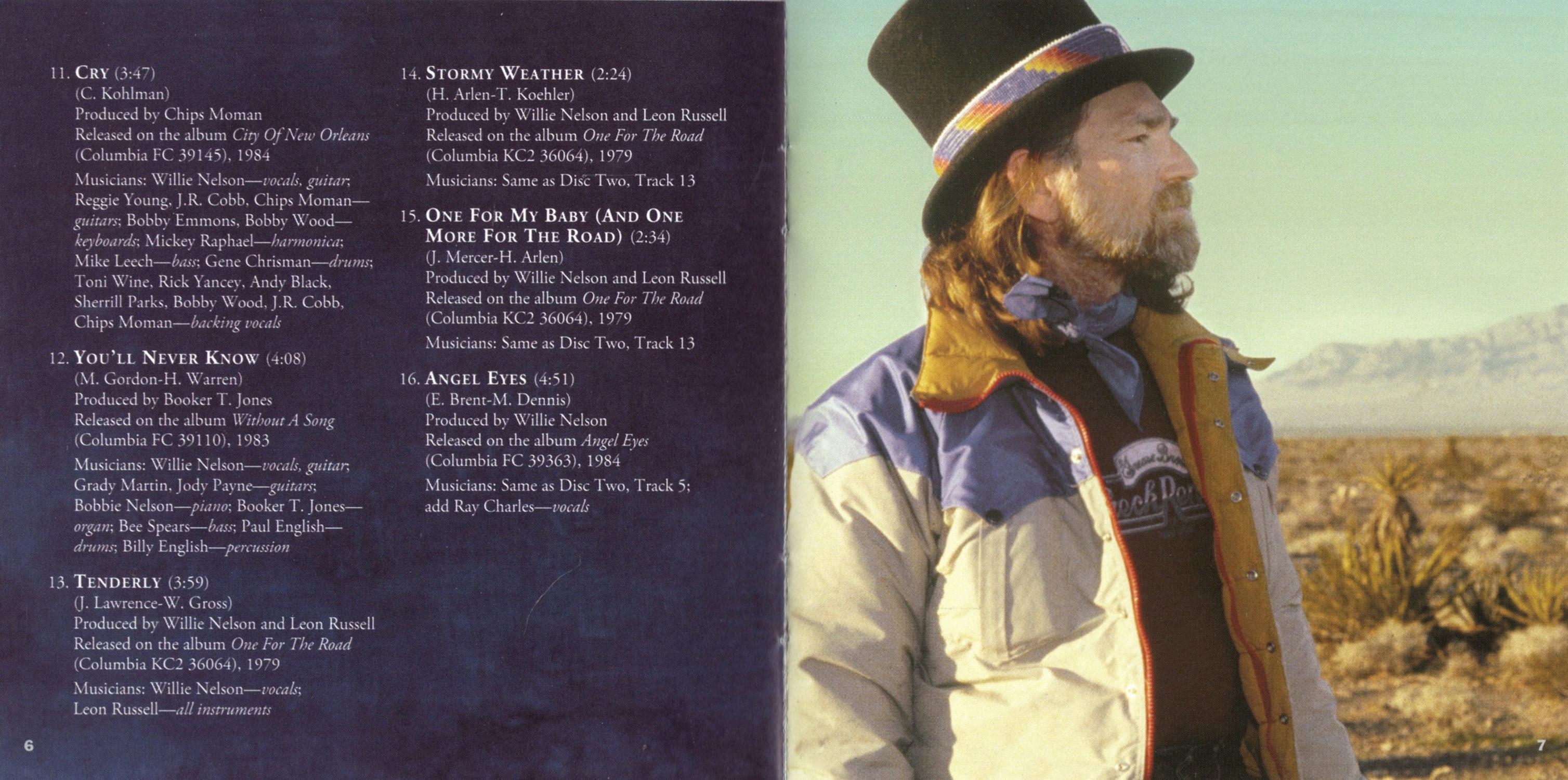 It didn't end Willie's dalliance with pop material. Disc Two offers the best of other pop performances from 1976-1989: 16 tunes dating from the 1920s to the 1960s featuring diverse arrangements, ranging from full orchestral treatments to blazing acoustic swing and in one case, solo piano. His backup musicians are peerless, many of them longtime Willie associates.