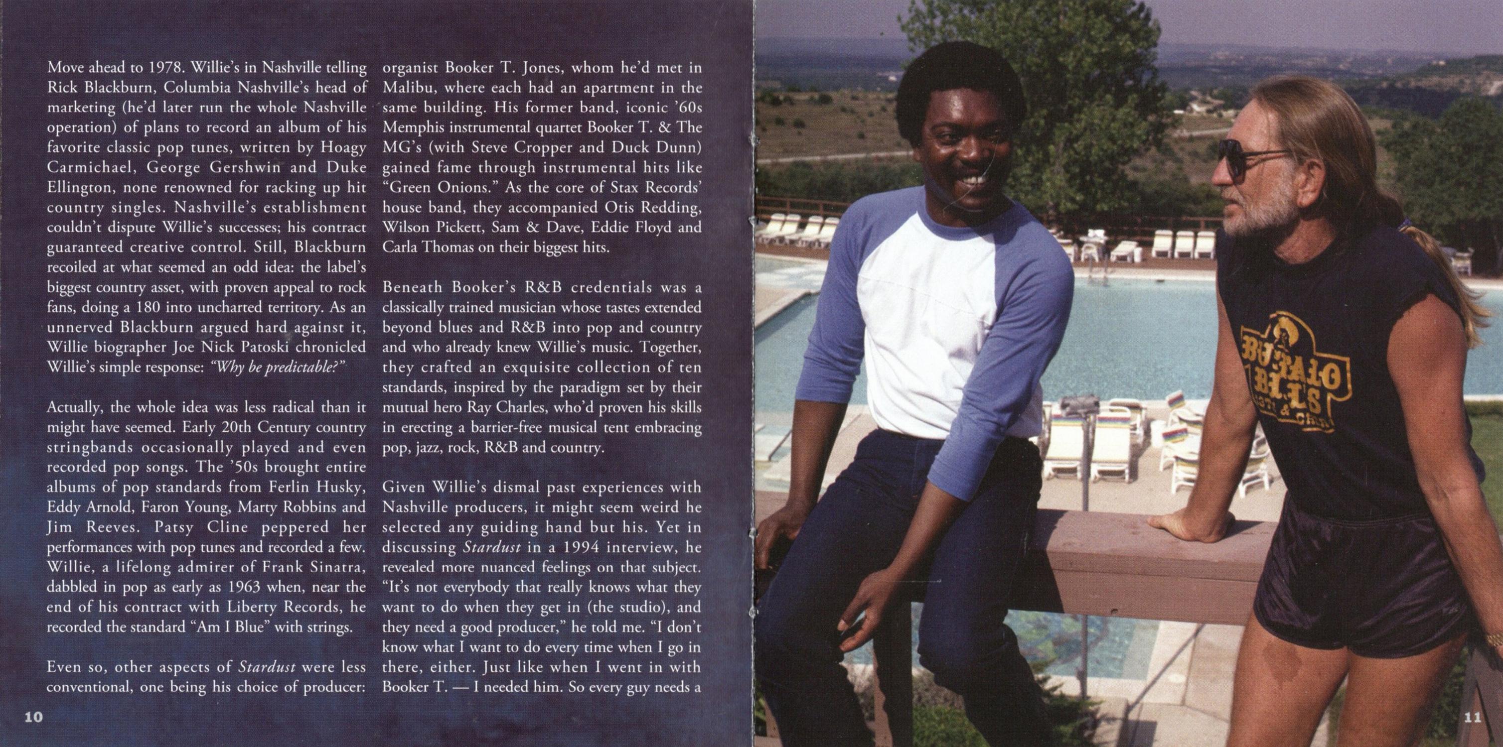 Given Willie's dismal past experiences with Nashville producers, it might seem weird he selected any guiding hand but his. Yet in discussing Stardust in a 1994 interview, he revealed more nuanced feelings on that subject. "It's not everybody that really knows what they want to do when they get in (the studio), and they need a good producer," he told me. "I don't know what I want to do every time when I go in there, either. Just like when I went in with Booker T. &mash; I needed him. So every guy needs a producer sometimes," he added. "But sometimes, he knows what he wants to do and he should have the freedom to go in and do it. I think a producer most of the time knows when an artist has the ability to do that, and a good producer will let him do it and then jump in there and take credit for it."