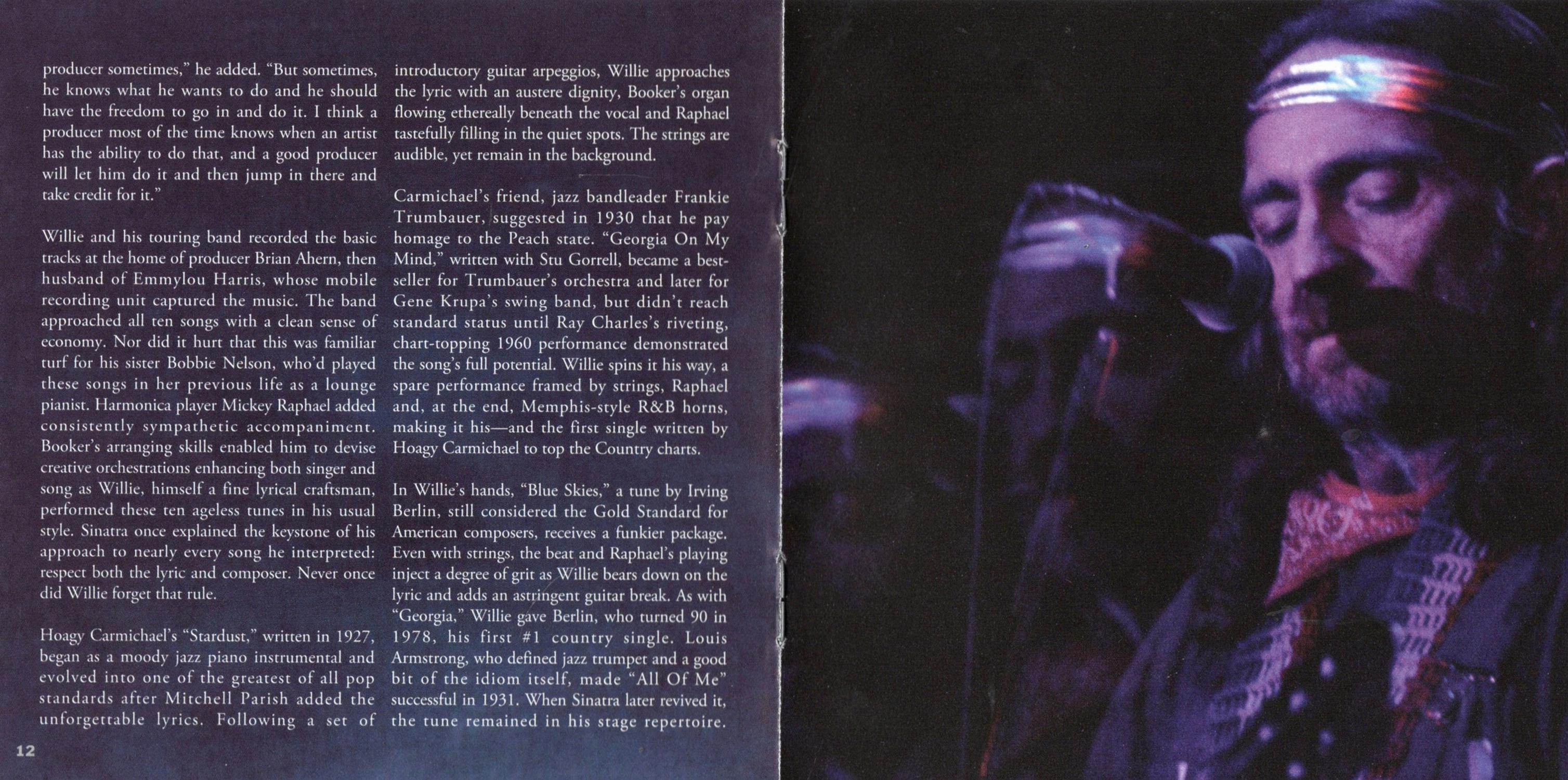 Willie and his touring band recorded the basic tracks at the home of producer Brian Ahern, then husband of Emmylou Harris, whose mobile recording unit captured the music. The band approached all ten songs with a clean sense of economy. Nor did it hurt that this was familiar turf for his sister Bobbie Nelson, who'd played these songs in her previous life as a lounge pianist. Harmonica player Mickey Raphael added consistently sympathetic accompaniment. Booker's arranging skills enabled him to devise creative orchestrations enhancing both singer and song as Willie, himself a fine lyrical craftsman, performed these ten ageless tunes in his usual style. Sinatra once explained the keystone of his approach to nearly every song he interpreted: respect both the lyric and composer. Never once did Willie forget that rule.