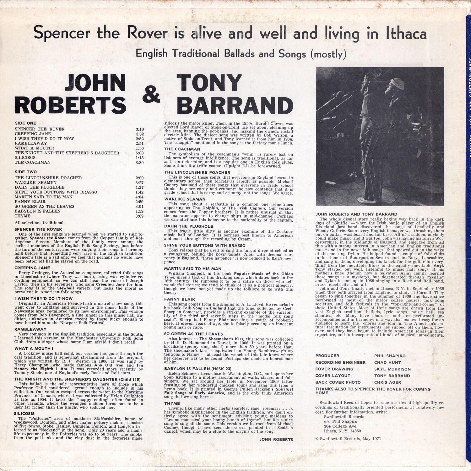 John and Tony finally met in Ithaca, N.Y. in September 1968 when they both arrived from England to study at Cornell. They began to sing together in the summer of 1969 and have since performed at most of the major coffee houses, folk song societies, and folk festivals in the "top-right-hand-corner" of these United States. Most of their songs are drawn from the vast English tradition: ballads, lyric songs, music hall, sea shanties, etc. Many have choruses and are performed unaccompanied and in harmony, in a way that makes it easy for an audience to learn the chorus and join in. The American's natural fascination for instruments has rubbed off on them, however, and they have begun to include American songs in their repertoire, and to incorporate all kinds of musical impedimenta.