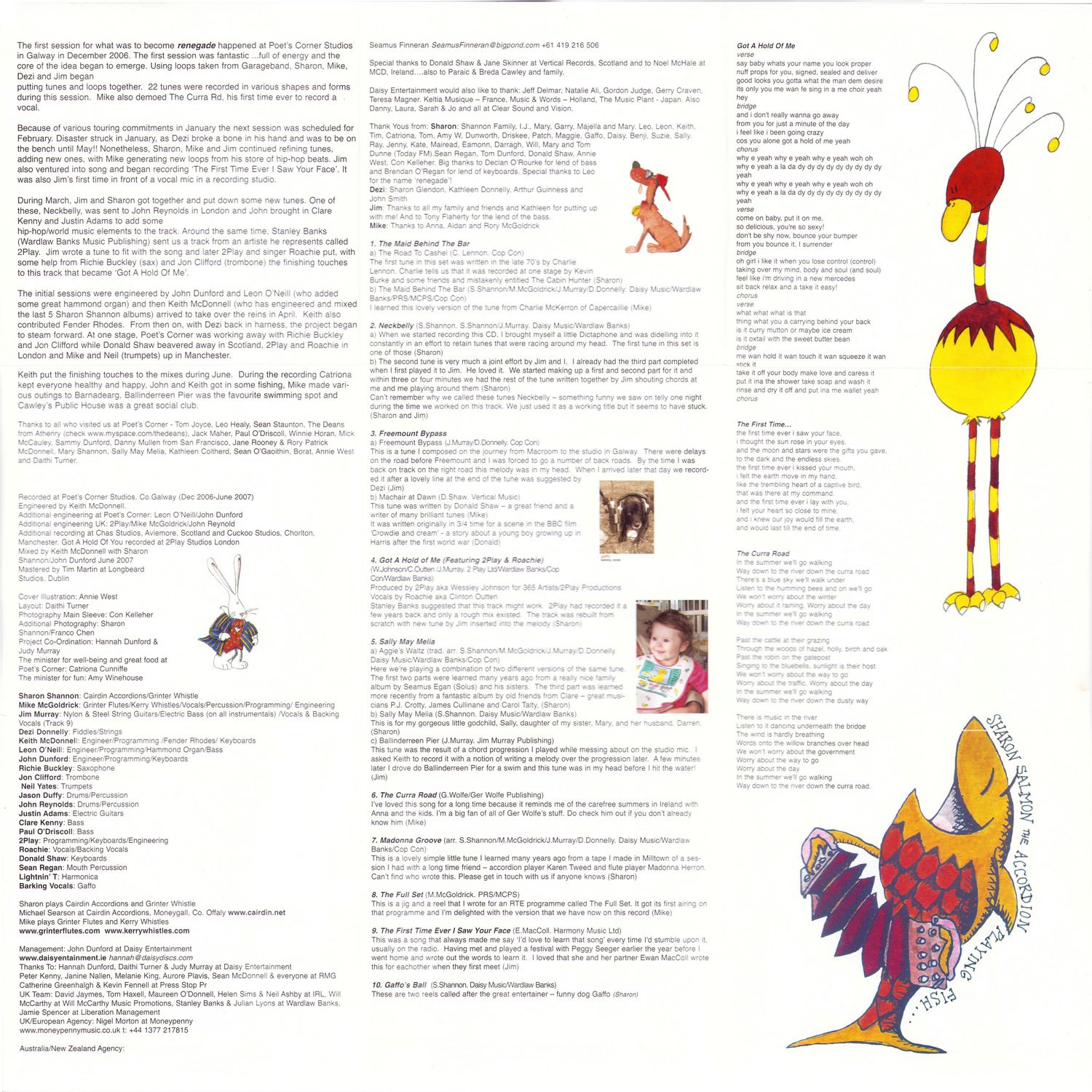 The first session for what was to become renegade happened at Poet's Corner Studios in Galway in December 2006. The first session was fantastic … full of energy and the core of the idea began to emerge. Using loops taken from Garageband, Sharon, Mike, Dezi and Jim began putting tunes and loops together. 22 tunes were recorded in various shapes and forms during this session. Mike also demoed The Curra Rd, his first time ever to record a vocal.