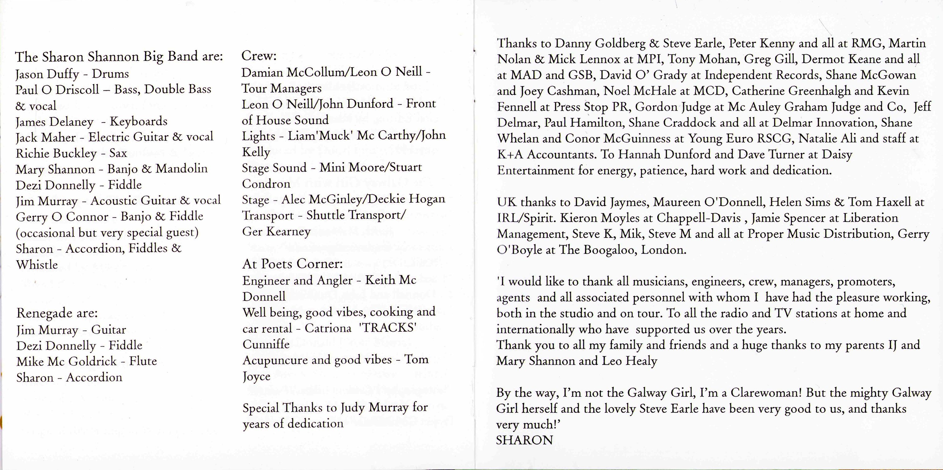 Thanks to Danny Goldberg & Steve Earle, Peter Kenny and all at RMG, Martin Nolan & Mick Lennox at MPI, Tony Mohan, Greg Gill, Dermot Keane and all at MAD and GSB, David O’ Grady at Independent Records, Shane McGowan and Joey Cashman, Noel McHale at MCD, Catherine Greenhalgh and Kevin Fennell at Press Stop PR, Gordon Judge at Mc Auley Graham Judge and Co, Jeff Delmar, Paul Hamilton, Shane Craddock and all at Delmar Innovation, Shane Whelan and Conor McGuinness at Young Euro RSCG, Natalie Ali and staff at K+A Accountants. To Hannah Dunford and Dave Turner at Daisy Entertainment for energy, patience, hard work and dedication.