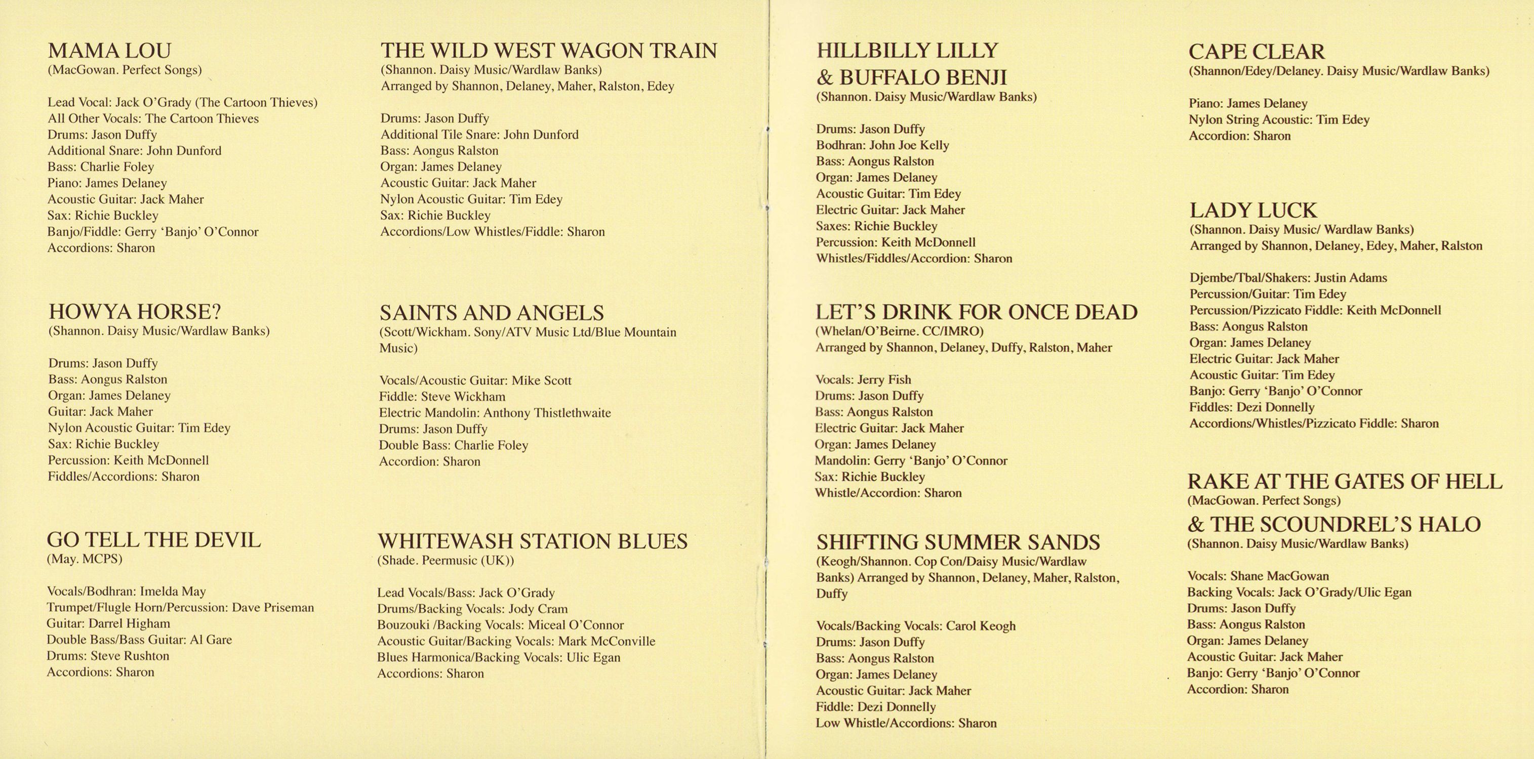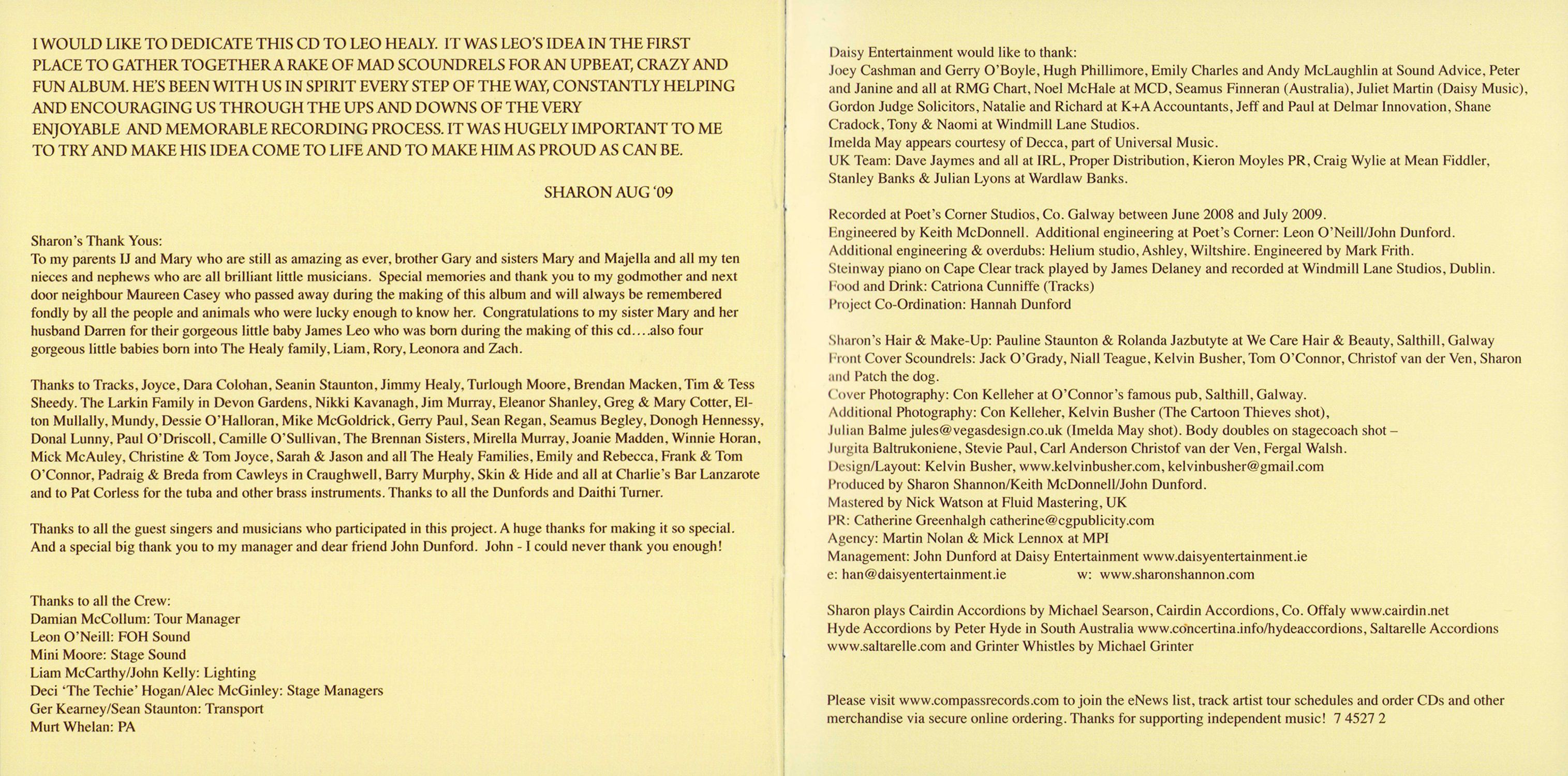 I would like to dedicate this CD to Leo Healy. It was Leo's idea in the first place to gather together a rake of mad scoundrels for an upbeat, crazy and fun album. He's been with us in spirit every step of the way, constantly helping and encouraging us through the ups and downs of the very enjoyable and memorable recording process. It was hugely important to me to try and make his idea come to life and to make him as proud as can be.