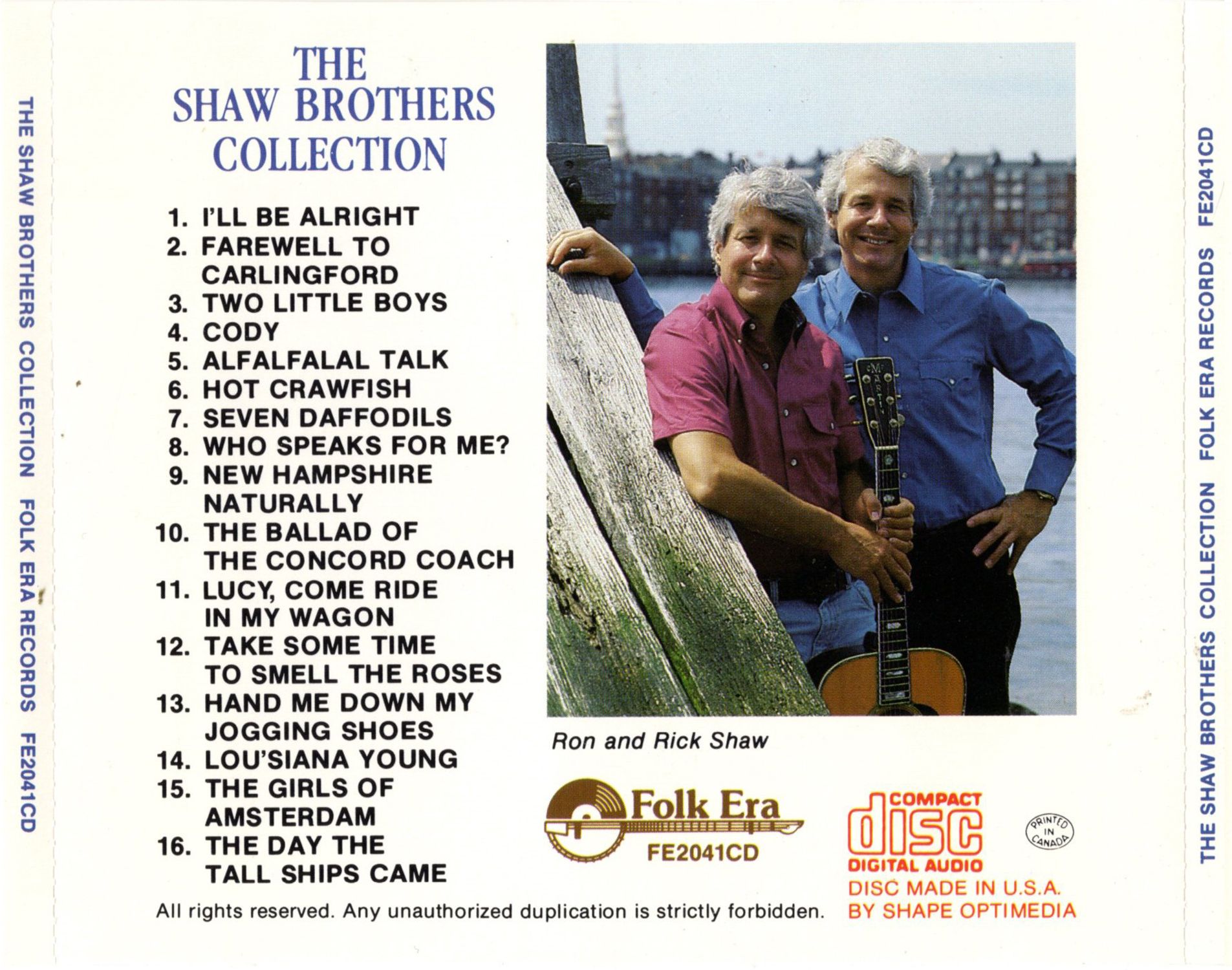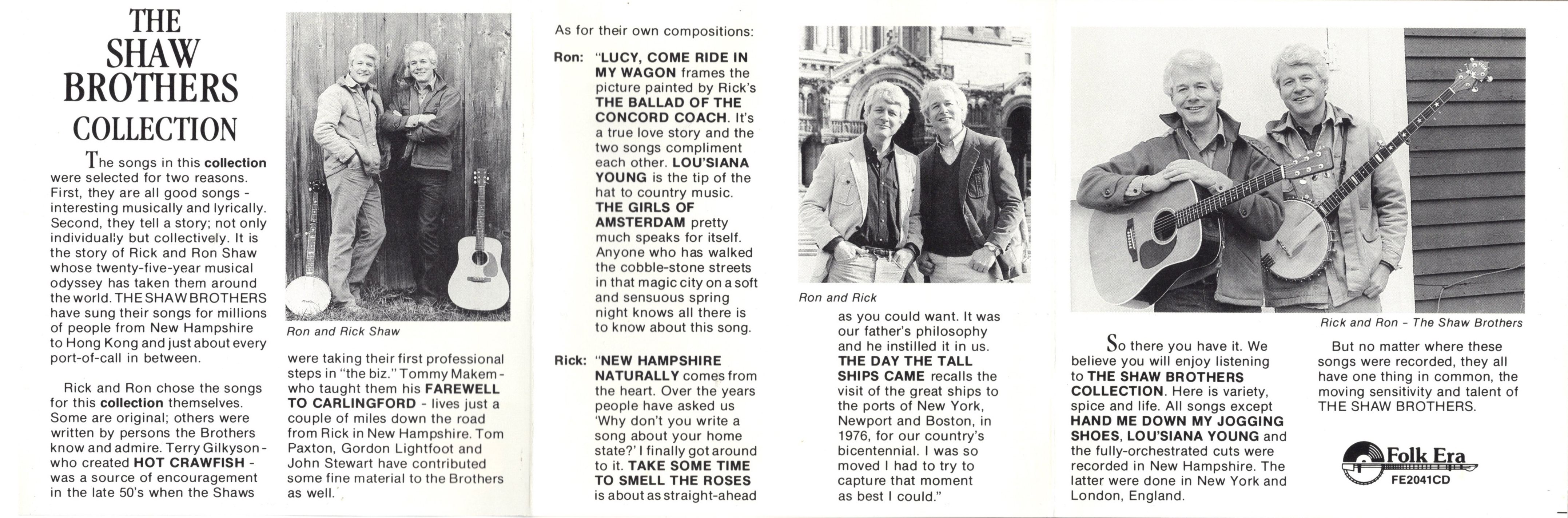 Rick and Ron chose the songs for this collection themselves. Some are original; others were written by persons the Brothers know and admire. Terry Gilkyson — who created "Hot Crawfish" — was a source of encouragement in the late 50's when the Shaws were taking their first professional steps in the biz. Tommy Makem — who taught them his "Farewell To Carlingford" — lives just a couple of miles down the road from Rick in New Hampshire. Tom Paxton, Gordon Lightfoot and John Stewart have contributed some fine material to the Brothers as well. As for their own compositions: