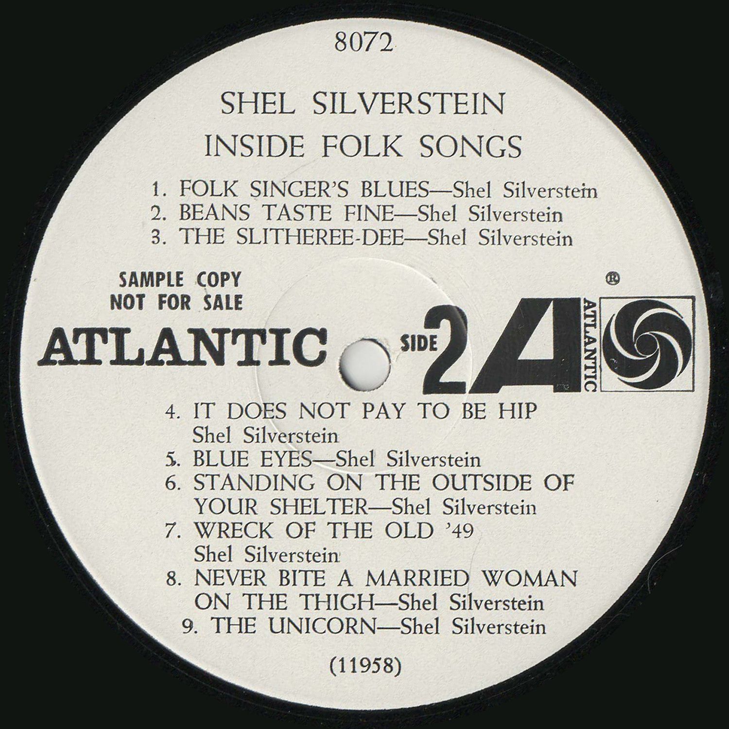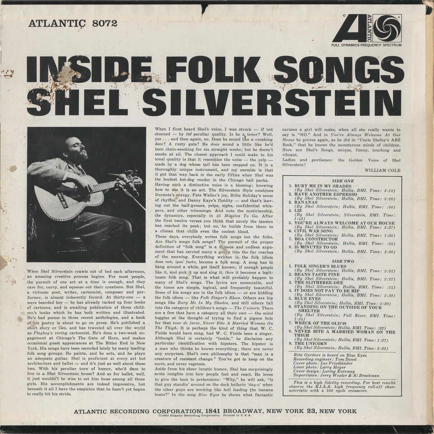 Aside from his sheer lunatic humor, Shel has surprisingly acute insights into how people feel and react. He loves to give the boot to pretensions: "Why," he will ask, "is that guy standin' around on the dock hollerin 'day-o' when the other guys are working like hell loading the banana boats?" In the song Blue Eyes he shows what fantastic excuses a girl will make, when all she really wants to say is "NO." And in You're Always Welcome At Our House he proves again, as he did in "Uncle Shelby's ABZ Book," that he knows the monsterous minds of children. Here are Shel's Songs, unique, funny, touching and vibrant.