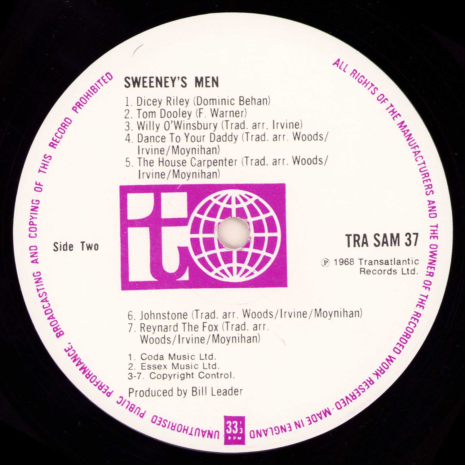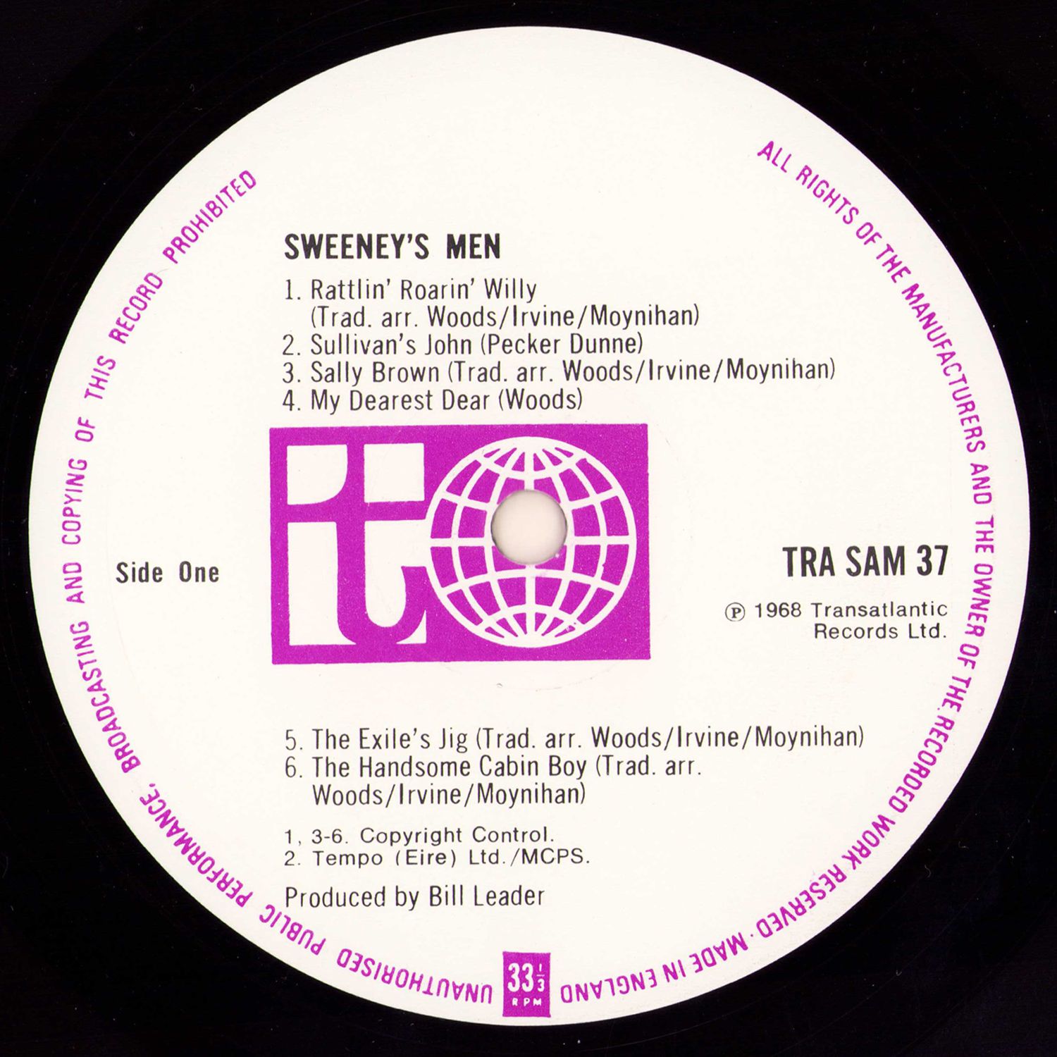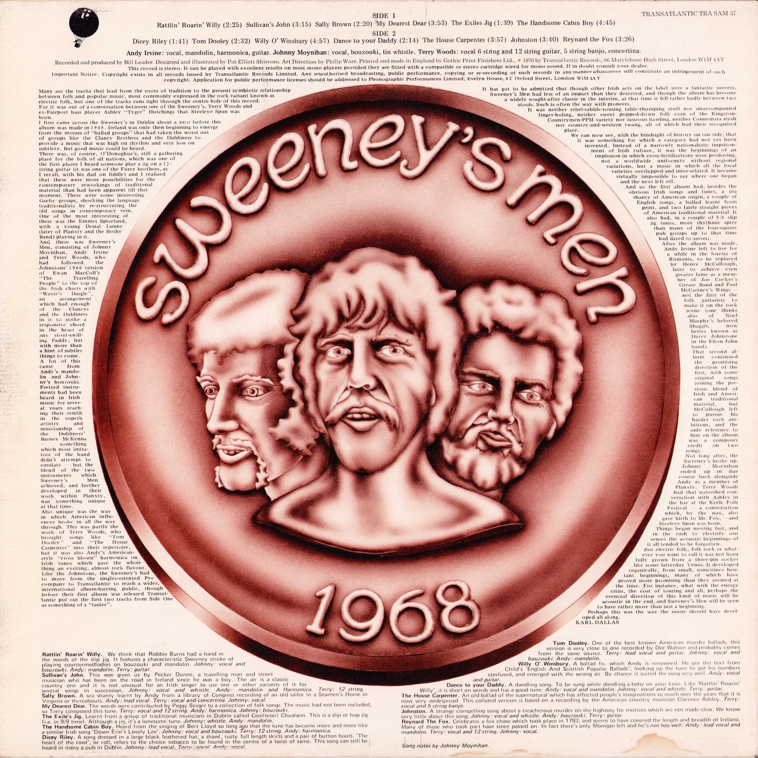 Also unique was the way in which American influences broke in all the way through. This was partly the work of Terry Woods, who brought songs like "Tom Dooley" and "The House Carpenter" into their repertoire, but it was also Andy's American style "cross blown" harmonica on Irish tunes which gave the whole thing an exciting, almost rock flavour. Like the Johnstons, the Sweeney's had to move from the singles- oriented Pye international album- buying public, though before their first album was released Transatlantic put out the first two tracks from Side One as something of a "taster".