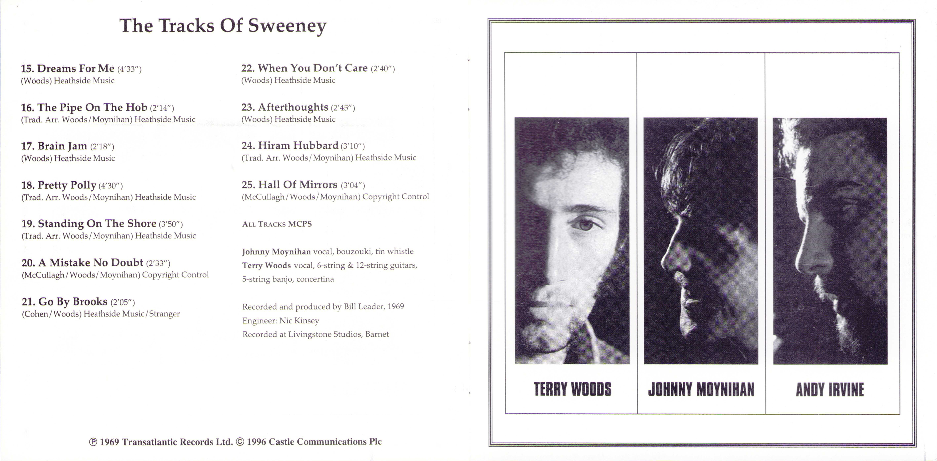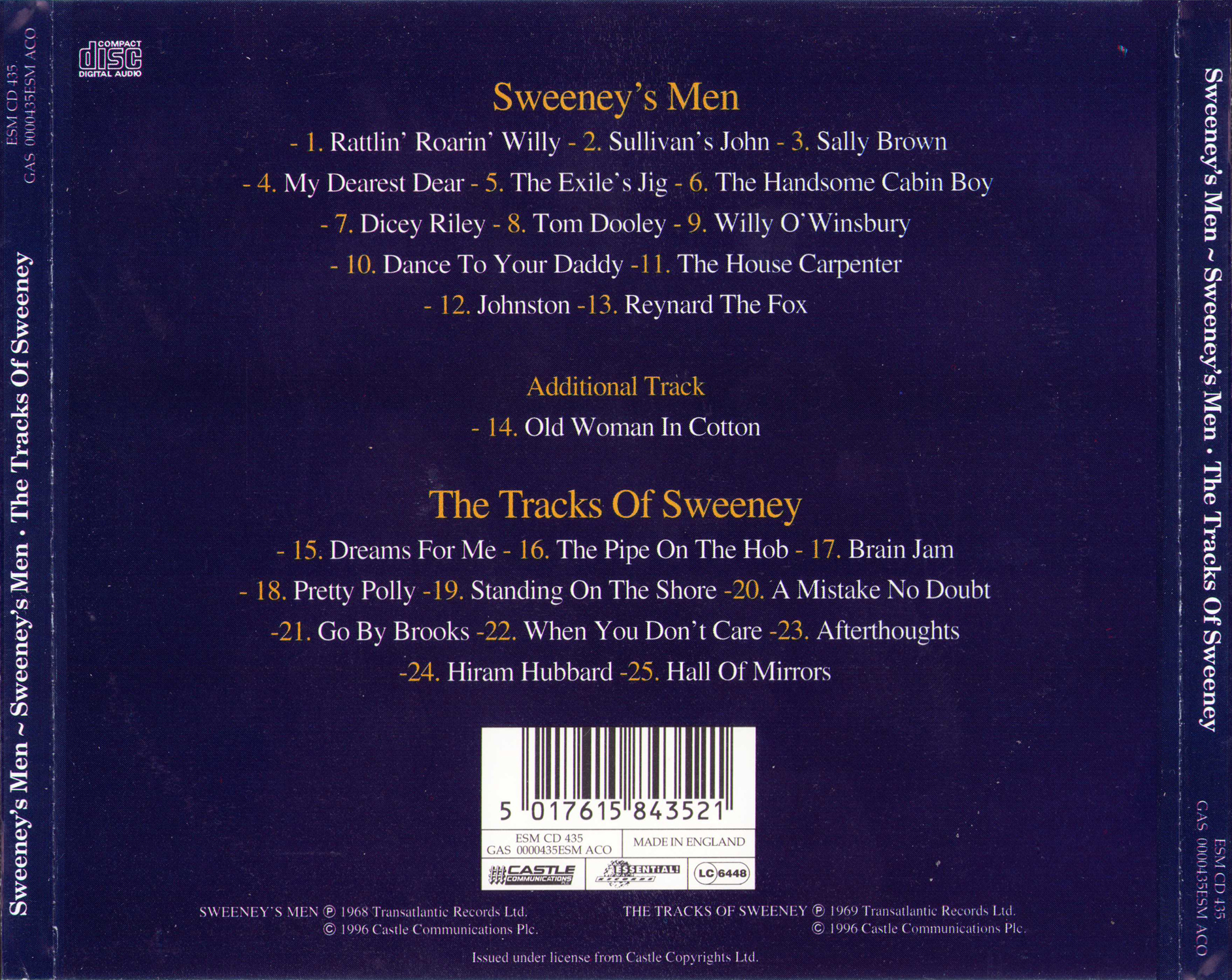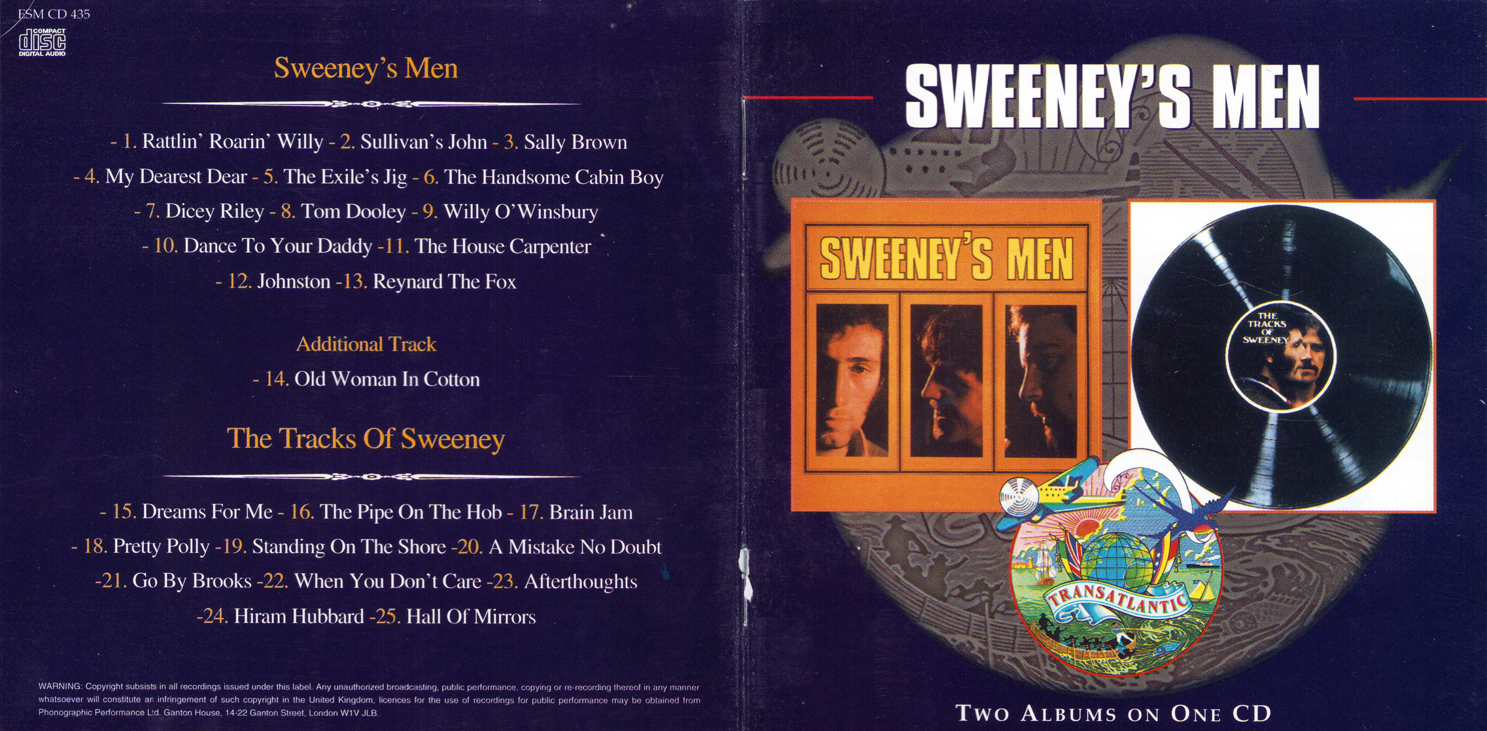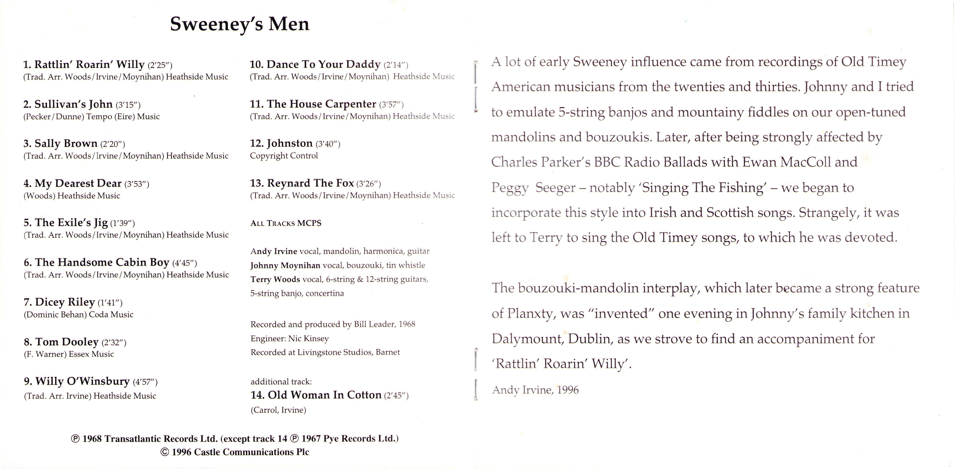 The original line-up of Sweeney's Men was Johnny Moynihan, Andy Irvine and Joe Dolan (the group had been formed in 1966 and was then known as The Sweeneys). When Joe Dolan left in June 1967, he was replaced by Terry Woods, and this line-up recorded two singles for the Pye label. One of these songs, 'Old Woman In Cotton', written by Pat Carroll and Andy Irvine, is included in this compilation.