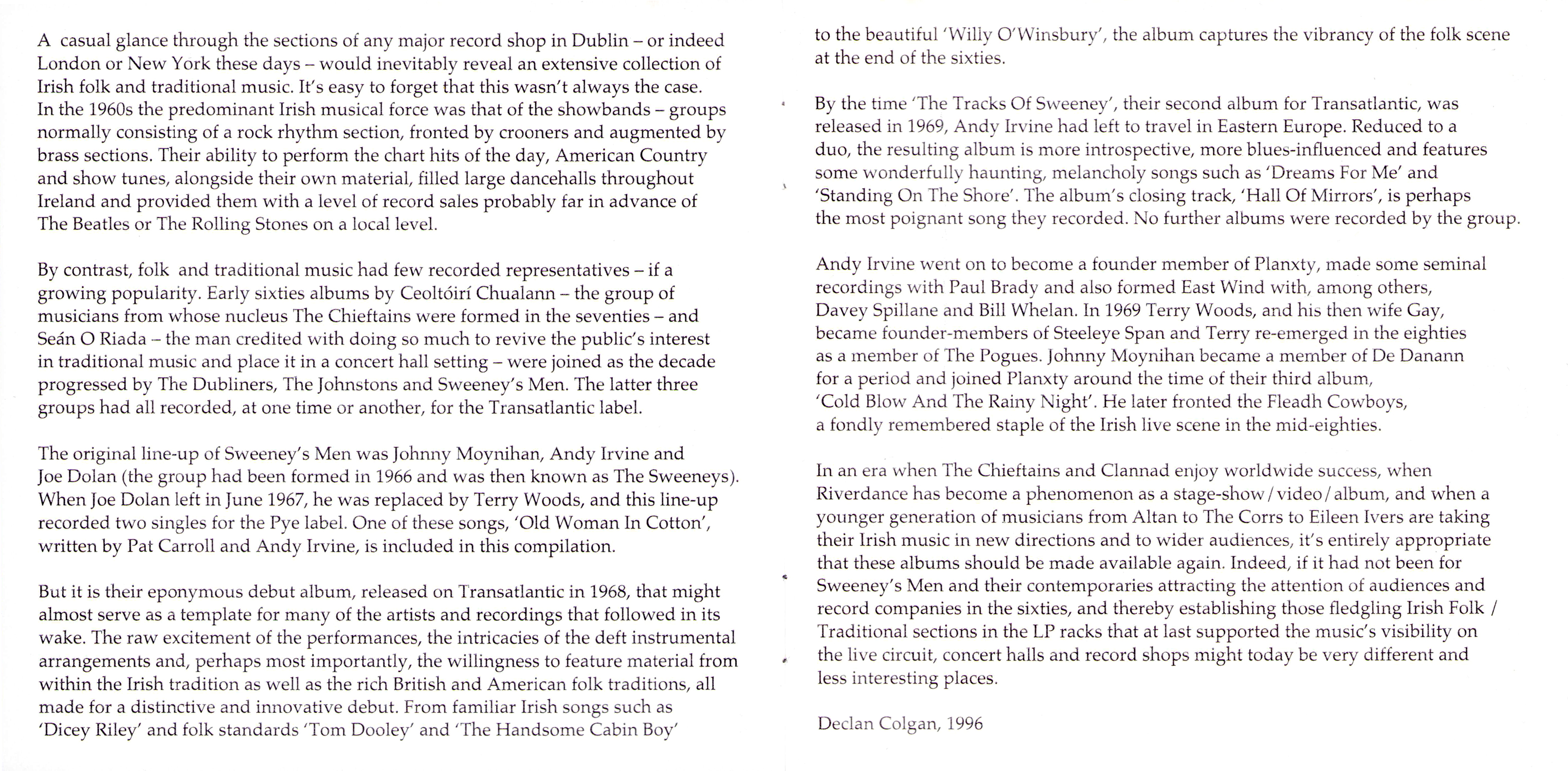 In an era when The Chieftains and Clannad enjoy worldwide success, when Riverdance has become a phenomenon as a stage-show/video/album, and when a younger generation of musicians from Altan to The Corrs to Eileen Ivers are taking their Irish music in new directions and to wider audiences, it's entirely appropriate that these albums should be made available again. Indeed, if it had not been for Sweeney's Men and their contemporaries attracting the attention of audiences and record companies in the sixties, and thereby establishing those fledgling Irish Folk / Traditional sections in the LP racks that at last supported the music's visibility on the live circuit, concert halls and record shops might today be very different and less interesting places.