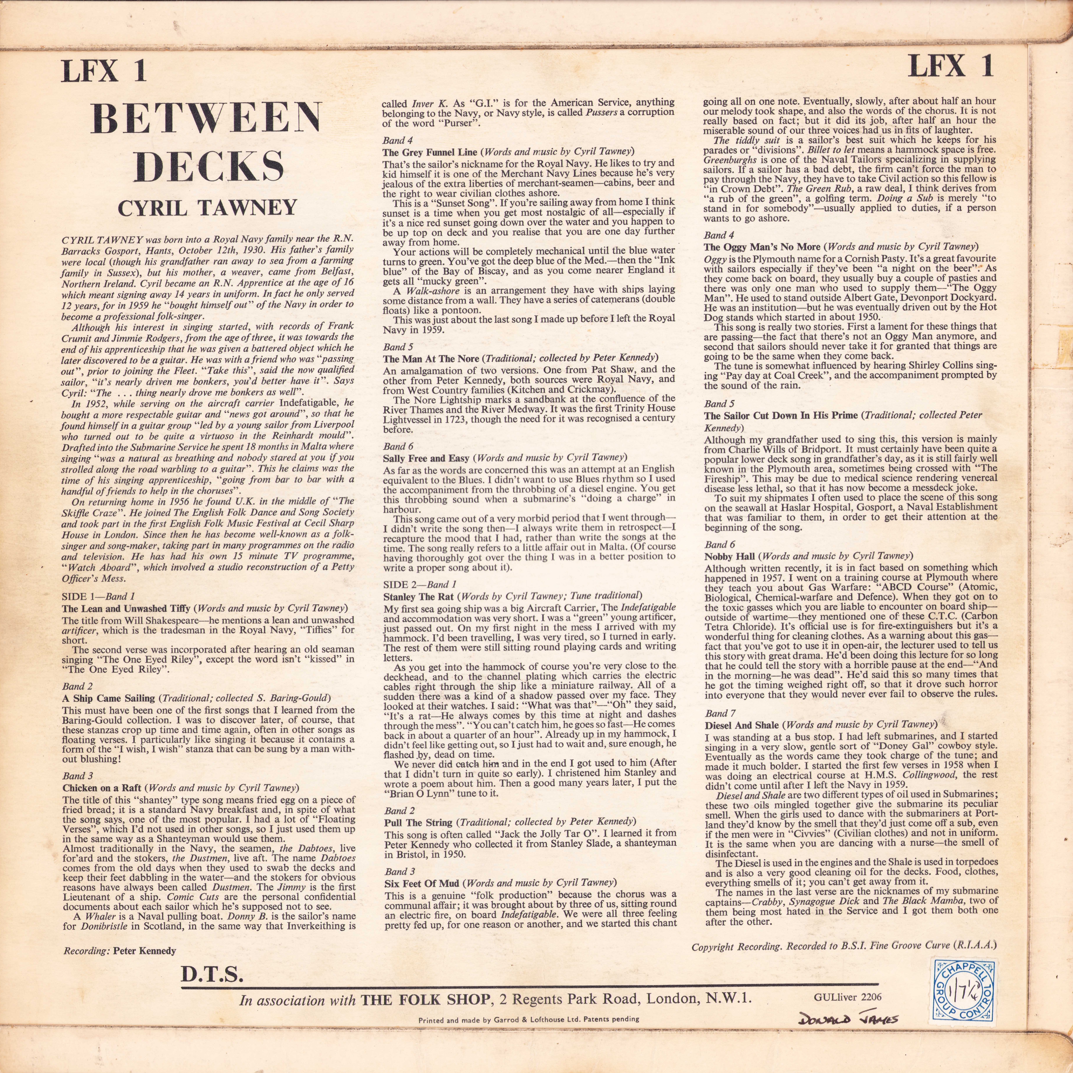CYRIL TAWNEY was born into a Royal Navy family near the R.N. Barracks Gosport, Hants, October 12th, 1930. His father's family were local (though his grandfather ran away to sea from a farming family in Sussex), but his mother, a weaver, came from Belfast, Northern Ireland. Cyril became an R.N. Apprentice at the age of 16 which meant signing away 14 years in uniform. In fact he only served 12 years, for in 1959 he "bought himself out " of the Navy in order to become a professional folk-singer.