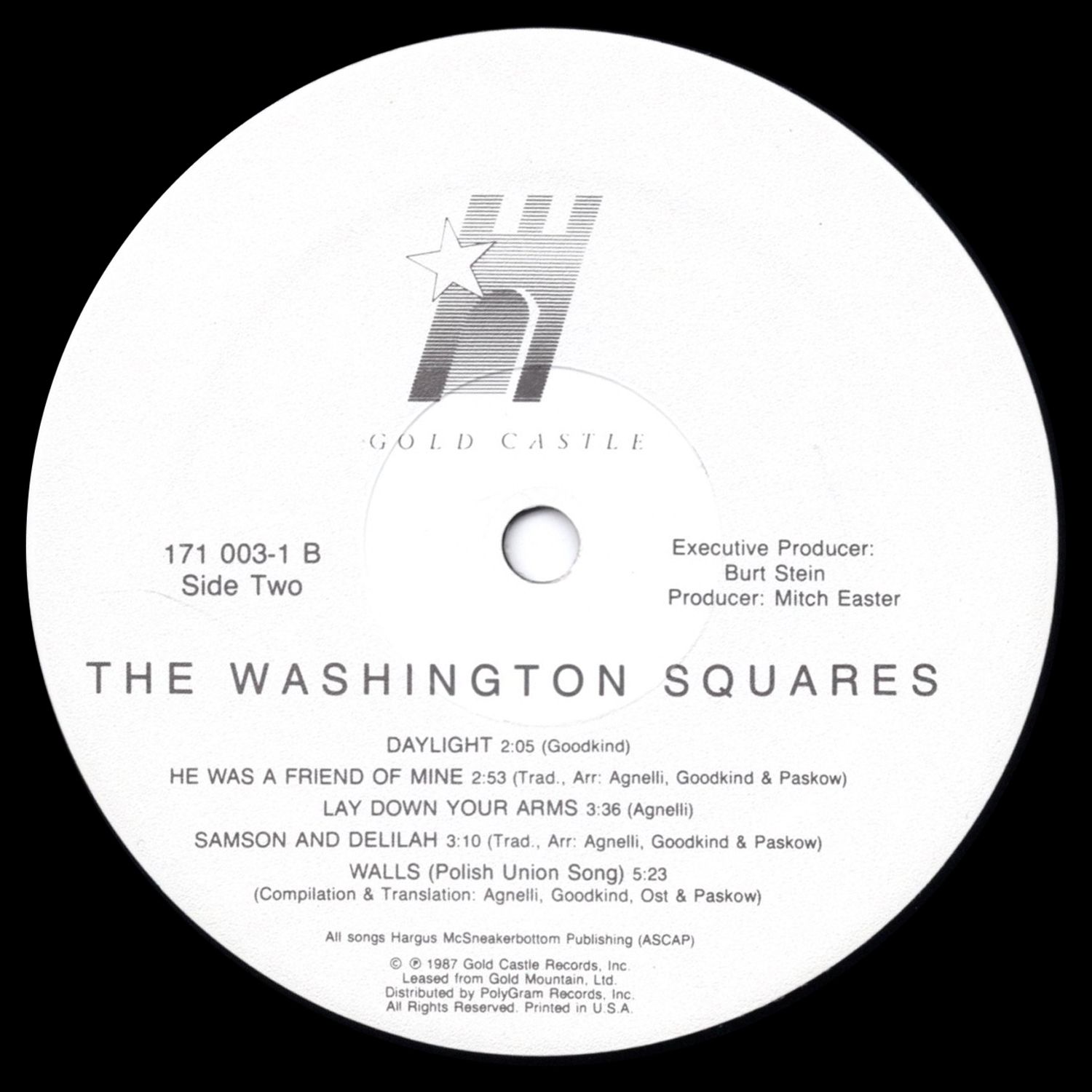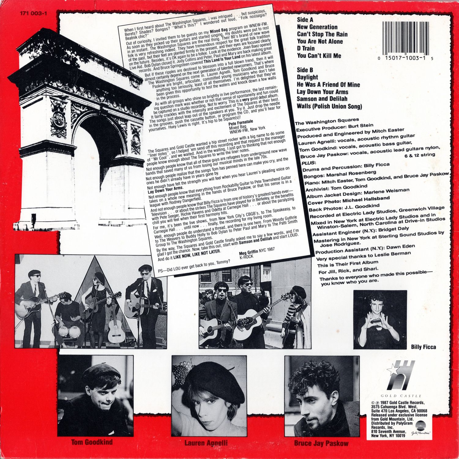 Out of curiosity, I invited them to be guests on my Mixed Bag program on WNEW-FM. As soon as they picked up their guitars and started singing, my doubts were put to rest in an instant. The Washington Squares are the real thing. Their 80's brand of new wave folk is very refreshing indeed. They have tremendous respect for the great folk tradition of the past, but their feet are planted firmly in the present, and their eyes are focused clearly on the future. Besides, it's OK again to be a folkie. Look at the evidence. Joan Baez opened Live Aid. Bob Dylan closed it. Judy Collins and Peter, Paul and Mary are back making great records. And Bruce Springsteen covered This Land Is Your Land on his latest album. But if these ripples are destined to blossom into a full blown trend, then it will almost certainly depend on the next generation of talented newcomers. That's where The Washington Squares come in. Lauren Agnelli, Tom Goodkind and Bruce Paskow are bright, articulate, committed young musicians who don't take anything too seriously, least of all themselves. I'm delighted that they've been given this opportunity to test the waters and knock down a few walls in the process.