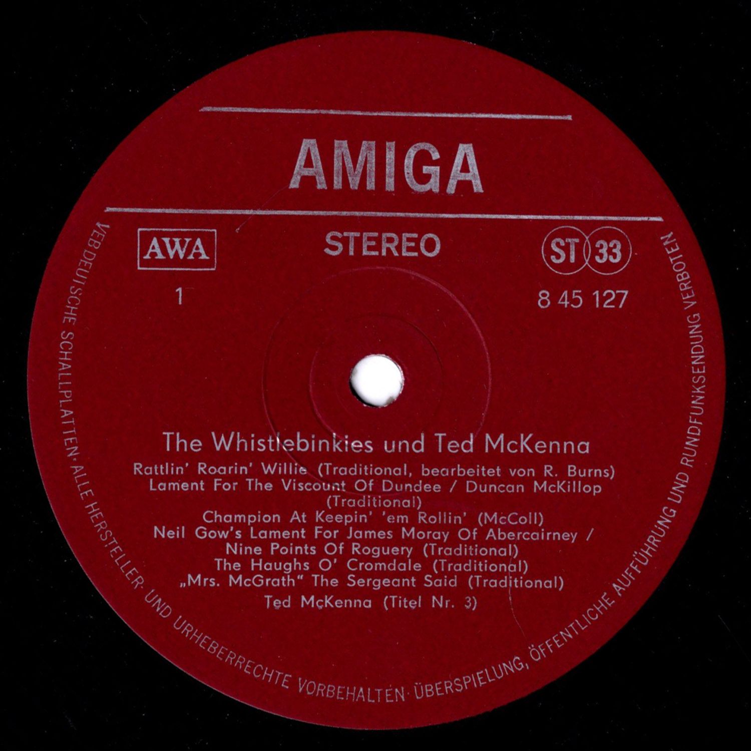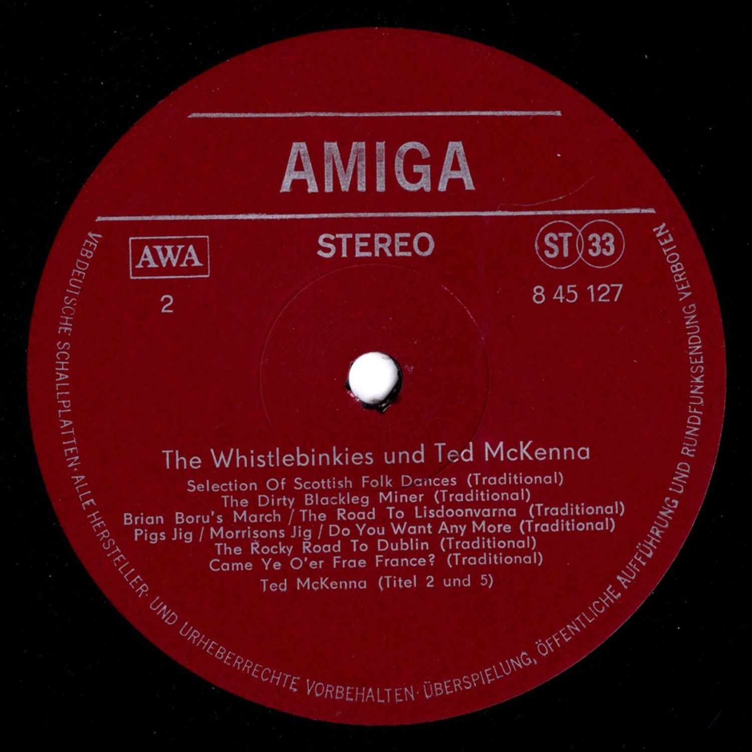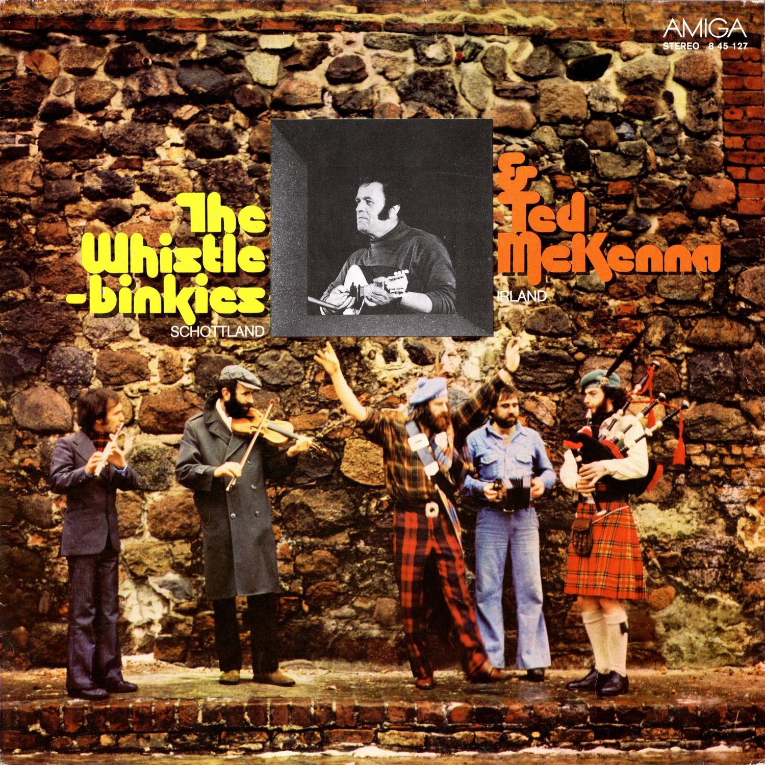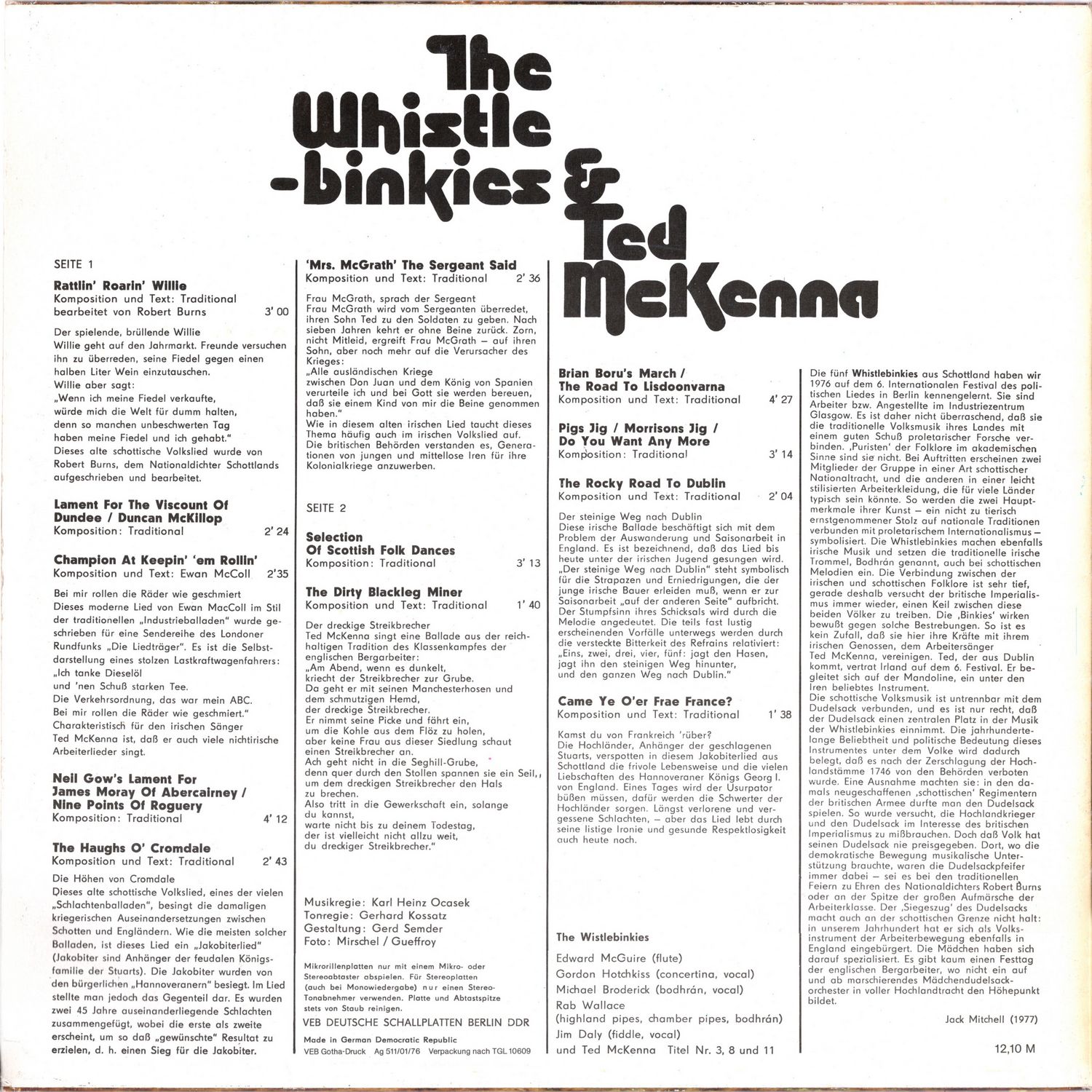We met the five Whistlebinkies from Scotland in 1976 at the 6th International Festival of Political Song in Berlin. They are workers or employees in the industrial center of Glasgow. It is therefore not surprising that they combine the traditional folk music of their country with a good dose of proletarian research. They are not 'purists' of folklore in the academic sense. When performing, two members of the group appear in a kind of Scottish national costume, and the others in slightly stylized working-class clothing that could be typical of many countries. In this way, the two main characteristics of their art — a pride in national traditions that is not taken too seriously combined with proletarian internationalism — are symbolized. The Whistlebinkies also make Irish music and also use the traditional Irish drum, called bodhrán, for Scottish melodies. The connection between Irish and Scottish folklore is very deep, which is precisely why British imperialism continually tries to drive a wedge between these two peoples. The 'Binkies' consciously work against such efforts. So it's no coincidence that they join forces here with their Irish comrade, the working class singer Ted McKenna. Ted, who is from Dublin, represented Ireland at the 6th Festival. He accompanies himself on the mandolin, an instrument popular among the Irish.