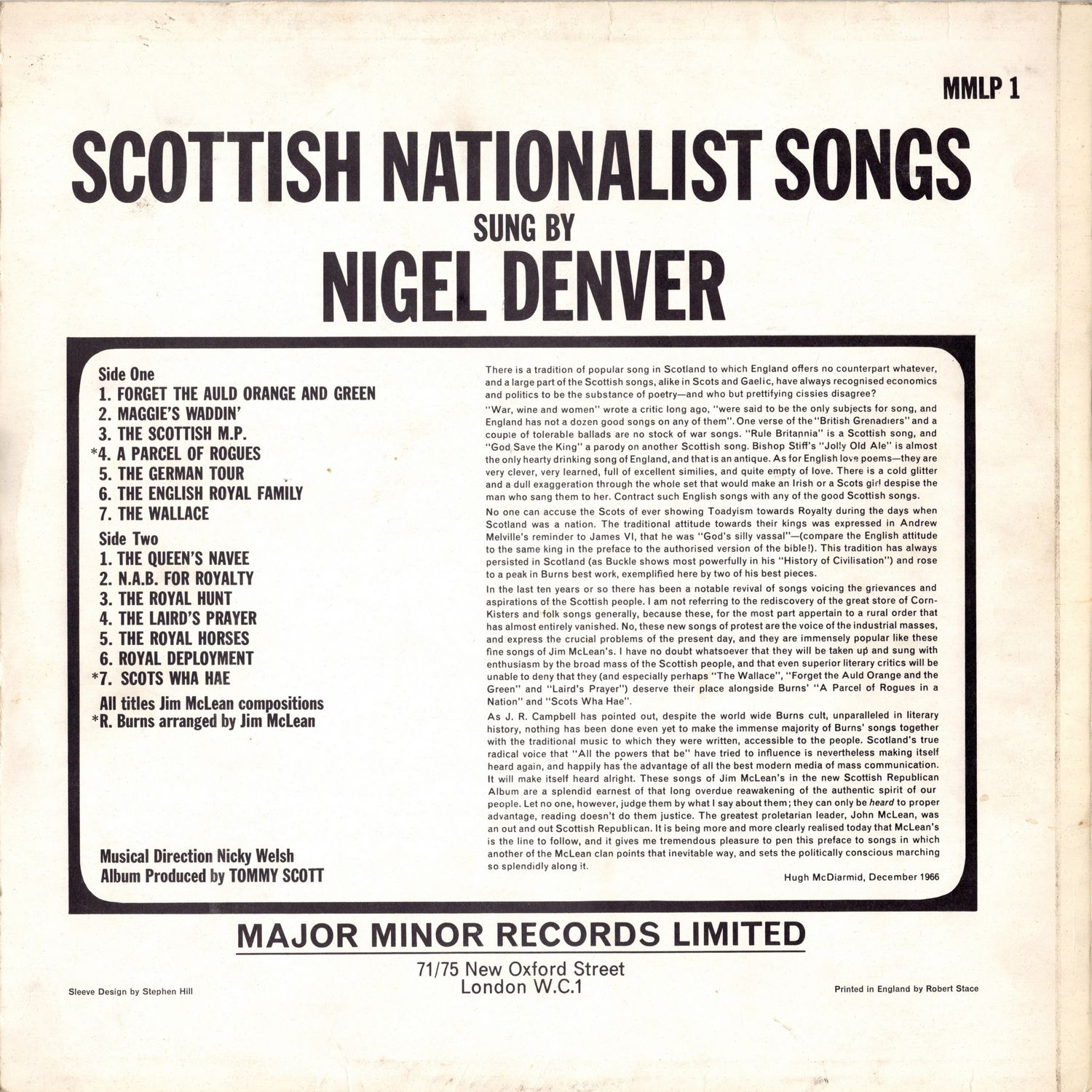 In the last ten years or so there has been a notable revival of songs voicing the grievances and aspirations of the Scottish people. I am not referring to the rediscovery of the great store of Corn-Kisters and folk songs generally, because these, for the most part appertain to a rural order that has almost entirely vanished. No, these new songs of protest are the voice of the industrial masses, and express the crucial problems of the present day, and they are immensely popular like these fine songs of Jim McLean's. I have no doubt whatsoever that they will be taken up and sung with enthusiasm by the broad mass of the Scottish people, and that even superior literary critics will be unable to deny that they (and especially perhaps "The Wallace", "Forget the Auld Orange and the Green" and "Laird's Prayer") deserve their place alongside Burns' "A Parcel of Rogues in a Nation" and "Scots Wha Hae".