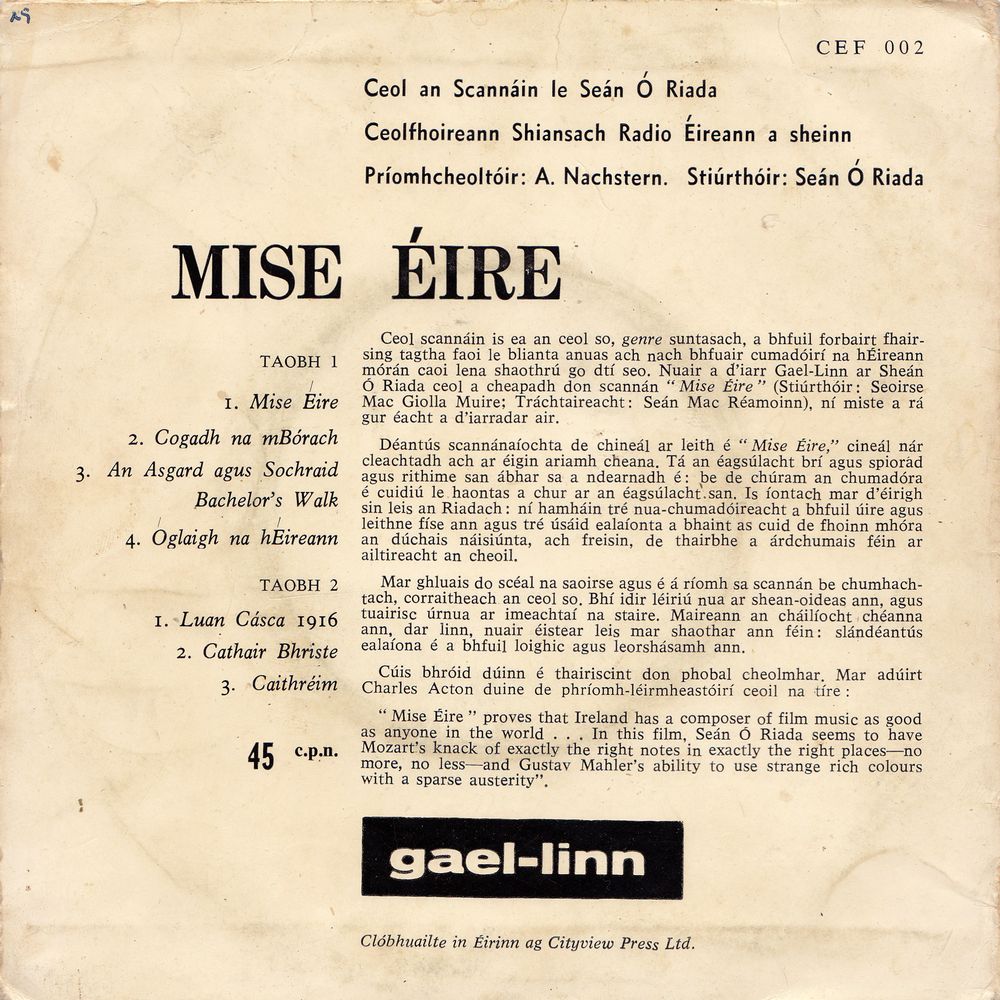 "Mise Eire" proves that Ireland has a composer of film music as good as anyone in the world … In this film, Seán Ó Riada seems to have Mozart's knack of exactly the right notes in exactly the right places — no more, no less — and Gustav Mahler's ability to use strange rich colours with a sparse austerity.