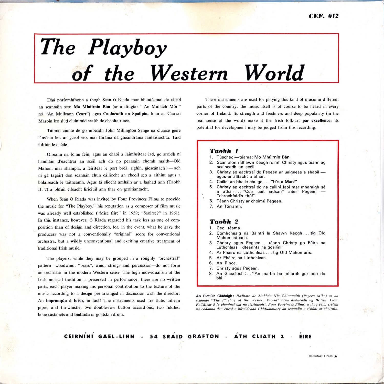 When Seán Ó Riada was invited by Four Provinces Films to provide the music for "The Playboy," his reputation as a composer of film music was already well established ("Mise Eire" in 1959; "Saoirse?" in 1961). In this instance, however, Ó Riada regarded his task less as one of composition than of design and direction, for, in the event, what he gave the producers was not a conventionally "original" score for conventional orchestra, but a wildly unconventional and exciting creative treatment of traditional Irish music.