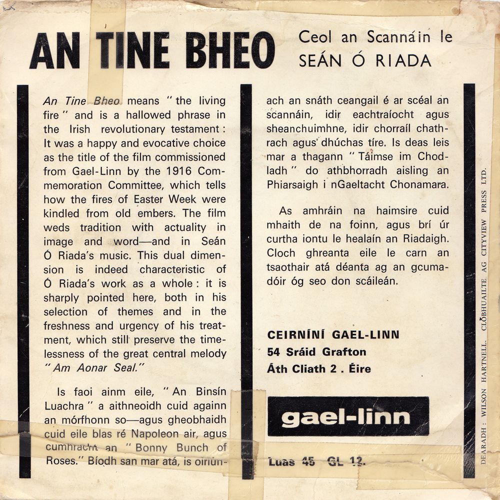An Tine Bheo, means "the living fire" and is a hallowed phrase in the Irish revolutionary testament! It was a happy and evocative choice as the title of the film commissioned from Gael-Linn by the 1916 Commemoration Committee, which tells how the fires of Easter Week were kindled from old embers. The film weds tradition with actuality in image and word — and in Seán Ó Riada's music. This dual dimension is indeed characteristic of Ó Riada's work as a whole: it is sharply pointed here, both in his selection of themes and in the freshness and urgency of his treatment, which still preserve the time-lessness of the great central melody "Am Aonar Seal."