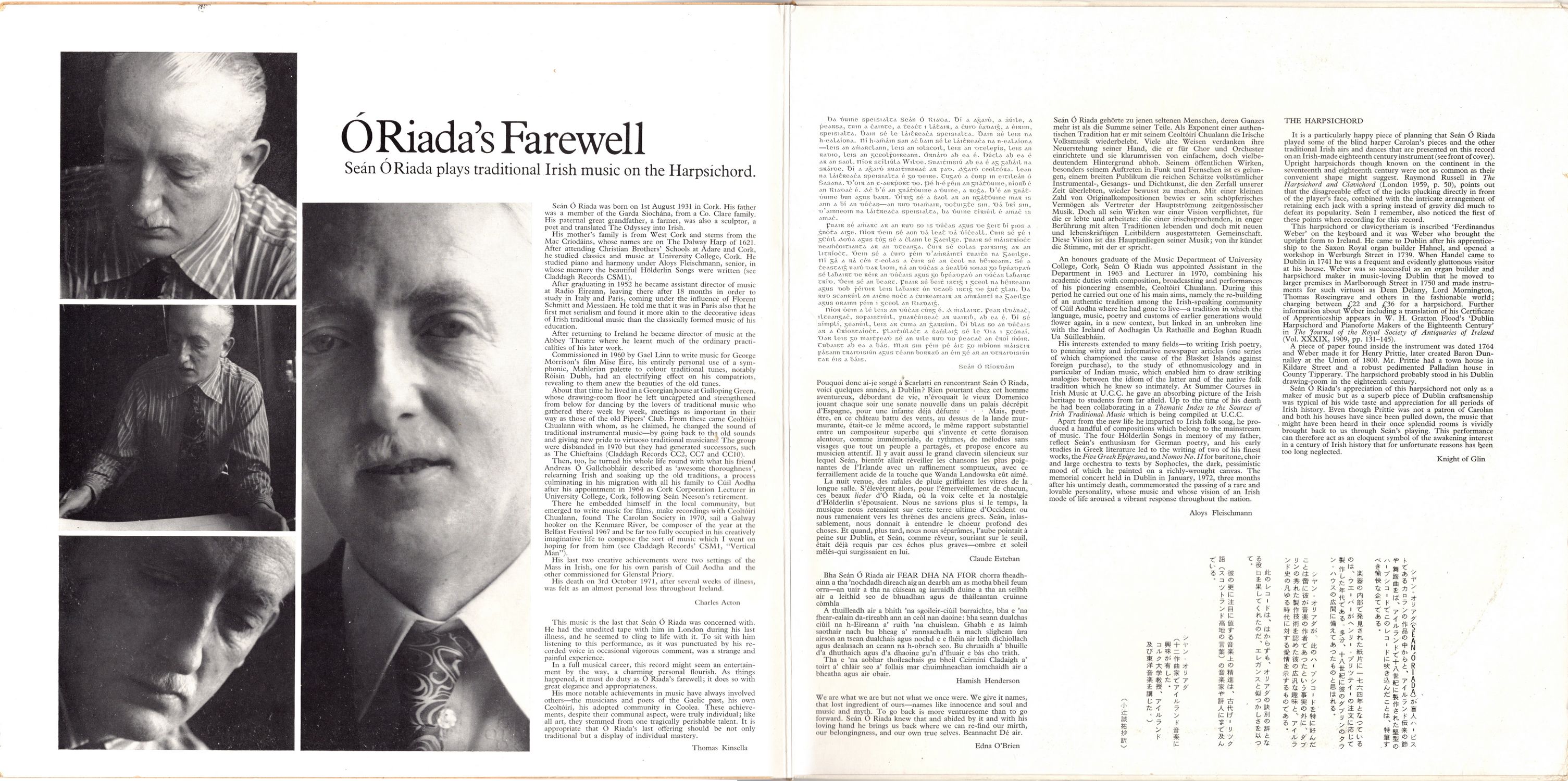 This music is the last that Seán Ó Riada was concerned with. He had the unedited tape with him in London during his last illness, and he seemed to ding to life with it. To sit with hits listening to this performance, as it was punctuated by his recorded voice in occasional vigorous comment, was a strange and painful experience.