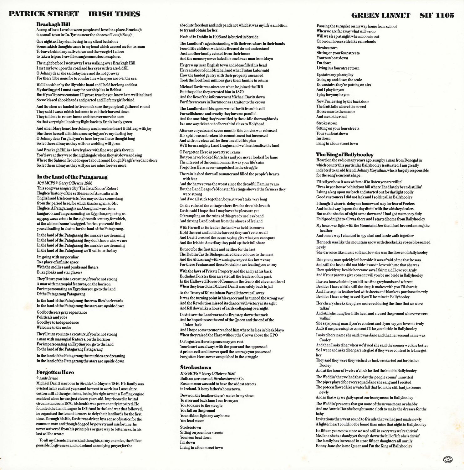 The King of Ballyhooley — Heard on the radio many years ago, sung by a man from Donegal in which county this particular Ballyhooley is situated. I am greatly indebted to an old friend, Johnny Moynihan, who is largely responsible for the song's current shape.