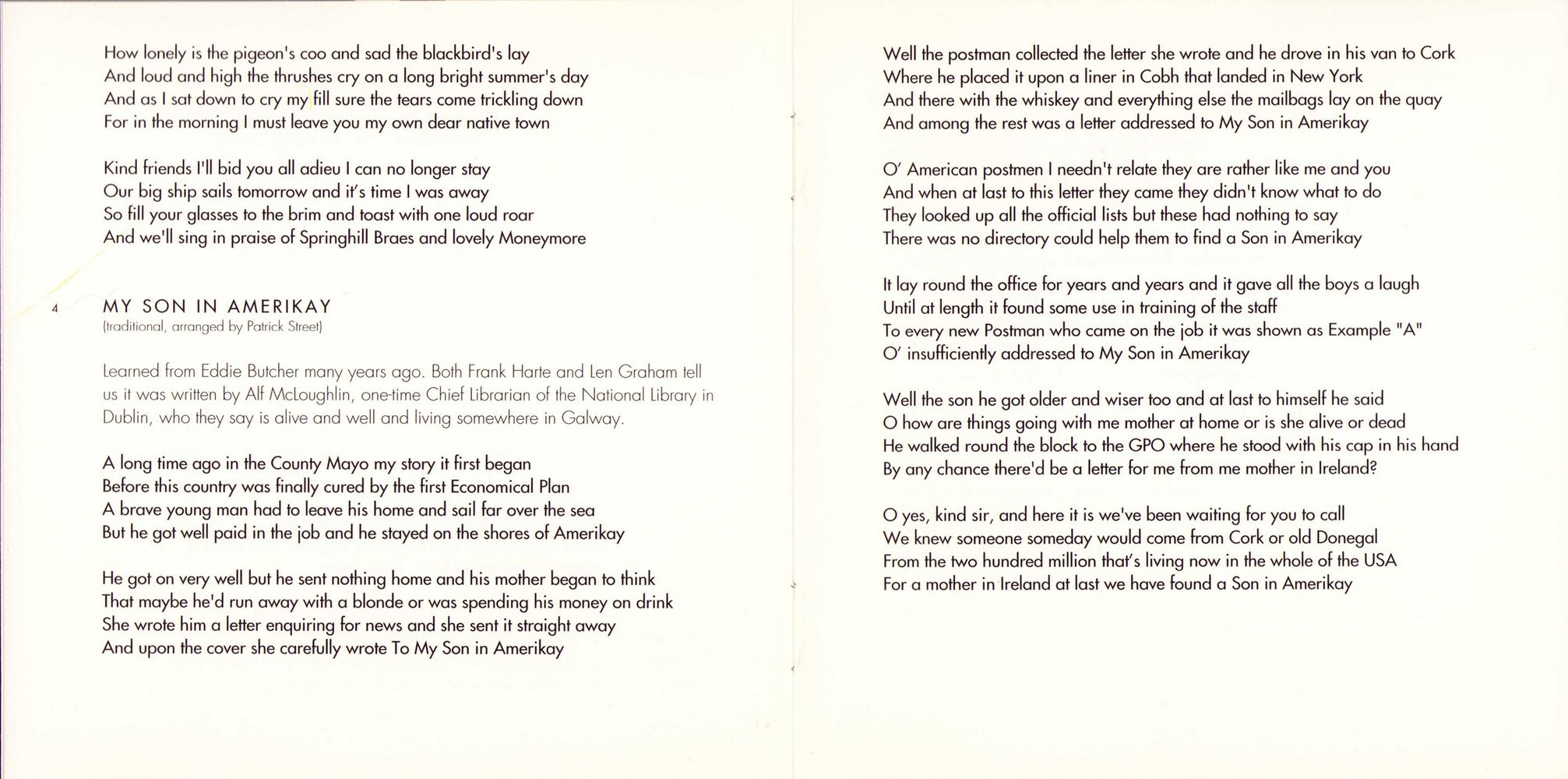 My Son in Amerikay — Learned from Eddie Butcher many years ago. Both Frank Harte and Len Graham tell us it was written by Alf McLoughlin, one-time Chief Librarian of the National Library in Dublin, who they say is alive and well and living somewhere in Galway.