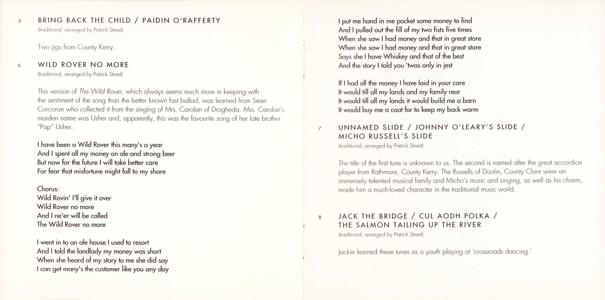 Wild Rover No More — This version of The Wild Rover, which always seems much more in keeping with the sentiment of the song than the better known fast ballad, was learned from Sean Corcoran who collected it from the singing of Mrs. Carolan of Drogheda. Mrs. Carolan's maiden name was Usher and, apparently, this was the favourite song of her late brother "Pap" Usher.
