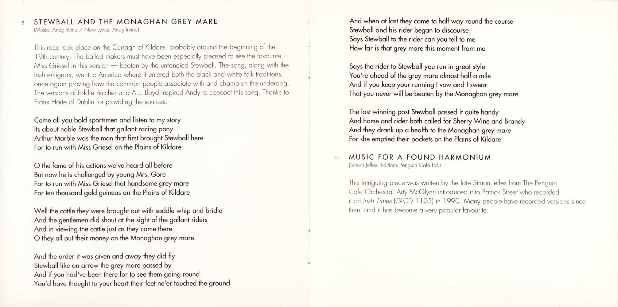 Stewball and the Monaghan Grey Mare — This race took place on the Curragh of Kildare, probably around the beginning of the 19th century. The ballad makers must have been especially pleased to see the favourite — Miss Griesel in this version — beaten by the unfancied Stewball. The song, along with the Irish emigrant, went to America where it entered both the black and white folk traditions, once again proving how the common people associate with and champion the underdog. The versions of Eddie Butcher and A.L. Lloyd inspired Andy to concoct this song. Thanks to Frank Harte of Dublin for providing the sources.