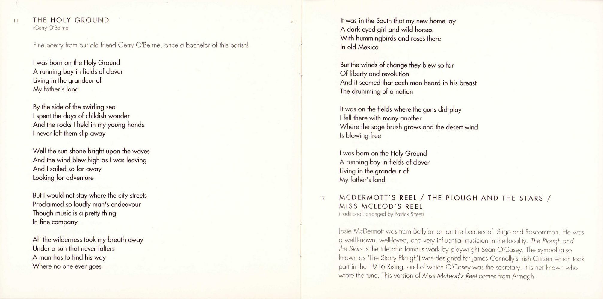 McDermott's Reel, The Plough and The Stars & Miss McLeod's Reel — Josie McDermott was from Ballyfarnon on the borders of Sligo and Roscommon. He was a well-known, well-loved, and very influential musician in the locality. The Plough and the Stars is the title of a famous work by playwright Sean O'Casey. The symbol (also known as "The Starry Plough") was designed for James Connolly's Irish Citizen which took part in the 1916 Rising, and of which O'Casey was the secretary. It is not known who wrote the tune. This version of Miss McLeod's Reel comes from Armagh.