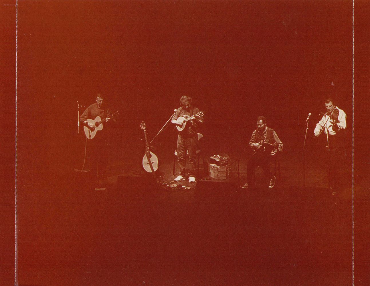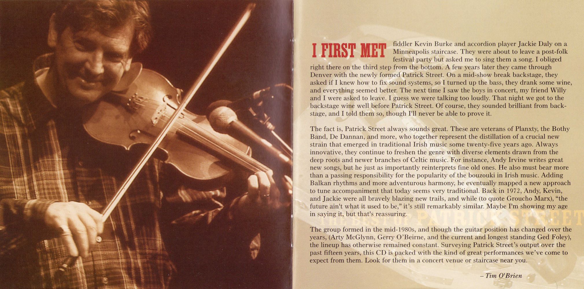 I first met fiddler Kevin Burke and accordion player Jackie Daly on a Minneapolis staircase. They were about to leave a post-folk festival party but asked me to sing them a song. I obliged right there on the third step from the bottom. A few years later they came through Denver with the newly formed Patrick Street. On a mid-show break backstage, they asked if I knew how to fix sound systems, so I turned up the bass, they drank some wine, and everything seemed better. The next time I saw the boys in concert, my friend Willy and I were asked to leave. I guess we were talking too loudly. That night we got to the backstage wine well before Patrick Street. Of course, they sounded brilliant from back-stage, and I told them so, though I'll never be able to prove it.