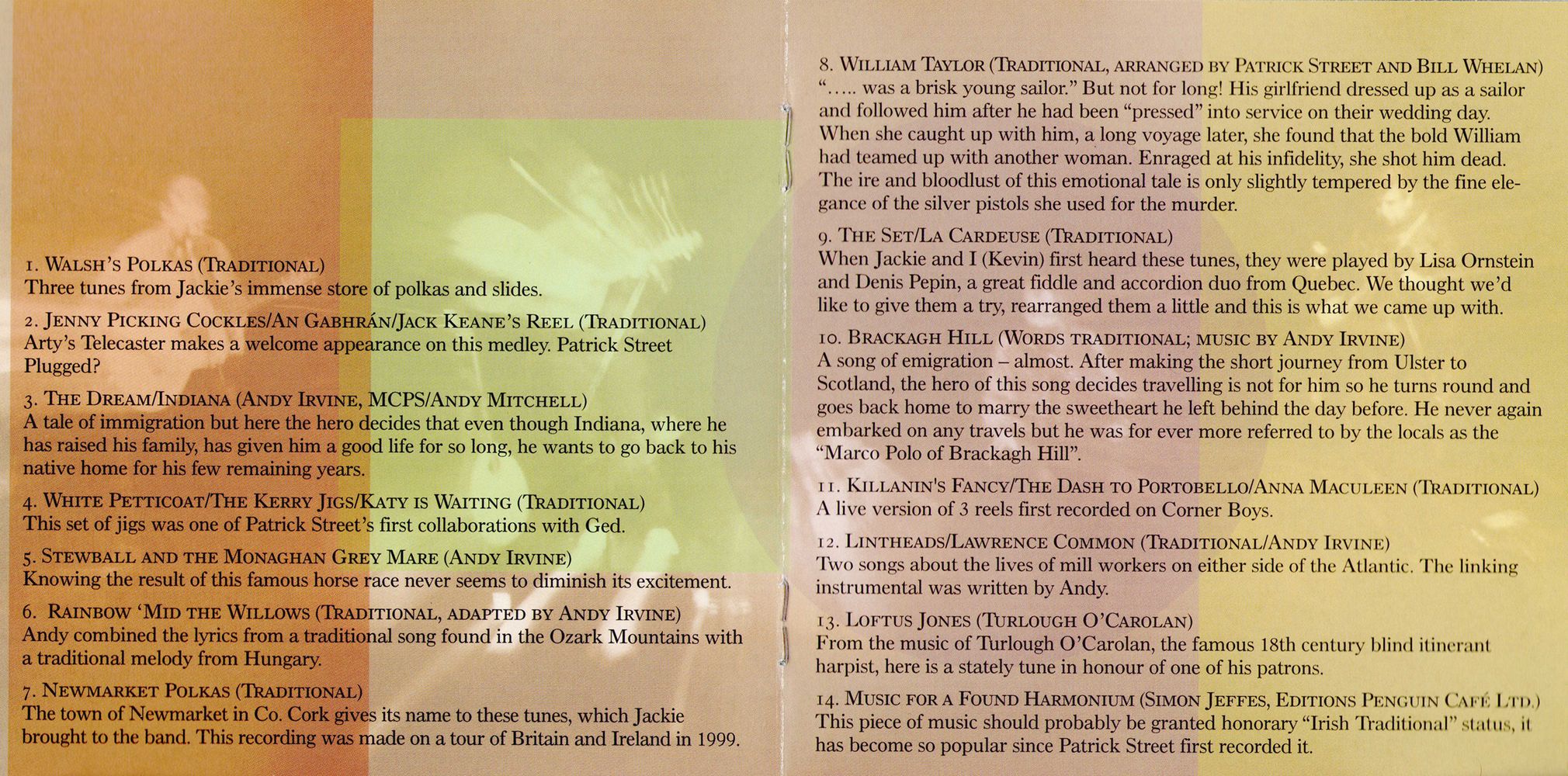 Music for a Found Harmonium — This piece of music should probably be granted honorary "Irish Traditional" status, it has become so popular since Patrick Street first recorded it.
