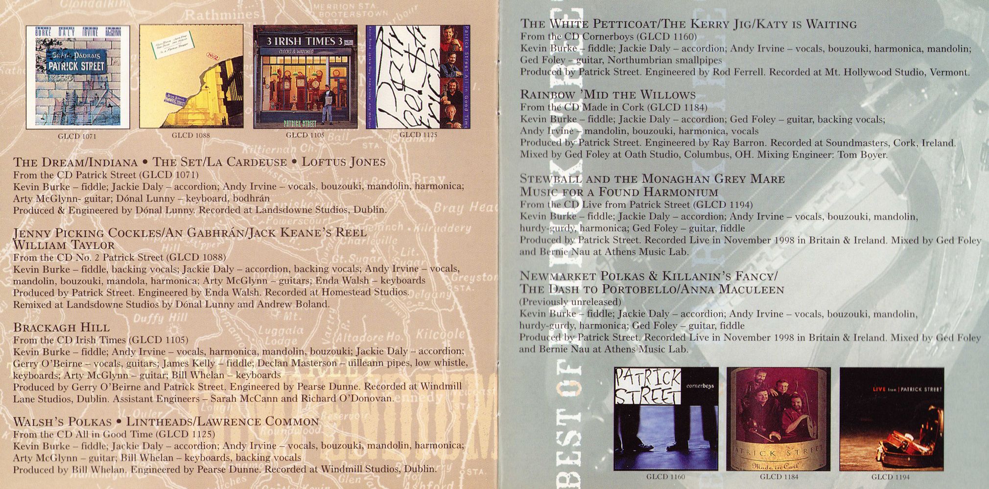 The fact is, Patrick Street always sounds great. These are veterans of Planxty, the Bothy Band, De Dannan, and more, who together represent the distillation of a crucial new strain that emerged in traditional Irish music some twenty-five years ago. Always innovative, they continue to freshen the genre with diverse elements drawn from the deep roots and newer branches of Celtic music. For instance, Andy Irvine writes great new songs, but he just as importantly reinterprets fine old ones. He also must bear more than a passing responsibility for the popularity of the bouzouki in Irish music. Adding Balkan rhythms and more adventurous harmony, he eventually mapped a new approach to tune accompaniment that today seems very traditional. Back in 1972, Andy, Kevin, and Jackie were all bravely blazing new trails, and while ( to quote Groucho Marx) , "the future ain't what it used to be," it's still remarkably similar. Maybe I'm showing my age in saying it, but that's reassuring.