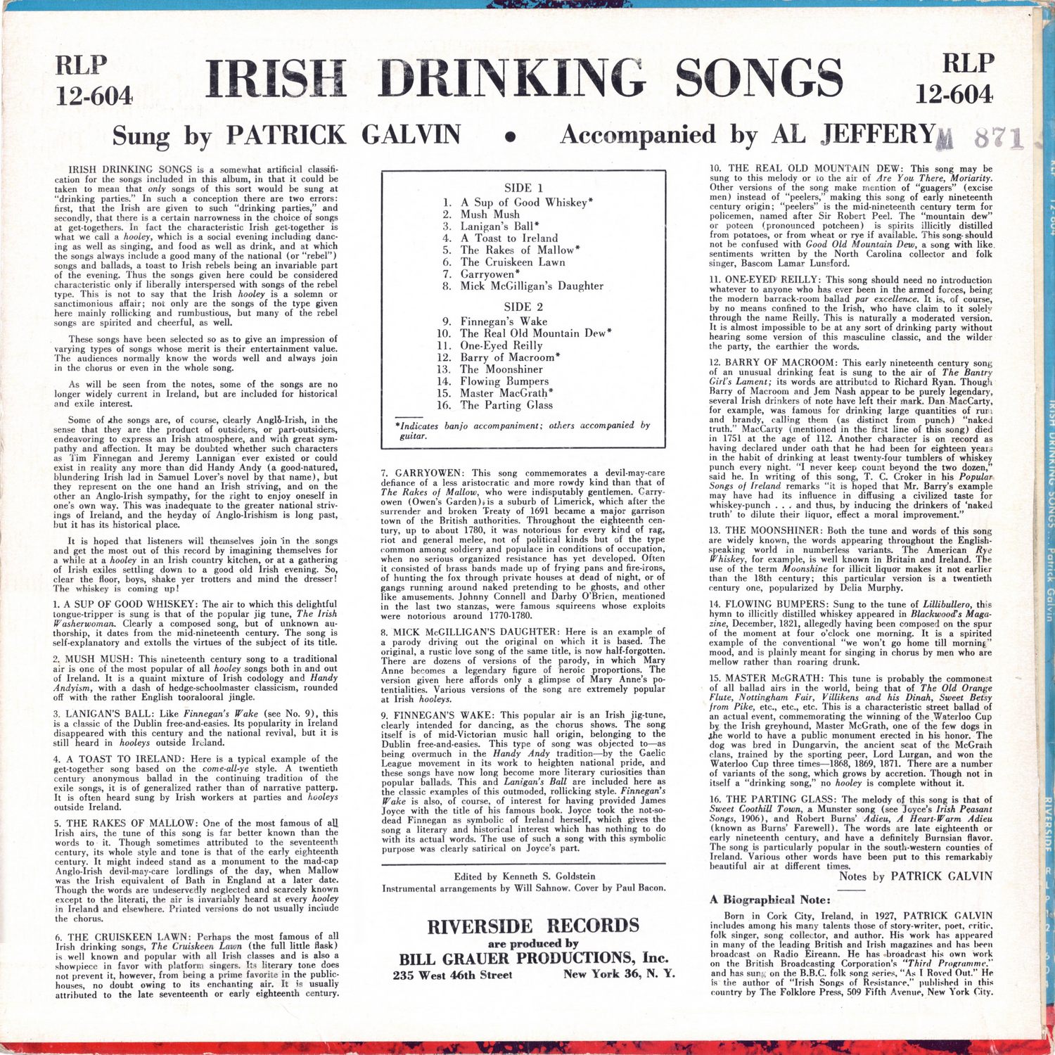 IRISH DRINKING SONGS is a somewhat artificial classification for the songs included in this album, in that it could be taken to mean that only songs of this sort would be sung at "drinking parties." In such a conception there are two errors: first, that the Irish are given to such "drinking parties," and secondly, that there is a certain narrowness in the choice of songs at get-togethers. In fact the characteristic Irish get-together is what we call a hooley, which is a social evening including dancing as well as singing, and food as well as drink, and at which the songs always include a good many of the national (or "rebel") songs and ballads, a toast to Irish rebels being an invariable part of the evening. Thus the songs given here could be considered characteristic only if liberally interspersed with songs of the rebel type. This is not to say that the Irish hooley is a solemn or sanctimonious affair; not only are the songs of the type given here mainly rollicking and rumbustious, but many of the rebel songs are spirited and cheerful, as well.