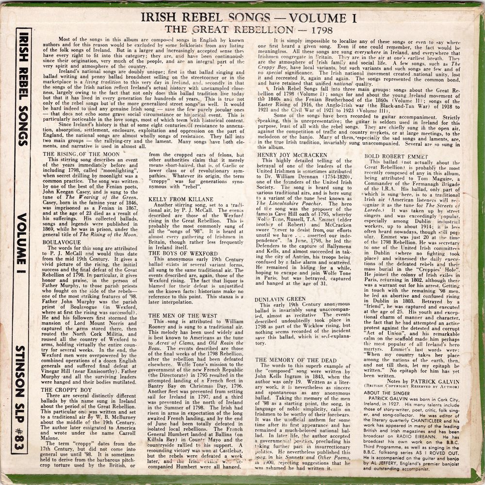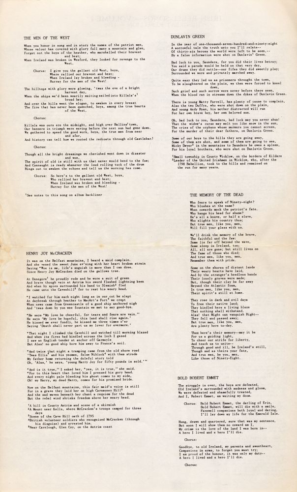 Some of the songs have been recorded to guitar accompaniment. Strictly speaking, this is unrepresentative; the guitar is seldom used in Ireland for this purpose, least of all with the rebel songs. They are chiefly sung in the open air, against the competition of traffic and country markets, or at large meetings, to the melodeon or the banjo. Many of them, especially the sad songs and laments, are, in the true Irish tradition, invariably sung unaccompanied. Several are so sung in this album.