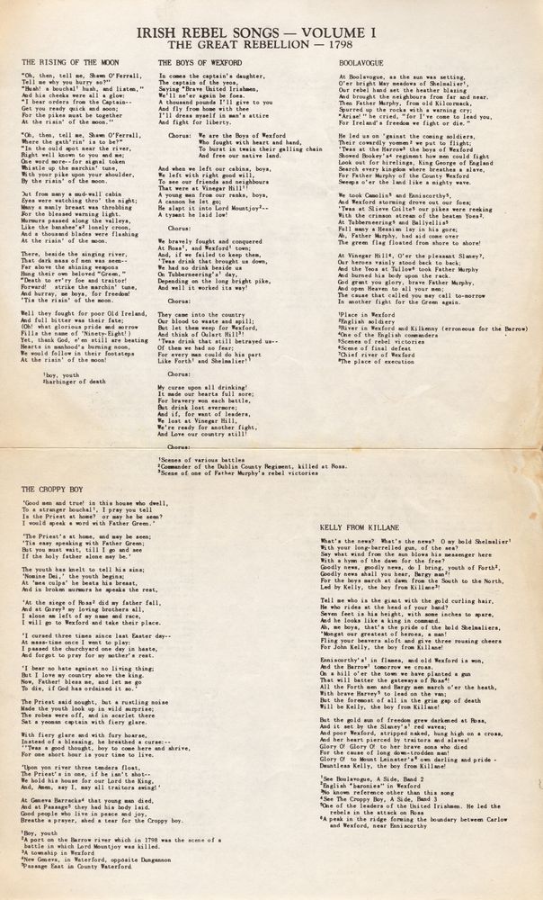The words for this song are attributed to P. J. McCall and would thus date from the mid 19th Century. It gives a vivid picture of the rising, the initial success and the final defeat of the Great Rebellion of 1798. In particular, it gives honor and praise, in the person of Father Murphy, to those parish priests who fought on the side of the rebels— one of the most striking features of '98. Father John Murphy was the parish priest of Boulavogue (in Wexford, where at first the rising was successful). He and his followers first stormed the mansion of Lord Mount Norris and captured the arms stored there, then routed the North Cork Militia, and roused all the country of Wexford to arms, holding virtually the entire country for several weeks. In the end, the Wexford men were overpowered by the combined operations of a dozen English generals and suffered final defeat at Vinegar Hill (near Enniscorthy). Father Murphy and all the surviving leaders were hanged and their bodies mutilated.