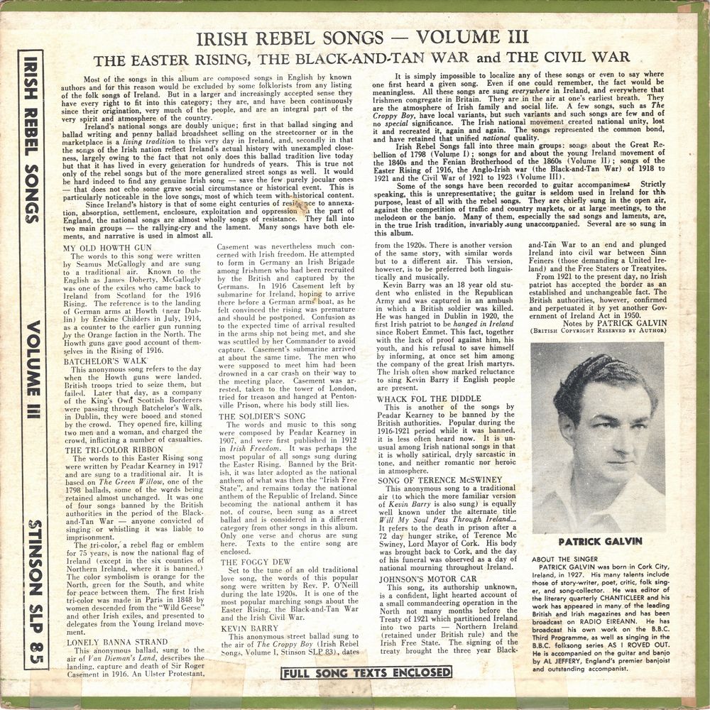 Some of the songs have been recorded to guitar accompaniment Strictly speaking, this is unrepresentative; the guitar is seldom used in Ireland for this purpose, least of all with the rebel songs. They are chiefly sung in the open air, against the competition of traffic and country markets, or at large meetings, to the melodeon or the banjo. Many of them, especially the sad songs and laments, are, in the true Irish tradition, invariably sung unaccompanied. Several are so sung in this album.