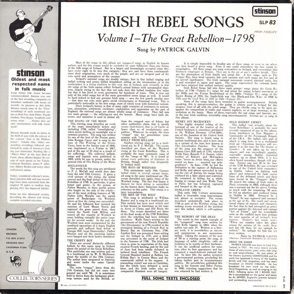 Some of the songs have been recorded to guitar accompaniment. Strictly speaking, this is unrepresentative; the guitar is seldom used in Ireland for this purpose, least of all with the rebel songs. They are chiefly sung in the open air, against the competition of traffic and country markets, or at large meetings, to the melodeon or the banjo. Many of them, especially the sad songs and laments, are, in the true Irish tradition, invariably sung unaccompanied. Several are so sung in this album.
