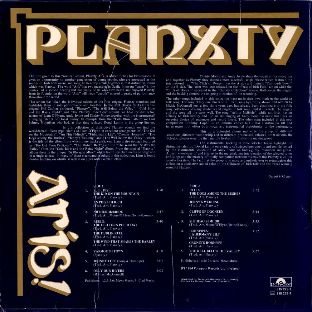 The title given to this "master" album, Planxty Aris, is indeed fitting for two reasons. It gives an opportunity to another generation of young people, who are interested in the sounds of Irish folk music and song, to hear top artists together in that distinctive sound which was Planxty. The word "Aris" has two meanings in Gaelic. It means "again" in the context of a second hearing but for many of us who have heard and enjoyed Planxty from its foundation the word "Aris" will mean "encore" as used in praise of performance throughout the world.