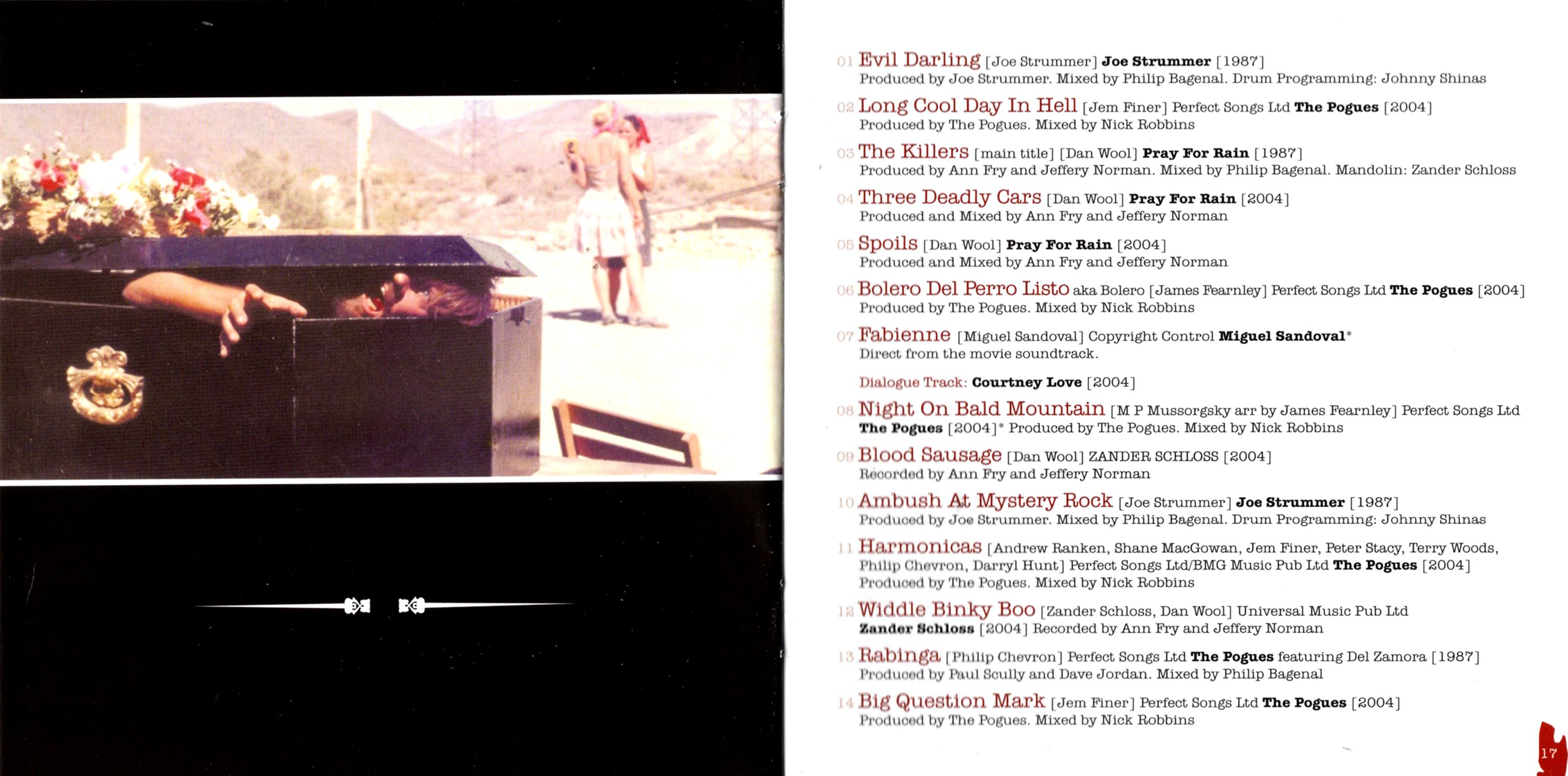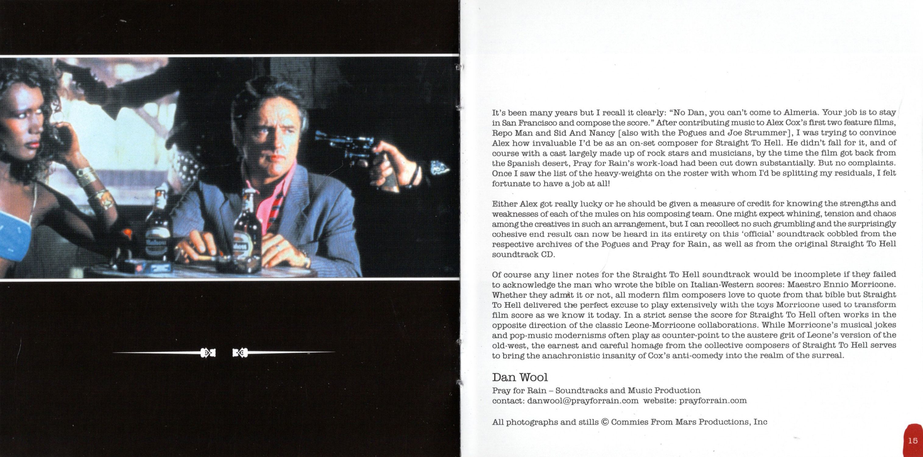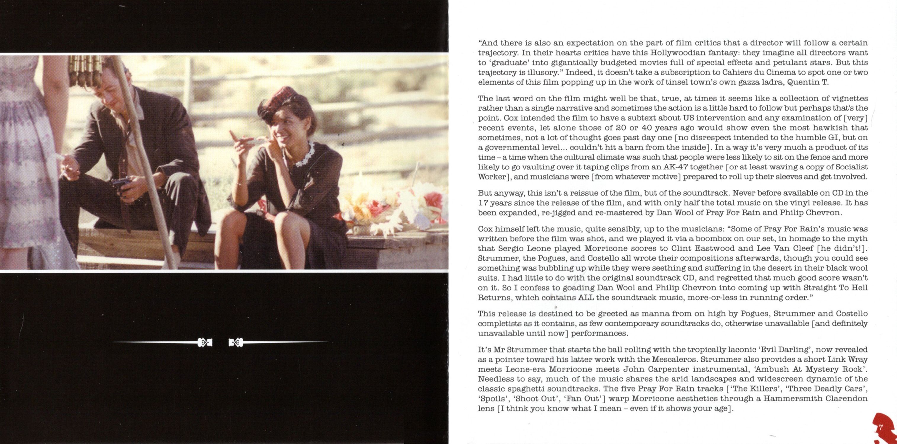 Cox himself left the music, quite sensibly, up to the musicians: "Some of Pray For Rain's music was written before the film was shot, and we played it via a boombox on our set, in homage to the myth that Sergio Leone played Morricone scores to Clint Eastwood and Lee Van Cleef (he didn't!) . Strummer, the Pogues, and Costello all wrote their compositions afterwards, though you could see something was bubbling up while they were seething and suffering in the desert in their black wool suits. I had little to do with the original soundtrack CD, and regretted that much good score wasn't on it. So I confess to goading Dan Wool and Philip Chevron into coming up with Straight To Hell Returns, which contains ALL the soundtrack music, more-or-less in running order."