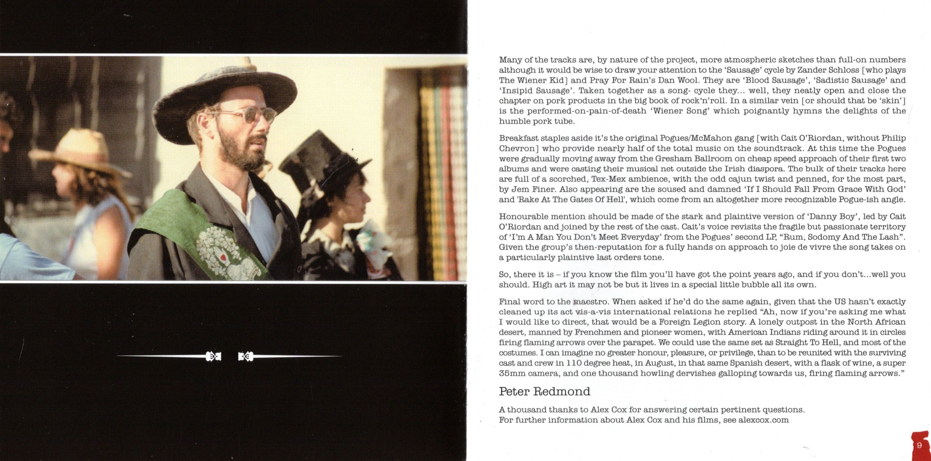 Either Alex got really lucky or he should be given a measure of credit for knowing the strengths and weaknesses of each of the mules on his composing team. One might expect whining, tension and chaos among the creatives in such an arrangement, but I can recollect no such grumbling and the surprisingly cohesive end result can now be heard in its entirety on this 'official' soundtrack cobbled from the respective archives of the Pogues and Pray for Rain, as well as from the original Straight To Hell soundtrack CD.