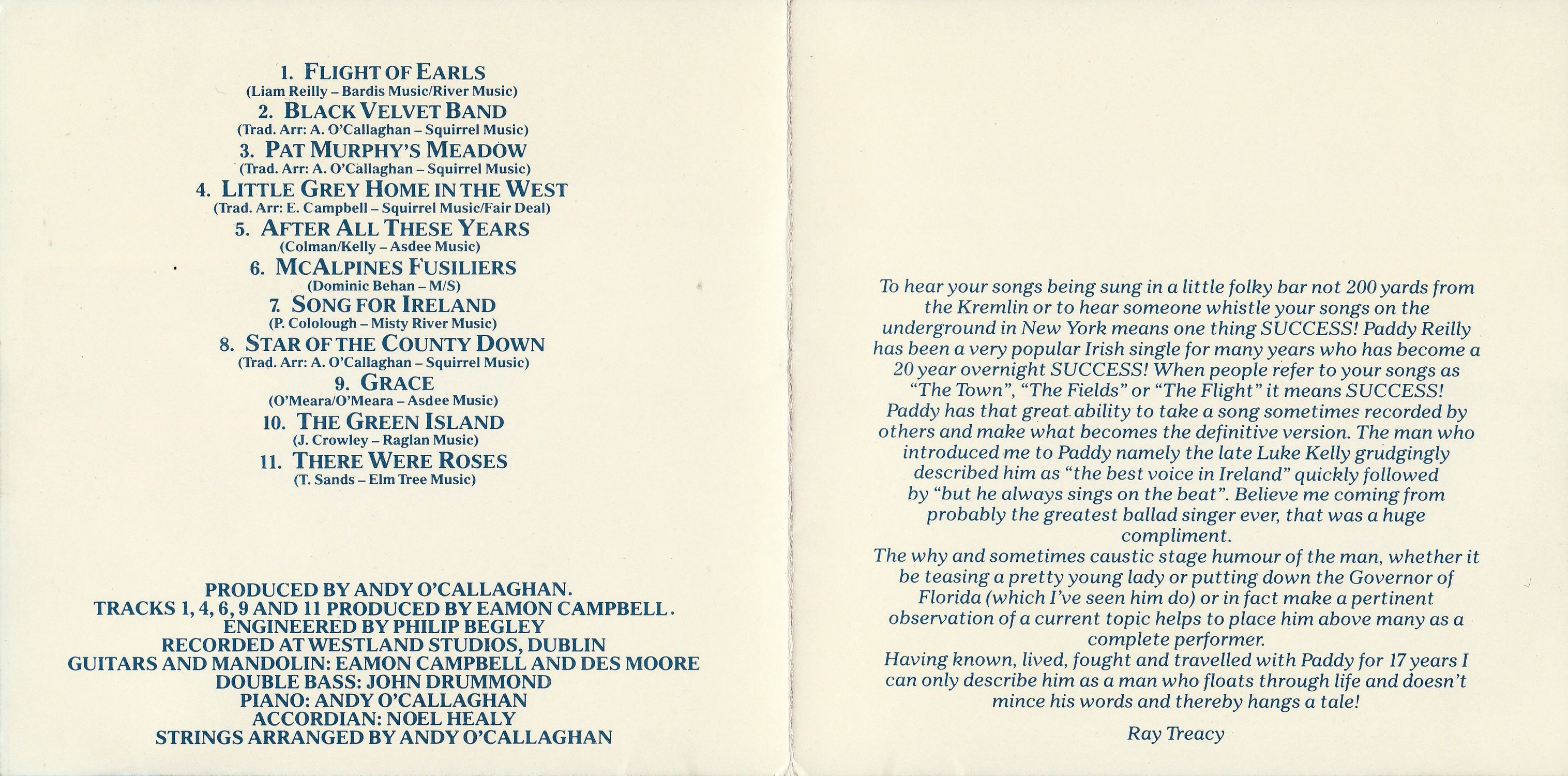 To hear your songs being sung in a little folky bar not 200 yards from the Kremlin or to hear someone whistle your songs on the underground in New York means one thing SUCCESS! Paddy Reilly has been a very popular Irish single for many years who has become a 20 year overnight SUCCESS! When people refer to your songs as "The Town", "The Fields" or "The Flight" it means SUCCESS! Paddy has that great, ability to take a song sometimes recorded by others and make what becomes the definitive version. The man who introduced me to Paddy namely the late Luke Kelly grudgingly described him as "the best voice in Ireland" quickly followed by "hut he always sings on the beat". Believe me coming from probably the greatest ballad singer ever, that was a huge compliment.