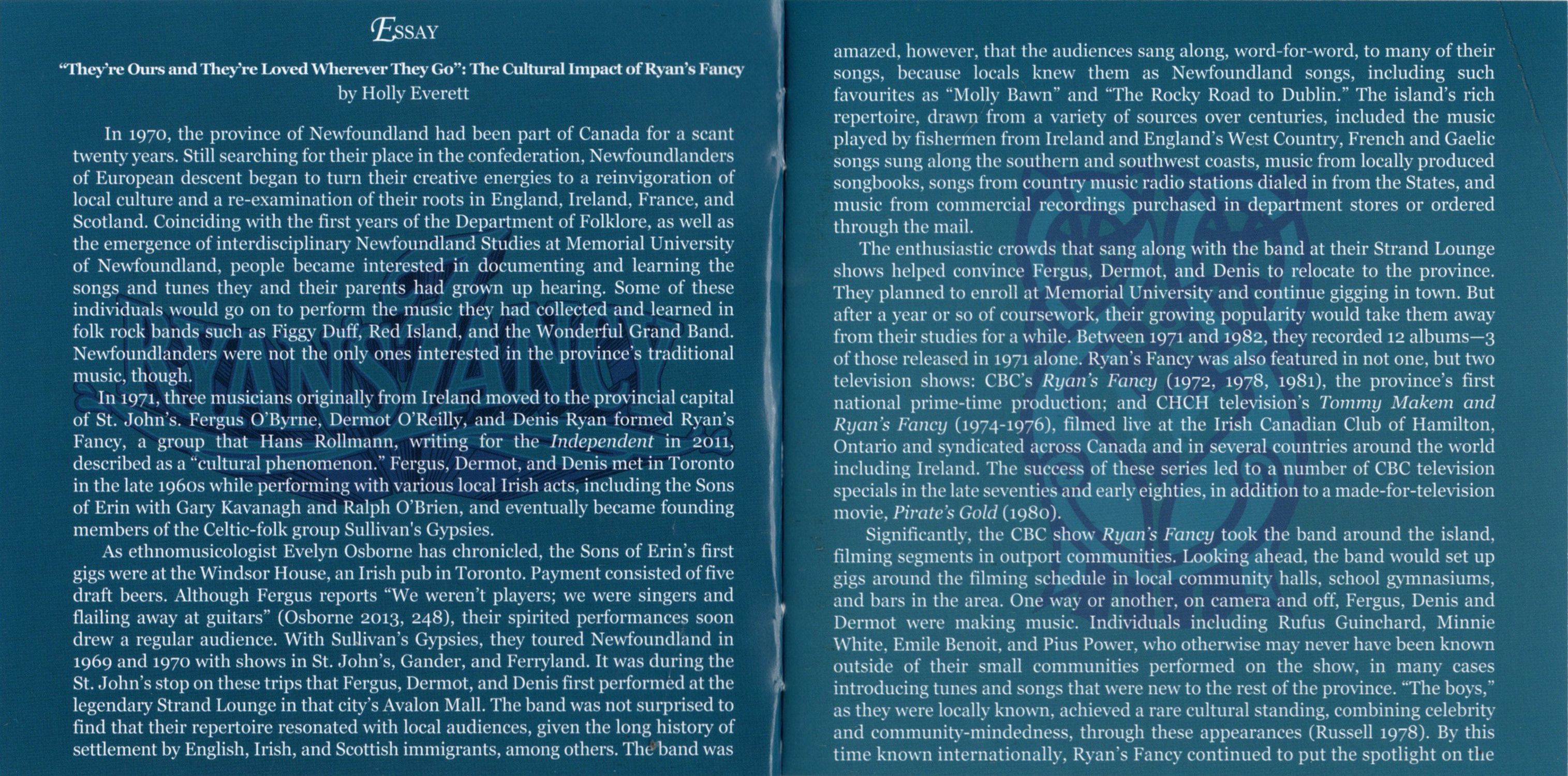 The members of Ryan's Fancy made their mark in many cultural contexts in the course of their careers, from their early lives in Ireland, through their individual journeys to Canada, to their move to Newfoundland as a trio, and beyond. They were Irish musicians that many Newfoundlanders saw as committed to both the roots of the province's musical traditions and their evolution in the context of uneasy Confederation. Enthusiastically embraced by locals, the band members were passionate proponents of folk revival in general, and the Newfoundland folk revival in particular, as the province struggled to find its footing within a country that at times seemed to scorn it. Two decades into a new, contested national identity, Newfoundlanders yearned for the surety of tradition and at the same time struggled with it in reaching toward the mainland mainstream. Both on stage and off, Ryan's Fancy showcased local music traditions in a way that resonated with both insiders and outsiders in their deft embodiment of the Newfoundland musical ethos that beseeches everyone to join in. Come all ye!