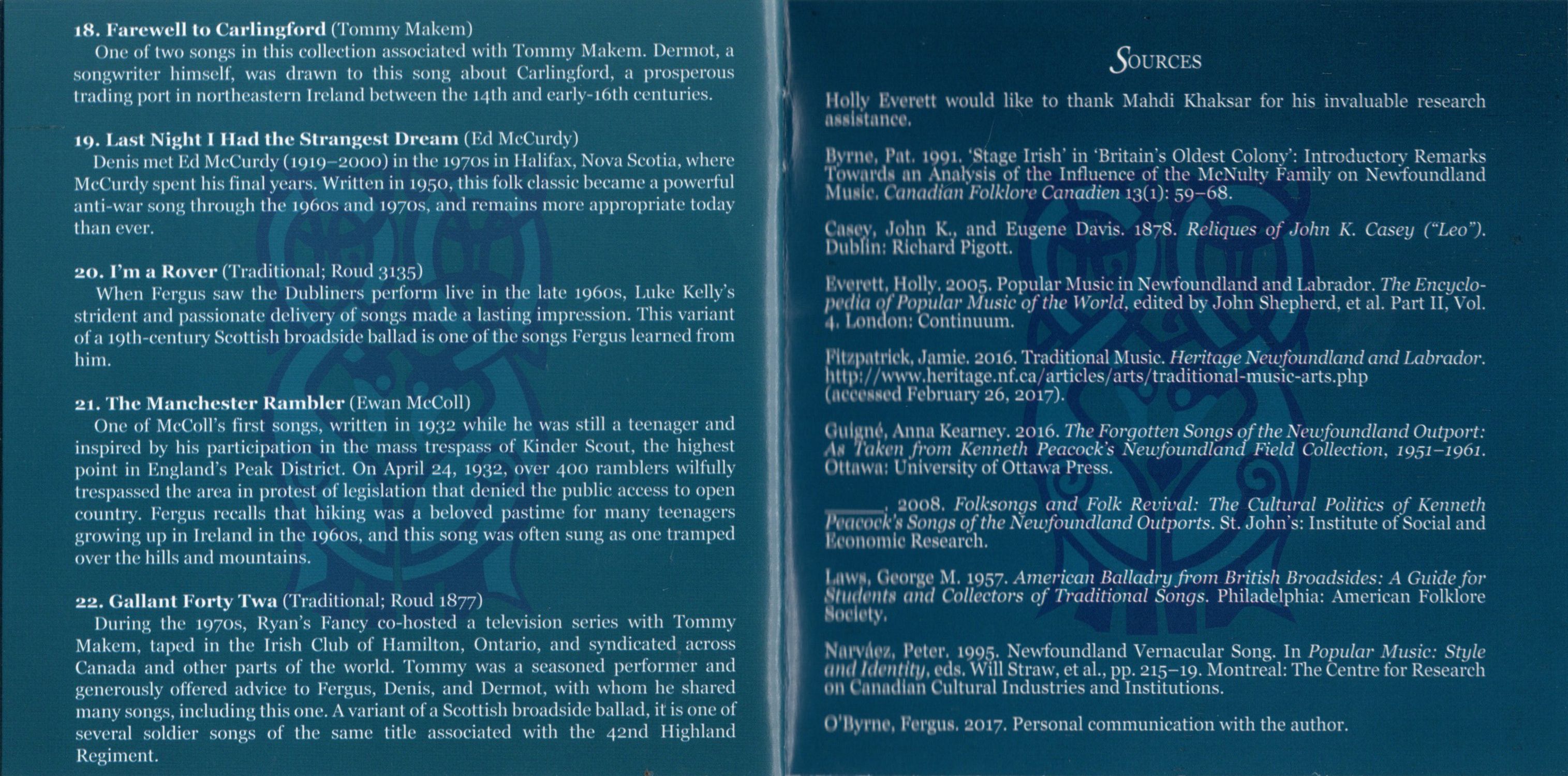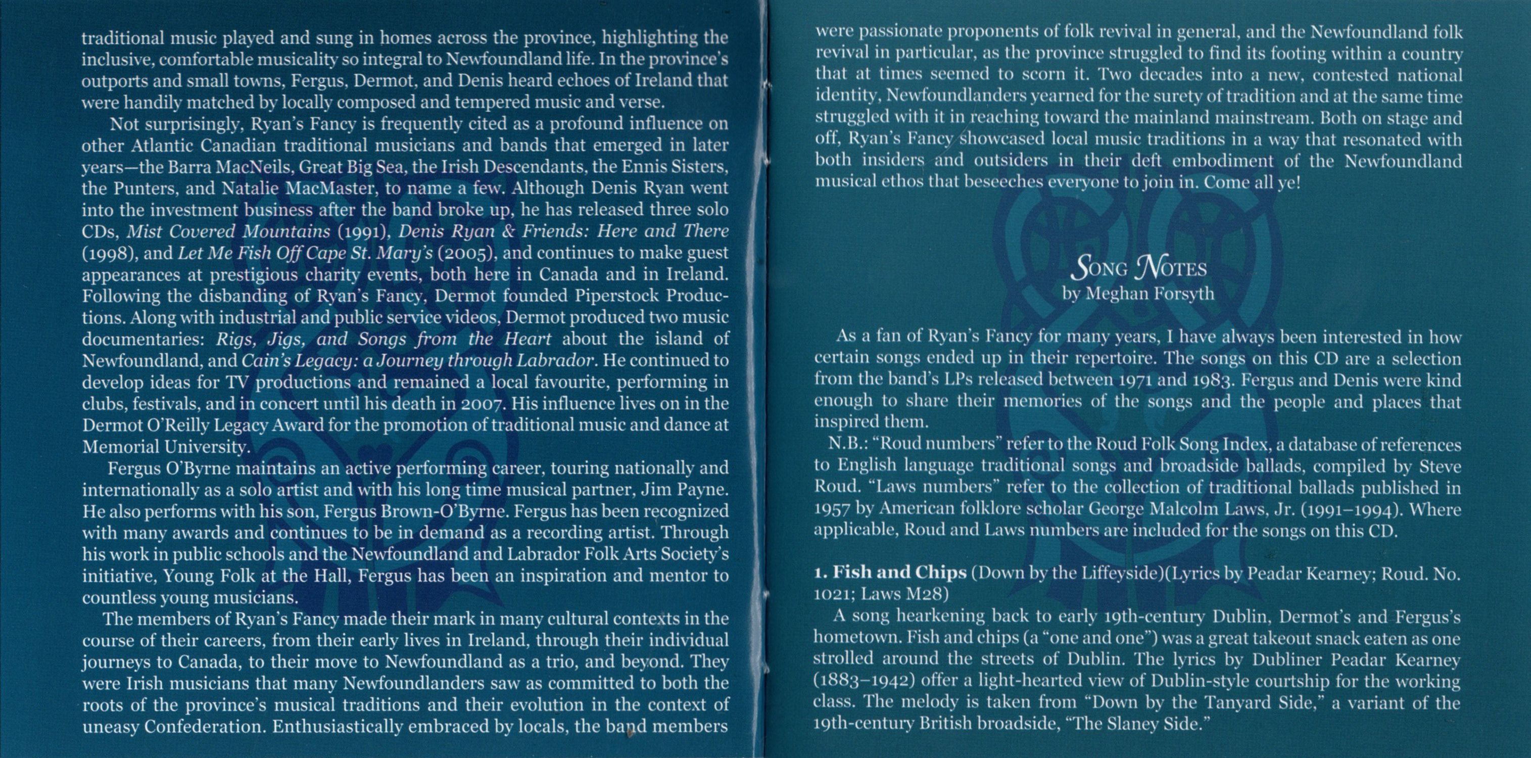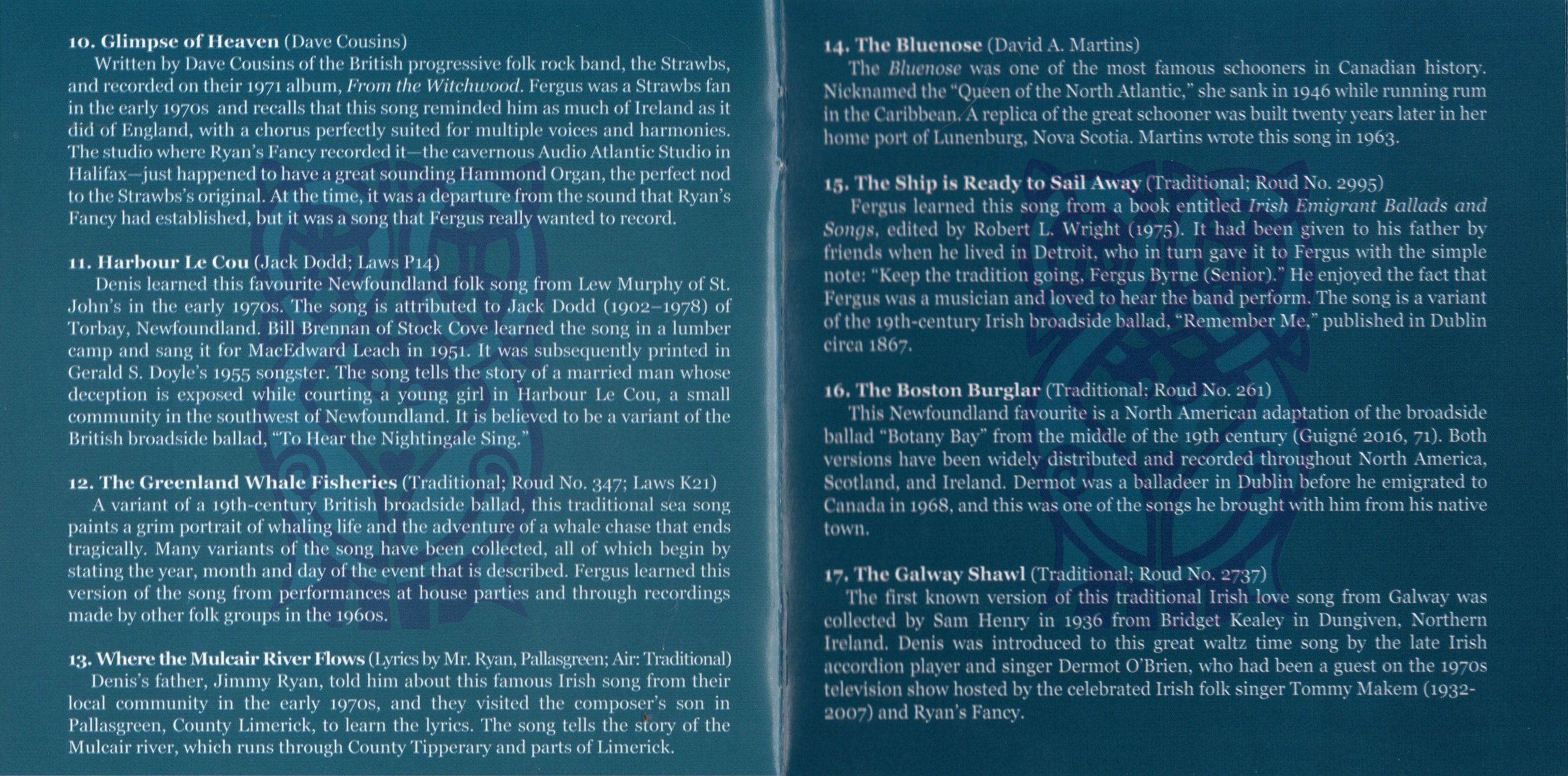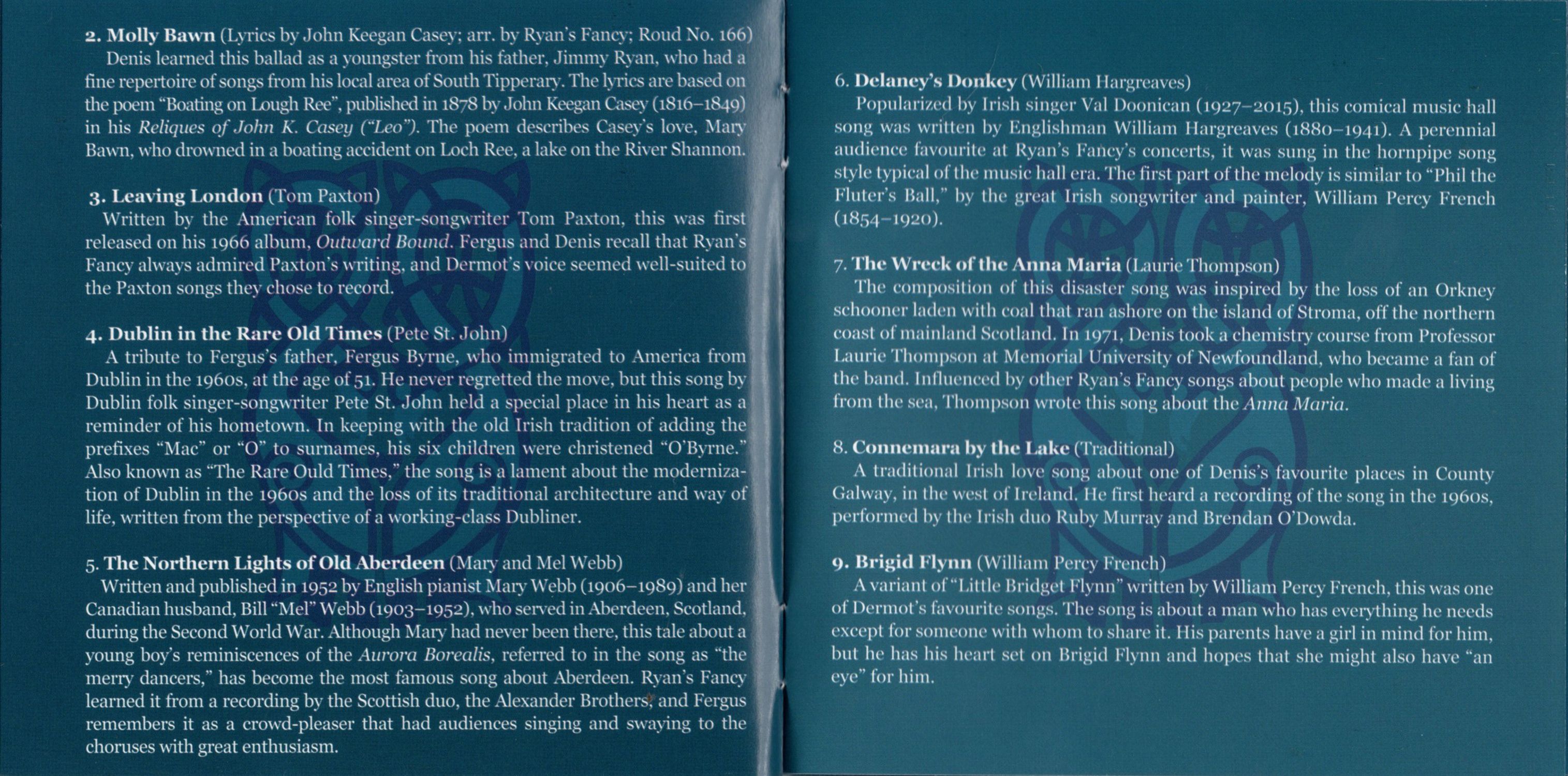 As a fan of Ryan's Fancy for many years, I have always been interested in how certain songs ended up in their repertoire. The songs on this CD are a selection from the band's LPs released between 1971 and 1983. Fergus and Denis were kind enough to share their memories of the songs and the people and places that inspired them.