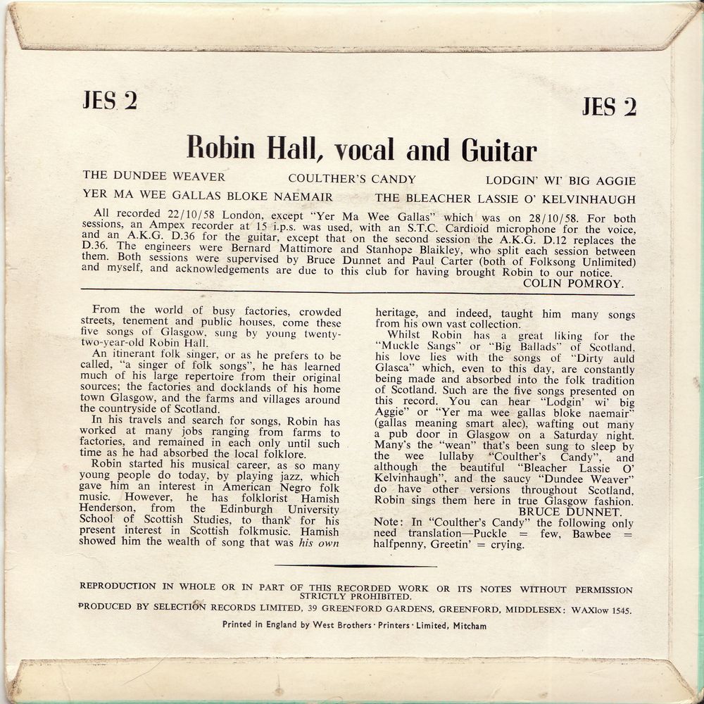 Robin started his musical career, as so many young people do today, by playing jazz, which gave him an interest in American Negro folk music. However, he has folklorist Hamish Henderson, from the Edinburgh University School of Scottish Studies, to thank" for his present interest in Scottish folk music. Hamish showed him the wealth of song that was his own heritage, and indeed, taught him many songs from his own vast collection.