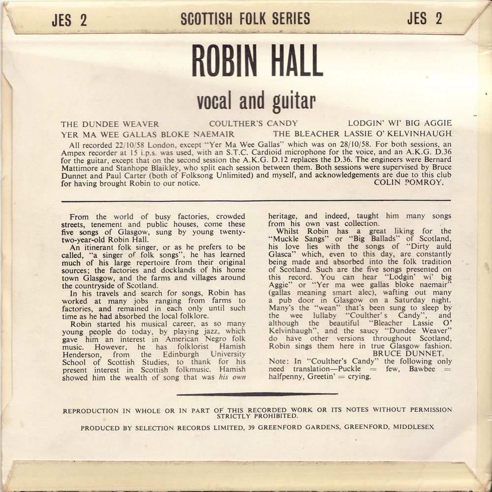 Robin started his musical career, as so many young people do today, by playing jazz, which gave him an interest in American Negro folk music. However, he has folklorist Hamish Henderson, from the Edinburgh University School of Scottish Studies, to thank" for his present interest in Scottish folk music. Hamish showed him the wealth of song that was his own heritage, and indeed, taught him many songs from his own vast collection.