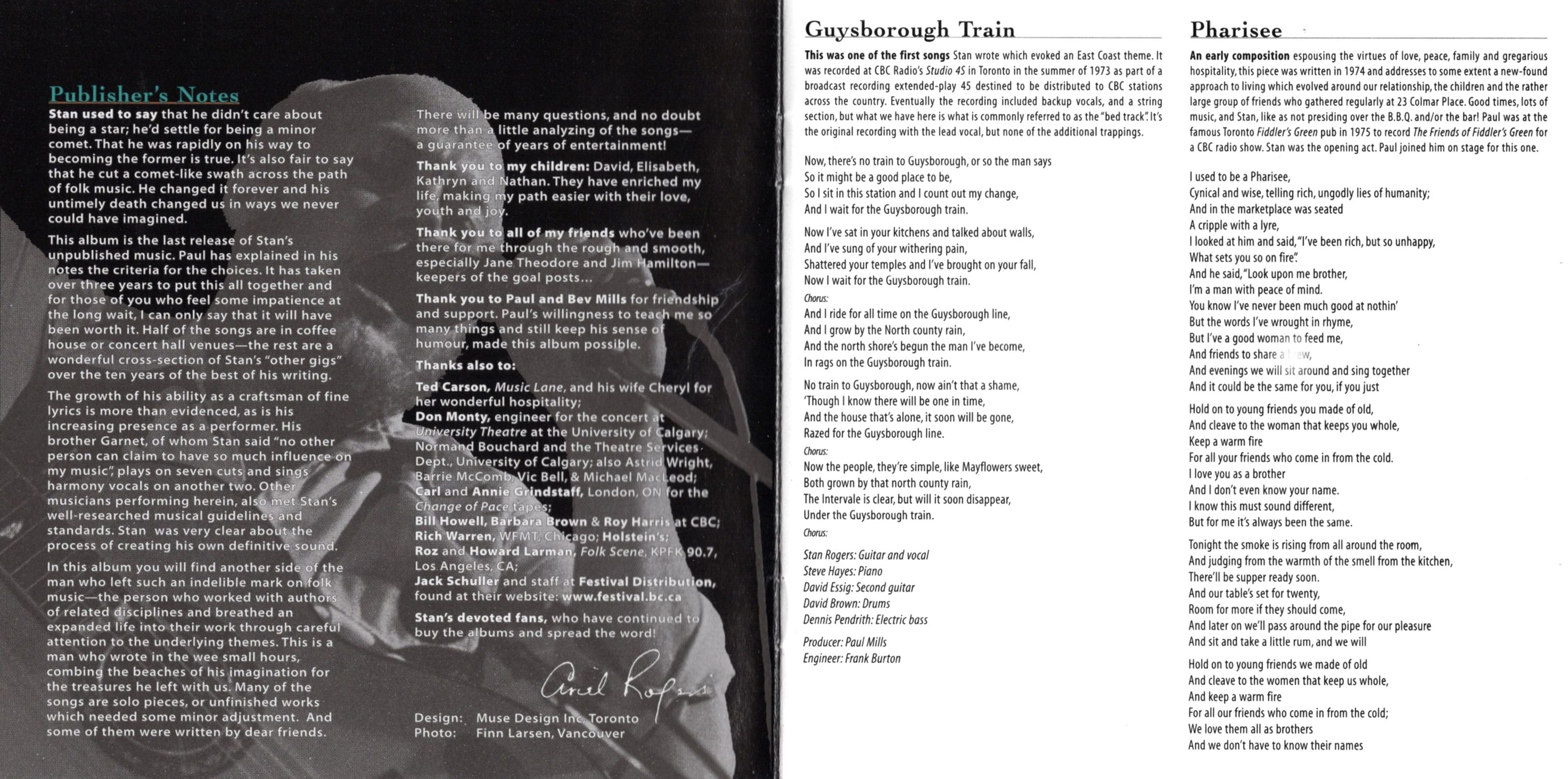This album is the last release of Stan's unpublished music. Paul has explained in his notes the criteria for the choices. It has taken over three years to put this all together and for those of you who feel some impatience at the long wait, I can only say that it will have been worth it. Half of the songs are in coffee house or concert hall venues—the rest are a wonderful cross-section of Stan's "other gigs" over the ten years of the best of his writing.