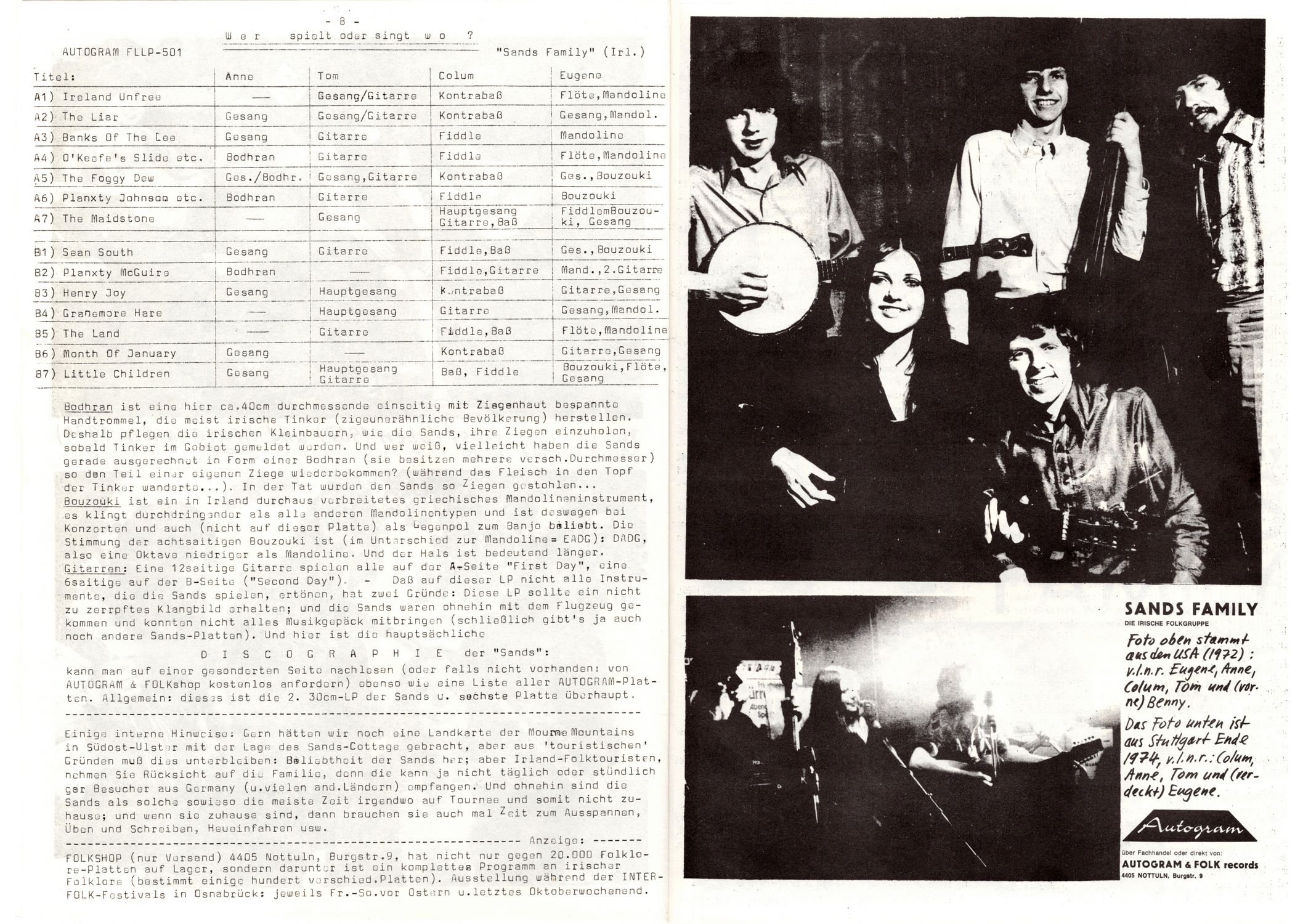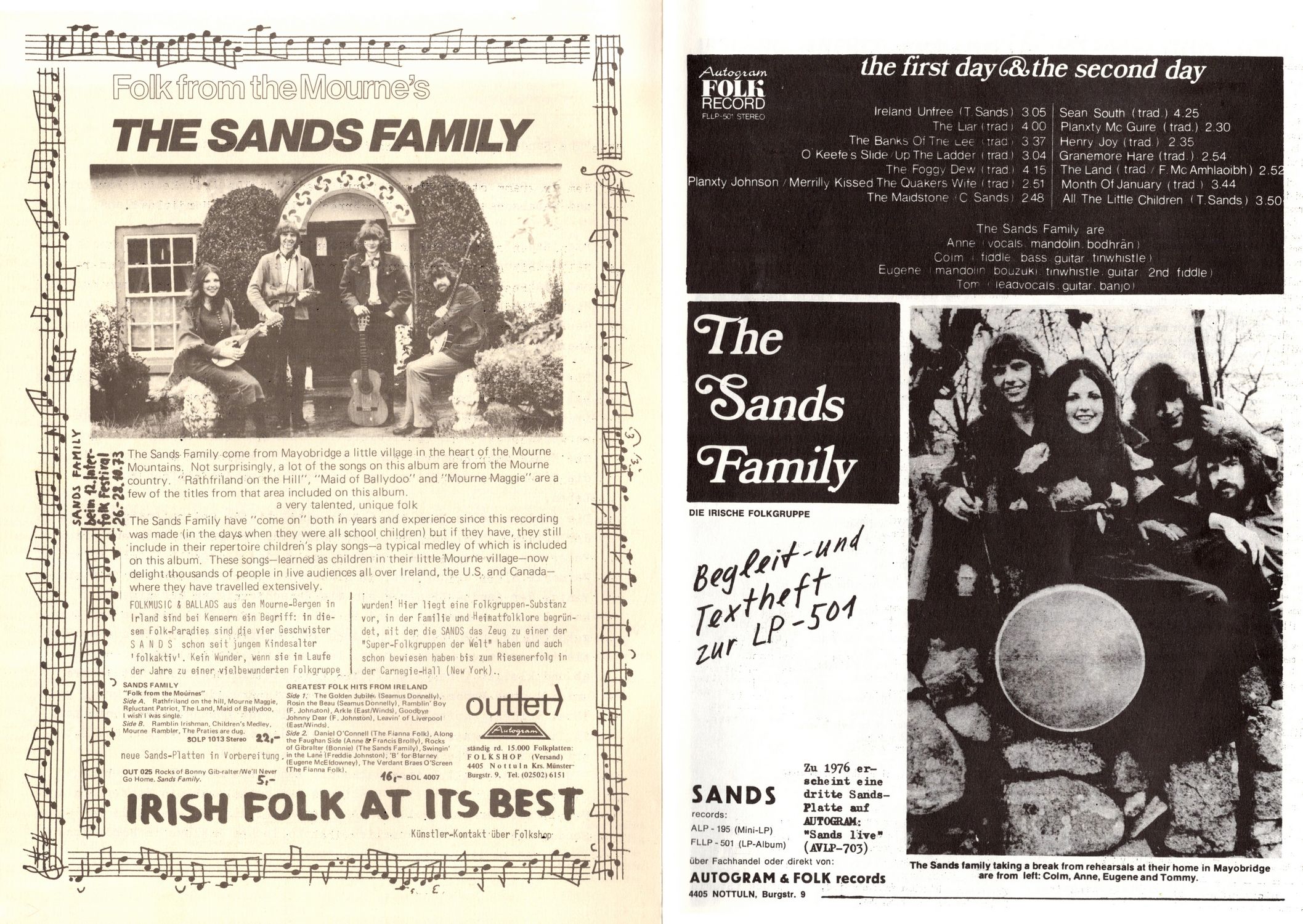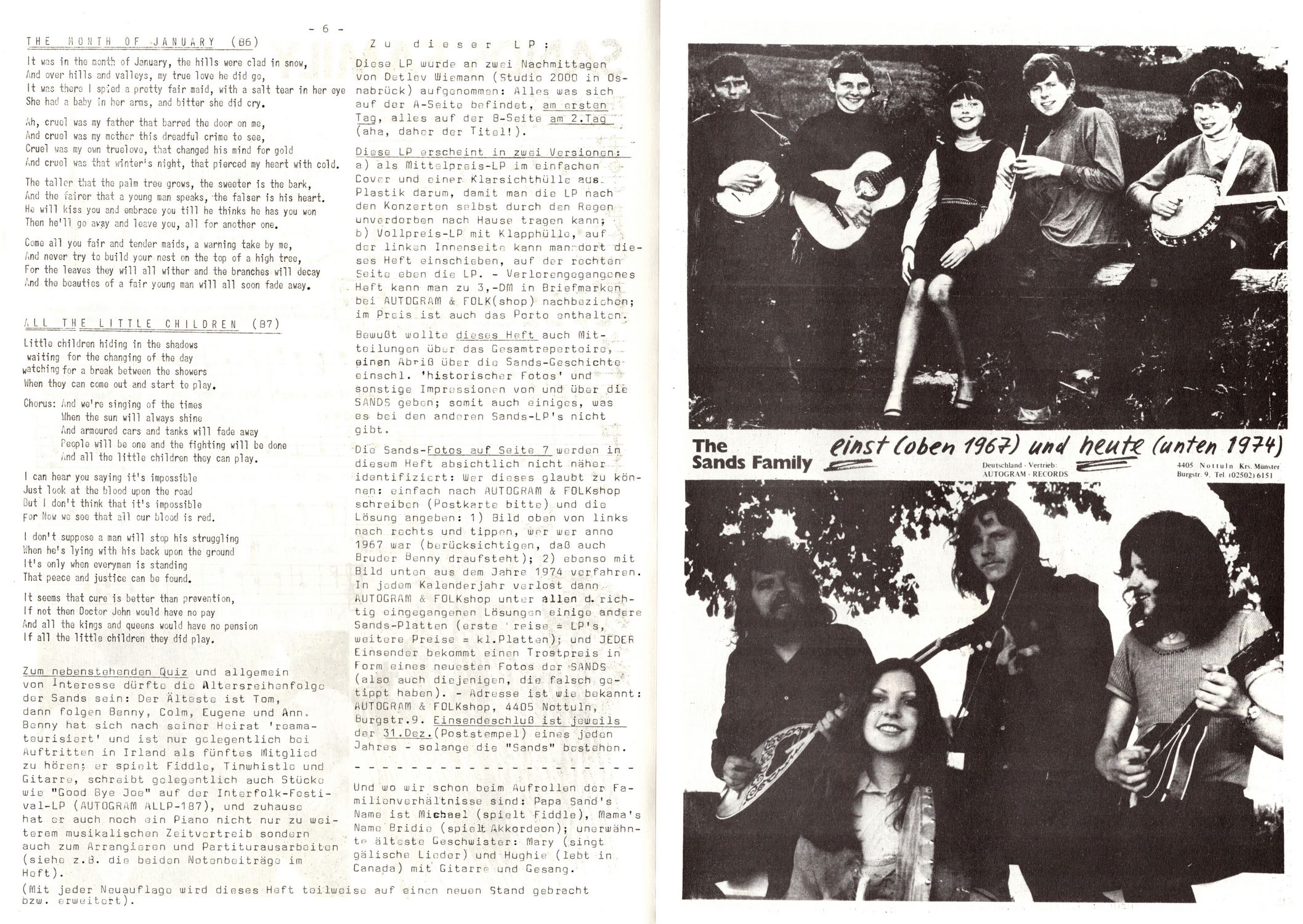 Benny 'reamateurized' after his marriage and can only occasionally be heard at gigs in Ireland as the fifth member: he plays fiddle, tin whistle and guitar, and occasionally writes pieces like "Good Bye Joe" on the Interfolk Festival LP (AUTOGRAM ALLP-187), and at home he also has a piano not only for further musical pastime but also for arranging and working out the score (see, for example, the two sheet music contributions in the booklet). ' And while we're on the subject of family relationships: Papa Sand's name is Michael (plays the fiddle), Mama's name is Bridie (plays the accordion); unmentioned eldest siblings: Mary (sings Gaelic songs) and Hughie (lives in Canada) with guitar and vocals.